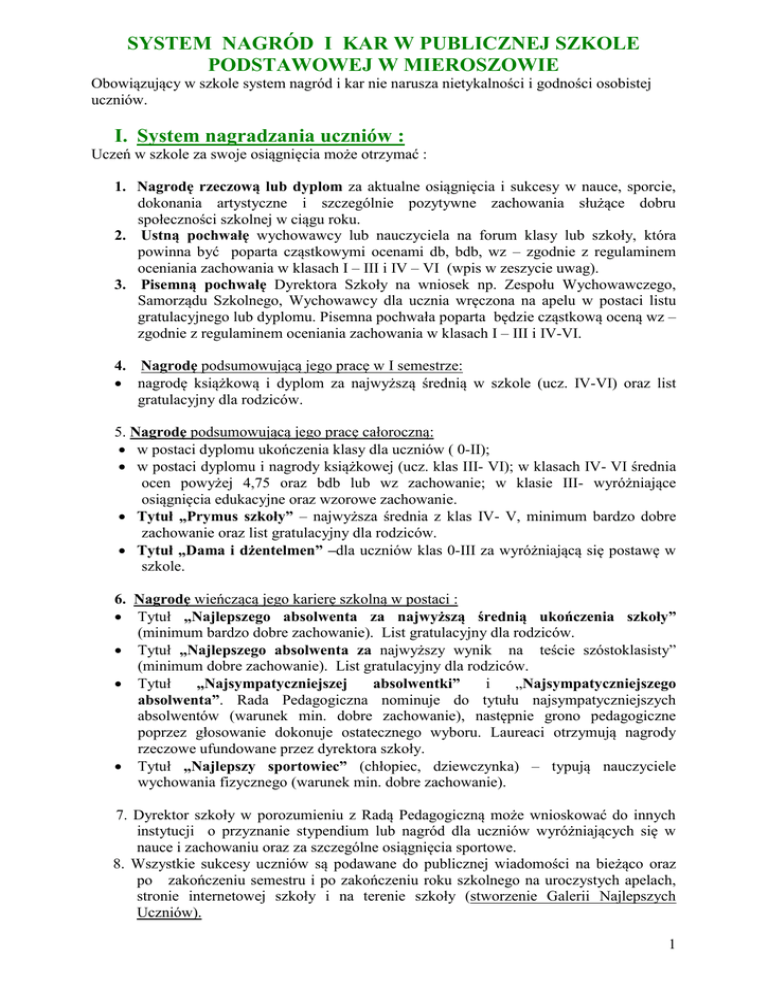 SYSTEM NAGRÓD I KAR W PUBLICZNEJ SZKOLE PODSTAWOWEJ W MIEROSZOWIE Obowiązujący w szkole system nagród i kar nie narusza nietykalności i godności osobistej uczniów. I. System nagradzania uczniów : Uczeń w szkole za swoje osiągnięcia może otrzymać : 1. Nagrodę rzeczową lub dyplom za aktualne osiągnięcia i sukcesy w nauce, sporcie, dokonania artystyczne i szczególnie pozytywne zachowania służące dobru społeczności szkolnej w ciągu roku. 2. Ustną pochwałę wychowawcy lub nauczyciela na forum klasy lub szkoły, która powinna być poparta cząstkowymi ocenami db, bdb, wz – zgodnie z regulaminem oceniania zachowania w klasach I – III i IV – VI (wpis w zeszycie uwag). 3. Pisemną pochwałę Dyrektora Szkoły na wniosek np. Zespołu Wychowawczego, Samorządu Szkolnego, Wychowawcy dla ucznia wręczona na apelu w postaci listu gratulacyjnego lub dyplomu. Pisemna pochwała poparta będzie cząstkową oceną wz – zgodnie z regulaminem oceniania zachowania w klasach I – III i IV-VI. 4. Nagrodę podsumowującą jego pracę w I semestrze: nagrodę książkową i dyplom za najwyższą średnią w szkole (ucz. IV-VI) oraz list gratulacyjny dla rodziców. 5. Nagrodę podsumowującą jego pracę całoroczną: w postaci dyplomu ukończenia klasy dla uczniów ( 0-II); w postaci dyplomu i nagrody książkowej (ucz. klas III- VI); w klasach IV- VI średnia ocen powyżej 4,75 oraz bdb lub wz zachowanie; w klasie III- wyróżniające osiągnięcia edukacyjne oraz wzorowe zachowanie. Tytuł „Prymus szkoły” – najwyższa średnia z klas IV- V, minimum bardzo dobre zachowanie oraz list gratulacyjny dla rodziców. Tytuł „Dama i dżentelmen” –dla uczniów klas 0-III za wyróżniającą się postawę w szkole. 6. Nagrodę wieńczącą jego karierę szkolną w postaci : Tytuł „Najlepszego absolwenta za najwyższą średnią ukończenia szkoły” (minimum bardzo dobre zachowanie). List gratulacyjny dla rodziców. Tytuł „Najlepszego absolwenta za najwyższy wynik na teście szóstoklasisty” (minimum dobre zachowanie). List gratulacyjny dla rodziców. Tytuł „Najsympatyczniejszej absolwentki” i „Najsympatyczniejszego absolwenta”. Rada Pedagogiczna nominuje do tytułu najsympatyczniejszych absolwentów (warunek min. dobre zachowanie), następnie grono pedagogiczne poprzez głosowanie dokonuje ostatecznego wyboru. Laureaci otrzymują nagrody rzeczowe ufundowane przez dyrektora szkoły. Tytuł „Najlepszy sportowiec” (chłopiec, dziewczynka) – typują nauczyciele wychowania fizycznego (warunek min. dobre zachowanie). 7. Dyrektor szkoły w porozumieniu z Radą Pedagogiczną może wnioskować do innych instytucji o przyznanie stypendium lub nagród dla uczniów wyróżniających się w nauce i zachowaniu oraz za szczególne osiągnięcia sportowe. 8. Wszystkie sukcesy uczniów są podawane do publicznej wiadomości na bieżąco oraz po zakończeniu semestru i po zakończeniu roku szkolnego na uroczystych apelach, stronie internetowej szkoły i na terenie szkoły (stworzenie Galerii Najlepszych Uczniów). 1 II. System interwencji wychowawczych: 1. Upomnienie ustne przez wychowawcę, nauczyciela lub pracownika szkoły, którzy zaobserwowali naruszenie ogólnie przyjętych norm. O takiej rozmowie informowany jest wychowawca. 2. Upomnienie pisemne: wpis nauczyciela do zeszytu przedmiotowego ucznia z żądaniem podpisu uwagi przez rodzica lub opiekuna prawnego; wpis nauczyciela do zeszytu uwag. 3. Po trzykrotnym upomnieniu pisemnym (uwagi), wychowawca klasy: w klasach I – III informuje rodzica lub opiekuna prawnego o kolejnych możliwościach ukarania ucznia, jeżeli nie nastąpi poprawa; w klasach IV – VI wpisuje w dzienniku lekcyjnym cząstkową ocenę nieodpowiednią z datą i uzasadnieniem. O wpisie cząstkowej oceny nieodpowiedniej wychowawca informuje rodzica lub opiekuna prawnego, podpis rodzica. 4. Rozmowa na szczeblu: wychowawca, rodzic, uczeń po drugiej ocenie nieodpowiedniej. Przeciwdziałanie złemu zachowaniu i wybór odpowiedniego środka zaradczego. 5. Komisja Wychowawcza, skład: wychowawca, pedagog, dyrektor, rodzic lub opiekun prawny. Uczeń (klasy IV-VI) otrzymuje cząstkową ocenę naganną (data i uzasadnienie) wpisaną przez wychowawcę w dzienniku (uwagi). Podczas komisji podpisuje się z uczniem KONTRAKT. Określa się czas do realizowania postanowień kontraktu. 6. Nagana Dyrektora Szkoły udzielana na wniosek Zespołu Wychowawczego, gdy wyżej wymienione zabiegi wychowawcze nie przyniosły skutku w postaci zmiany zachowania ucznia. Wezwany rodzic lub opiekun prawny poświadcza własnoręcznym podpisem odbiór Nagany Zespołu Wychowawczego udzielonej uczniowi. Nagana Zespołu Wychowawczego skutkuje oceną nieodpowiednią semestralną lub roczną. W klasach I – III uczeń może otrzymać Naganę Zespołu Wychowawczego, jeżeli w/w środki zaradcze nie wpłynęły na poprawę zachowania ucznia. 7. Przeniesienie do równoległej klasy na wniosek wychowawcy klasy lub Zespołu Wychowawczego skierowany do dyrektora z poinformowaniem rodziców lub opiekunów prawnych. Kara może być cofnięta w wyniku poprawy zachowania ucznia. Decyzja Rady Pedagogicznej. W szczególnych okolicznościach odstępuje się od zachowania gradacji kar. W takich przypadkach procedury następują od 5 punktu . 8. Doniesienie na policję w każdym przypadku naruszenia przez ucznia przepisów prawa : z powodu zachowań agresywnych wobec innych uczniów lub nauczycieli, z powodu zakłócania porządku pracy szkoły, z powodu narażenia na uszczerbek zdrowia lub nawet zagrożenia życia innych osób, z powodu różnorakich zachowań świadczących o demoralizacji, z powodu innych czynów karalnych, o których informację powezmą pracownicy szkoły. Uwaga! Za umyślne spowodowanie szkody materialnej w szkole np.: zniszczenie mienia odpowiadają rodzice (prawni opiekunowie) ucznia. Wychowawca powinien doprowadzić do zrekompensowania strat w formie pieniężnej lub