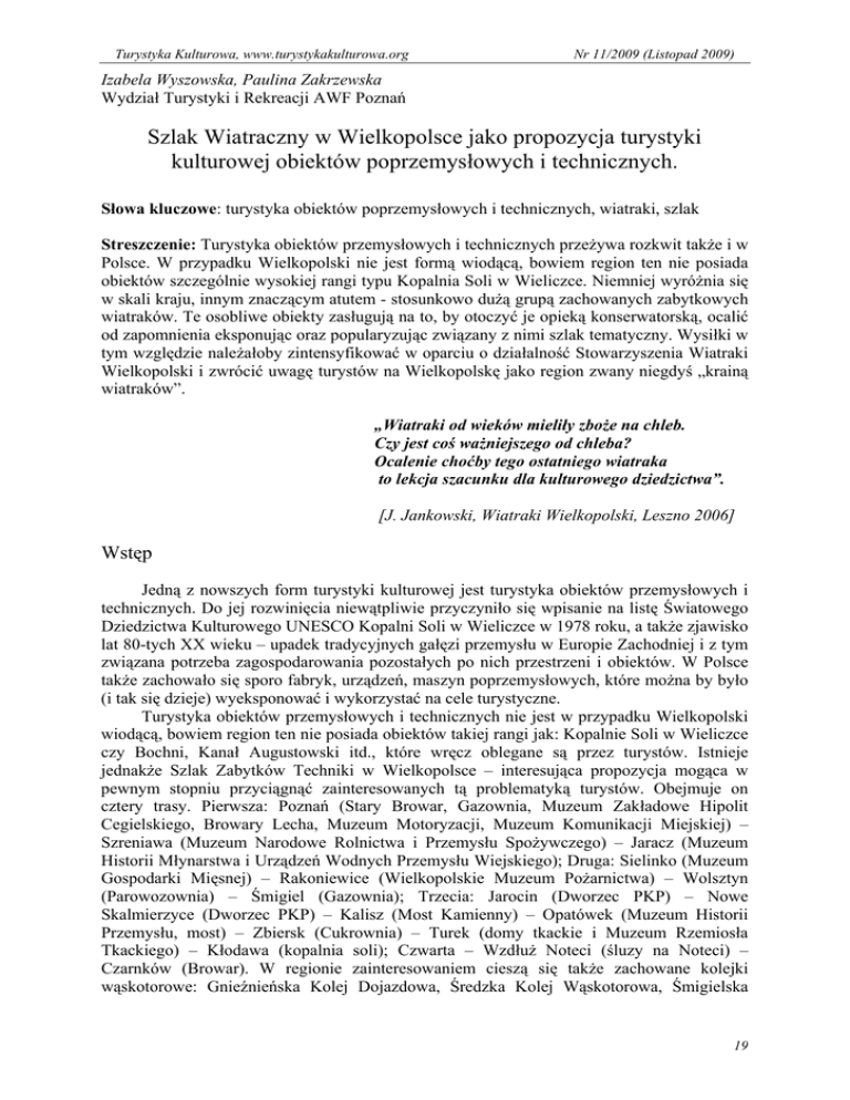 Turystyka Kulturowa, www.turystykakulturowa.org Nr 11/2009 (Listopad 2009) Izabela Wyszowska, Paulina Zakrzewska Wydział Turystyki i Rekreacji AWF Poznań Szlak Wiatraczny w Wielkopolsce jako propozycja turystyki kulturowej obiektów poprzemysłowych i technicznych. Słowa kluczowe: turystyka obiektów poprzemysłowych i technicznych, wiatraki, szlak Streszczenie: Turystyka obiektów przemysłowych i technicznych przeżywa rozkwit także i w Polsce. W przypadku Wielkopolski nie jest formą wiodącą, bowiem region ten nie posiada obiektów szczególnie wysokiej rangi typu Kopalnia Soli w Wieliczce. Niemniej wyróżnia się w skali kraju, innym znaczącym atutem - stosunkowo dużą grupą zachowanych zabytkowych wiatraków. Te osobliwe obiekty zasługują na to, by otoczyć je opieką konserwatorską, ocalić od zapomnienia eksponując oraz popularyzując związany z nimi szlak tematyczny. Wysiłki w tym względzie należałoby zintensyfikować w oparciu o działalność Stowarzyszenia Wiatraki Wielkopolski i zwrócić uwagę turystów na Wielkopolskę jako region zwany niegdyś „krainą wiatraków”. „Wiatraki od wieków mieliły zboże na chleb. Czy jest coś ważniejszego od chleba? Ocalenie choćby tego ostatniego wiatraka to lekcja szacunku dla kulturowego dziedzictwa”. [J. Jankowski, Wiatraki Wielkopolski, Leszno 2006] Wstęp Jedną z nowszych form turystyki kulturowej jest turystyka obiektów przemysłowych i technicznych. Do jej rozwinięcia niewątpliwie przyczyniło się wpisanie na listę Światowego Dziedzictwa Kulturowego UNESCO Kopalni Soli w Wieliczce w 1978 roku, a także zjawisko lat 80-tych XX wieku – upadek tradycyjnych gałęzi przemysłu w Europie Zachodniej i z tym związana potrzeba zagospodarowania pozostałych po nich przestrzeni i obiektów. W Polsce także zachowało się sporo fabryk, urządzeń, maszyn poprzemysłowych, które można by było (i tak się dzieje) wyeksponować i wykorzystać na cele turystyczne. Turystyka obiektów przemysłowych i technicznych nie jest w przypadku Wielkopolski wiodącą, bowiem region ten nie posiada obiektów takiej rangi jak: Kopalnie Soli w Wieliczce czy Bochni, Kanał Augustowski itd., które wręcz oblegane są przez turystów. Istnieje jednakże Szlak Zabytków Techniki w Wielkopolsce – interesująca propozycja mogąca w pewnym stopniu przyciągnąć zainteresowanych tą problematyką turystów. Obejmuje on cztery trasy. Pierwsza: Poznań (Stary Browar, Gazownia, Muzeum Zakładowe Hipolit Cegielskiego, Browary Lecha, Muzeum Motoryzacji, Muzeum Komunikacji Miejskiej) – Szreniawa (Muzeum Narodowe Rolnictwa i Przemysłu Spożywczego) – Jaracz (Muzeum Historii Młynarstwa i Urządzeń Wodnych Przemysłu Wiejskiego); Druga: Sielinko (Muzeum Gospodarki Mięsnej) – Rakoniewice (Wielkopolskie Muzeum Pożarnictwa) – Wolsztyn (Parowozownia) – Śmigiel (Gazownia); Trzecia: Jarocin (Dworzec PKP) – Nowe Skalmierzyce (Dworzec PKP) – Kalisz (Most Kamienny) – Opatówek (Muzeum Historii Przemysłu, most) – Zbiersk (Cukrownia) – Turek (domy tkackie i Muzeum Rzemiosła Tkackiego) – Kłodawa (kopalnia soli); Czwarta – Wzdłuż Noteci (śluzy na Noteci) – Czarnków (Browar). W regionie zainteresowaniem cieszą się także zachowane kolejki wąskotorowe: Gnieźnieńska Kolej Dojazdowa, Średzka Kolej Wąskotorowa, Śmigielska 19 Turystyka Kulturowa, www.turystykakulturowa.org Nr 11/2009 (Listopad 2009) Kolej Dojazdowa i Wyrzyska Kolej Powiatowa oraz Muzeum Kolei Wąskotorowych w Wenecji [Szlak Zabytków Techniki, 2007]. Wielkopolska ma dodatkowo swój szczególny atut, wyróżnia ją w skali kraju, stosunkowo duża grupa zachowanych zabytkowych wiatraków (w przeszłości nawet Wielkopolskę nazywano z tego powodu „krainą wiatraków”). Te osobliwe obiekty w ramach turystyki kulturowej trzeba ocalić od zapomnienia i zniszczenia eksponując oraz popularyzując związany z nimi szlak tematyczny. Zainteresowanie takim produktem turystycznym szerszego grona odbiorców zwłaszcza tych, którzy rozumieją potrzebę ochrony rodzimego dziedzictwa kulturowego może wpłynąć pozytywnie na działania zmierzające w kierunku poprawy kondycji tych niezwykłych, milczących „skrzydlatych olbrzymów” świadków naszej wielowiekowej tradycji, przypominających, że nasz region był niegdyś zagłębiem młynarstwa europejskiego wyprzedzając w tym względzie nawet Holandię i Niemcy! O tym, że wiatraki stanowią niezwykle malowniczy akcent w krajobrazie, wiedzieli dobrze twórcy malarstwa holenderskiego, umieszczając chętnie, jako pierwsi w dziejach malarstwa europejskiego, na swych obrazach, wiatraki będące swoistym symbolem Holandii. Natomiast do literatury światowej na trwałe wiatraki trafiły dzięki Cervantesowi i jego Don Kichotowi. W Polsce nie spotka się już czynnego wiatraka ale, te które istnieją – swą majestatyczną sylwetką silnie działają na wyobraźnię i w sposób szczególny przenoszą nas do przeszłości ucząc szacunku dla pracy i osiągnięć minionych pokoleń… Fot. 1. Jacob van Ruisdael, Młyn w Wijk bis Duurstede, źródło: www. cudaswiata.wordpress.com Z kart historii… Młyn wynaleziony został w Iranie w okresie VII-VIII w. n.e., a dokładnie w Seistanie – krainie o częściowo pustynnym krajobrazie. Można nazwać ją więc kolebką wiatraka. Mieszkańcy tego obszaru byli skazani na walkę z żywiołem w postaci niosących tumany piasku wiatrów grożących polom uprawnym. Musieli więc je okiełznać „[…] chcąc przemieścić piasek tak aby nie zasypywał ich pól, odgradzają wydmy piaszczyste nieco od nich wyższą konstrukcją, podobną do płotu z drewna i cierni. W dolnej części owego ogrodzenia pozostawiają otwór, przez który dostaje się do środka wiatr i zdmuchuje górną warstwę piasku niby trąba powietrzna. Piasek unosi się w górę i spada na ziemię w znacznej odległości, w miejscu gdzie nie czyni szkody” 32 . Ujarzmiwszy żywioł 