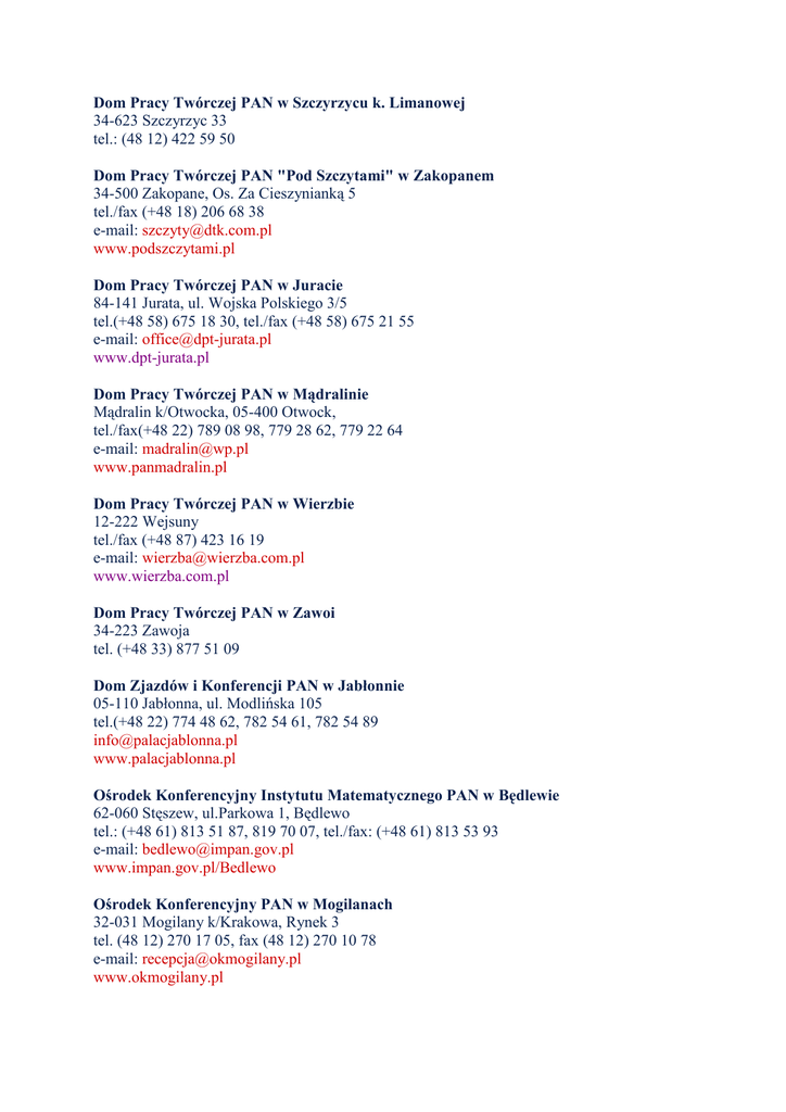 Dom Pracy Twórczej PAN w Szczyrzycu k. Limanowej 34-623 Szczyrzyc 33 tel.: (48 12) 422 59 50 Dom Pracy Twórczej PAN "Pod Szczytami" w Zakopanem 34-500 Zakopane, Os. Za Cieszynianką 5 tel./fax (+48 18) 206 68 38 e-mail: [email protected] www.podszczytami.pl Dom Pracy Twórczej PAN w Juracie 84-141 Jurata, ul. Wojska Polskiego 3/5 tel.(+48 58) 675 18 30, tel./fax (+48 58) 675 21 55 e-mail: [email protected] www.dpt-jurata.pl Dom Pracy Twórczej PAN w Mądralinie Mądralin k/Otwocka, 05-400 Otwock, tel./fax(+48 22) 789 08 98, 779 28 62, 779 22 64 e-mail: [email protected] www.panmadralin.pl Dom Pracy Twórczej PAN w Wierzbie 12-222 Wejsuny tel./fax (+48 87) 423 16 19 e-mail: [email protected] www.wierzba.com.pl Dom Pracy Twórczej PAN w Zawoi 34-223 Zawoja tel. (+48 33) 877 51 09 Dom Zjazdów i Konferencji PAN w Jabłonnie 05-110 Jabłonna, ul. Modlińska 105 tel.(+48 22) 774 48 62, 782 54 61, 782 54 89 [email protected] www.palacjablonna.pl Ośrodek Konferencyjny Instytutu Matematycznego PAN w Będlewie 62-060 Stęszew, ul.Parkowa 1, Będlewo tel.: (+48 61) 813 51 87, 819 70 07, tel./fax: (+48 61) 813 53 93 e-mail: [email protected] www.impan.gov.pl/Bedlewo Ośrodek Konferencyjny PAN w Mogilanach 32-031 Mogilany k/Krakowa, Rynek 3 tel. (48 12) 270 17 05, fax (48 12) 270 10 78 e-mail: [email protected] www.okmogilany.pl Ośrodek Pracy Twórczej Instytutu Budownictwa Wodnego PAN nad Wdzydzami czerwiec-wrzesień: Czarlina-Skoczkowo 2, 83-406 Wąglikowice k. Kościerzyny, woj. pomorskie DOM PRACY TWÓRCZEJ PAN W SWINOUJSCIU - INNE OBIEKTY http://www.dptswinoujscie.pan.pl/obiekty/index.htm 1 z 2 2011-04-08 09:59 tel: 0-601 69 38 04 pozostały okres: IBW PAN, 80-953 Gdańsk, ul. Kościerska 7 tel: (48 58) 552 20 11, fax: (48 58) 552 42 11 www.ibwpan.gda.pl/osrodek e-mail: [email protected] Ośrodek Wypoczynkowy PAN w Szymbarku 38-311 Szymbark 430 tel.: (48 18) 351 31 93, 351 32 06 e-mail: [email protected] Dom Młodego Naukowca PAN 00-378 Warszawa, ul. S. Jaracza 12 tel. (48 22) 625-28-69