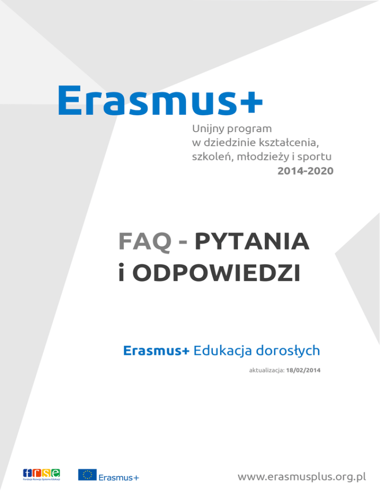 FAQ - PYTANIA i ODPOWIEDZI Erasmus+ Edukacja dorosłych aktualizacja: 18/02/2014 FAQ – Erasmus+ Edukacja dorosłych Pytania ogólne 1. JAKA MOŻE BYĆ MAKSYMALNA WYSOKOŚĆ WNIOSKOWANEGO BUDŻETU? 2. JAK DŁUGO MOŻE TRWAĆ PROJEKT? 3. GDZIE MOŻNA ZNALEŹĆ KALKULATOR ODLEGŁOŚCI (DISTANCE CALCULATOR) NIEZBĘDNY DO WYLICZANIA ODLEGŁOŚCI MIĘDZY KRAJEM WYJAZDU I KRAJEM PRZYJAZDU, KTÓRY JEST NIEZBĘDNY M.IN. DO OKREŚLANIA WYSOKOŚCI DOFINANSOWANIA KOSZTÓW PODRÓŻY? 4. JAKIE OPROGRAMOWANIE JEST NIEZBĘDNE DO WYPEŁNIENIA FORMULARZY WYMAGANYCH PRZY REJESTRACJI ORGANIZACJI WNIOSKODAWCY W PORTALU UŻYTKOWNIKA URF (STATUS PRAWNY ORGANIZACJI, DANE BANKOWE)? Pytania dotyczące akcji 1. 5. JAKA JEST ZASADNICZA ZMIANA W ZASADACH DOFINANSOWANIA MOBILNOŚCI KADRY EDUKACJI DOROSŁYCH W STOSUNKU DO TEGO, CO OBOWIĄZYWAŁO W PROGRAMIE GRUNDTVG? 6. ILE WNIOSKÓW MOŻE ZŁOŻYĆ JEDNA INSTYTUCJA W AKCJI 1.? CZY BĘDĄ JAKIEŚ OGRANICZENIA? 7. CZY W KONKURSIE 2014 DLA AKCJI 1. W SEKTORZE EDUKACJA DOROSŁYCH WYMAGANE JEST POSIADANIE LISTÓW INTENCYJNYCH OD ORGANIZACJI PARTNERSKICH? 8. CZY MOŻLIWE JEST UZYSKANIE DOFINANSOWANIA MOBILNOŚCI W AKCJI 1., KTÓRA ZAKŁADA WYJAZD KADRY EDUKACYJNEJ NA KURS SZKOLENIOWY? 9. CZY W PRZYPADKU MOBILNOŚCI KADRY W AKCJI 1. TRWAJĄCYCH 2 DNI DOPUSZCZALNA JEST ORGANIZACJA PROGRAMU ROZPOCZYNAJĄCEGO SIĘ JEDNEGO DNIA PO POŁUDNIU I KOŃCZĄCEGO KOLEJNEGO DNIA PO OBIEDZIE? 10. CZY MOBILNOŚĆ KADRY EDUKACJI DOROSŁYCH W RAMACH AKCJI 1. MOŻE BYĆ ZAPLANOWANA JAKO WIZYTA PRZYGOTOWAWCZA, PODCZAS KTÓREJ PARTNERZY DOKONAJĄ USTALEŃ ZWIĄZANYCH ZE ZŁOŻENIEM WNIOSKU W KOLEJNYM KONKURSIE? 11. W AKCJI 1 PRZEWIDZIANA JEST MOŻLIWOŚĆ UDZIAŁU KADRY W KURSACH ZAGRANICZNYCH. CZY ISTNIEJE EUROPEJSKI KATALOG KURSÓW – TAK JAK TO MIAŁO MIEJSCE W POPRZEDNIM PROGRAMIE „UCZENIE SIĘ PRZEZ CAŁE ŻYCIE” – GRUNDTVIG? 12. CZY OSOBY ZAJMUJĄCE SIĘ EDUKACJĄ DOROSŁYCH NIEZATRUDNIONE NA UMOWĘ O PRACĘ W ORGANIZACJI WNIOSKUJĄCEJ MOGĄ KORZYSTAĆ Z UDZIAŁU W SZKOLENIACH ZAGRANICZNYCH W RAMACH AKCJI 1.? 13. W ZESZŁYM ROKU KORZYSTAŁAM Z DOFINANSOWANIA UDZIAŁU W KURSIE Z PROGRAMU „UCZENIE SIĘ PRZEZ CAŁE ŻYCIE” – GRUNDTVIG (POPRZEDZAJĄCEGO PROGRAM ERASMUS+ EDUKACJA DOROSŁYCH. CZY W TYM ROKU MOGĘ PONOWNIE UBIEGAĆ SIĘ O DOFINANSOWANIE UDZIAŁU W SZKOLENIU ZAGRANICZNYM? 14. CZY MOŻNA UZYSKAĆ DOFINANSOWANIE OPŁATY ZA SZKOLENIE W AKCJI 1.? 15. CO TO JEST KONSORCJUM W AKCJI 1.? 16. CZY W AKCJI 1. MOŻNA UBIEGAĆ SIĘ O DOFINANSOWANIE Z TYTUŁU PROWADZONEJ DZIAŁALNOŚCI GOSPODARCZEJ? Narodowa Agencja Programu Erasmus+ Dokument dostępny na: www.erasmusplus.org.pl/faq Strona 2 17. CZY ORGANIZACJE O ZŁOŻONEJ STRUKTURZE MOGĄ ZŁOŻYĆ WIĘCEJ NIŻ JEDEN PROJEKT MOBILNOŚCI (AKCJA 1.) W DANYM ROKU KONKURSOWYM DO SEKTORA EDUKACJA DOROSŁYCH? FAQ – Erasmus+ Edukacja dorosłych Pytania dotyczące akcji 2. 18. CZY DLA AKCJI 2 W PORTALU UŻYTKOWNIKA URF REJESTRACJI MUSI DOKONAĆ WYŁĄCZNIE ORGANIZACJA WNIOSKUJĄCA (KOORDYNATOR) CZY RÓWNIEŻ ORGANIZACJE PARTNERSKIE? 19. JAK ZNALEŹĆ PARTNERA DO PROJEKTU W AKCJI 2? 20. JAKIE ROLE PEŁNIĄ PARTNERZY W PROJEKCIE W AKCJI 2? CZY JEDNA Z ORGANIZACJI PODEJMUJE SIĘ ROLI KOORDYNATORA? 21. CZY ORGANIZACJA WNIOSKUJĄCA MUSI POSIADAĆ UPOWAŻNIENIA LUB INNE DOKUMENTY POTWIERDZAJĄCE UDZIAŁ PARTNERÓW W PROJEKCIE W AKCJI 2? Narodowa Agencja Programu Erasmus+ Dokument dostępny na: www.erasmusplus.org.pl/faq Strona 3 Kolejne pytania otrzymane od wnioskodawców będą sukcesywnie dodawane. FAQ – Erasmus+ Edukacja dorosłych PYTANIA OGÓLNE 1. Jaka może być maksymalna wysokość wnioskowanego budżetu? Dla akcji 1 („Mobilność kadry”), procedury wnioskowania w ramach konkursu 2014 nie nakładają na wnioskodawcę ograniczeń odnośnie wysokości całkowitego dofinansowania projektu. Określono jedynie limity dotyczące poszczególnych kategorii budżetowych. Dla akcji 2 („Partnerstwa strategiczne”) maksymalna wysokość dofinansowania wynosi 150 000 EUR na 1 rok realizacji projektu, zatem dla najdłuższego, trzyletniego projektu maksymalna kwota dofinansowania wynosić może 450 EUR. 2. Jak długo może trwać projekt? W przypadku akcji 1. („Mobilność kadry”) projekt może trwać rok lub dwa lata. W przypadku akcji 2. („Partnerstwa strategiczne”) projekt może trwać dwa lub trzy lata, przy czym w trakcie realizowania projektu dwuletniego można wnioskować o jego przedłużenie o pół roku, jednak bez możliwości otrzymania dodatkowego dofinansowania. 3. Gdzie można znaleźć Kalkulator odległości (Distance calculator) niezbędny do wyliczania odległości między krajem wyjazdu i krajem przyjazdu, który jest niezbędny m.in. do określania wysokości dofinansowania kosztów podróży? Kalkulator jest dostępny pod adresem: http://ec.europa.eu/programmes/erasmus-plus/tools/distance_en.htm. 4. Jakie oprogramowanie jest niezbędne do wypełnienia formularzy wymaganych przy rejestracji organizacji wnioskodawcy w Portalu Użytkownika URF (status prawny organizacji, dane bankowe)? Zgodnie z informacją na stronie Komisji Europejskiej http://ec.europa.eu/budget/contracts_grants/info_contracts/legal_entities/legal_e ntities_en.cfm wymagane oprogramowanie to Adobe Acrobat w wersji 8. Najnowsza wersja jest do pobrania ze strony: http://www.adobe.com (zakładka Download) – oprogramowanie jest darmowe. Narodowa Agencja Programu Erasmus+ Dokument dostępny na: www.erasmusplus.org.pl/faq Strona 4 Pytania dotyczące akcji 1. FAQ – Erasmus+ Edukacja dorosłych 5. Jaka jest zasadnicza zmiana w zasadach dofinansowania mobilności kadry edukacji dorosłych w stosunku do tego, co obowiązywało w programie Grundtvg? Przede wszystkim w programie Erasmus+ o dofinansowanie nie ubiega się osoba – przedstawiciel organizacji edukacji dorosłych, lecz organizacja edukacji dorosłych planująca rozwój swoich pracowników zgodnie z ich potrzebami rozwojowymi i w odniesieniu do opisanego we wniosku Europejskiego Planu