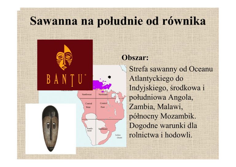 Sawanna na południe od równika Obszar: Strefa sawanny od Oceanu Atlantyckiego do Indyjskiego, środkowa i południowa Angola, Zambia, Malawi, północny Mozambik. Dogodne warunki dla rolnictwa i hodowli. Sawanna na południe od równika Języki Rodzina niger-kordofańska – języki bantu, m.in., makonde, bemba, lozi, czokwe Sawanna na południe od równika Ludy Bantu • Bantu wschodni, m.in.: Makonde (1,3 mln), Ngoni (300 tys.), Malawi (6 mln), Tonga • Bantu centralni, m.in.: Bemba (2,3 mln) – jęz. ponadetniczny w zagłębiach Zambii i Konga • Bantu pd.-wsch., m.in.: Lozi • Bantu zachodni, m.in.: Czokwe (1,2 mln), Mbundu (3 mln), Owambo (1 mln) • Bantu Konga Sawanna na południe od równika Charakterystyka regionu: • silnie przeobrażona kultura i struktura etniczna • obszar względnie spokojny, późno „odkryty” przez Europejczyków • wiele regionów rozwiniętych gospodarczo (Zambia) • zaczątki tożsamości narodowej • wojny domowe (Angola, Mozambik)