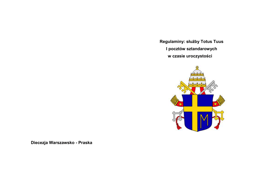 Regulaminy: służby Totus Tuus I pocztów sztandarowych w czasie uroczystości Diecezja Warszawsko - Praska Regulamin służby Totus Tuus Diecezji Warszawsko-Praskiej w czasie uroczystości kościelnych. 1. Ubiór: - ciemny garnitur, biała koszula, krawat nie jaskrawy stosowny do ubioru, pantofle wygodne stosowne do garnituru. IDENTYFIKATORY Obowiązujące w Diecezji Warszawsko – Praskiej 1. Dowódca 2. Dowódca zadania 2. Pozycja: - swobodna, ręce wolne od jakichkolwiek pakunków, bez parasoli. 3. Służba w Kościele: a. gdy pełnimy służbę; - posiadamy identyfikator i furażerkę, którą zdejmujemy na Przeistoczenie i na Komunię, trzymamy ją na lewej ręce emblematem do góry nie klękamy jesteśmy gotowi do niesienia pomocy, b. gdy jesteśmy gośćmi na uroczystości; - posiadamy tylko identyfikator i zachowujemy się jak wszyscy wierni w Kościele c. przyjmowanie Komunii Świętej; Gdy pełnimy służbę; - w pozycji stojącej z furażerką na zgiętej ręce emblematem skierowany do góry, gdy jesteśmy gośćmi na uroczystości; - zachowujemy się jak wszyscy wierni w Kościele 4. Służba w czasie uroczystości na terenach otwartych: - posiadamy identyfikator i furażerkę, którą zdejmujemy na Przeistoczenie i na Komunię, trzymamy ją na lewej ręce emblematem do góry nie klękamy jesteśmy gotowi do niesienia pomocy, ręce wolne od jakichkolwiek pakunków, 2. Dowódca parafialny 4. Porządkowy bez parasoli, może być przewieszona przez ramię aktówka, w której może znajdować się płaszcz od deszczu, napój, kanapka. Regulamin Pocztu Sztandarowego Totus Tuus Diecezji Warszawsko-Praskiej w czasie pełnienia służby. OZNAKOWANIE KOŚCIELNEJ SŁUŻBY PORZĄDKOWEJ TOTUS TUUS Wygląd furażerki z herbem JPII 1. Ubiór w czasie pełnienia służby: - ciemny garnitur, biała koszula, krawat nie jaskrawy stosowny do ubioru, białe rękawiczki, szarfę, furażerkę K. S. P. , pantofle wygodne stosowne do garnituru, identyfikator Totus Tuus przypięty po lewej stronie lub wiszący na smyczy, w lewej klapie marynarki może być znaczek Totus Tuus, zabrania się noszenia innych oznakowań przypiętych czy wiszących. Uwaga: Gdy temperatura jest powyżej 25O C i gdy wszystkie poczty sztandarowe mają białą koszulę z krótkim rękawem, spodnie w kolorze ciemnym, białe rękawiczki, szarfę, furażerkę K. S. P. , ten strój może być dopuszczony . 2. Przemarsz pocztów sztandarowych: - zbieramy się w miejscu wskazanym przez dowódcę pocztu skąd następuje wymarsz na uroczystość, - sztandar niesiemy na prawym ramieniu. 3. Ustawienie pocztów sztandarowych: - miejsce wskazuje dowódca; - drzewce trzymamy w prawym ręku przy prawej nodze po zewnętrznej stronie; - nie żegnamy się, nie klaszczemy; Prawidłowe ułożenie Nieprawidłowe ułożenie - znak pokoju przekazujemy przez skłon głową; - wszelkie zmiany ustawienia pocztów dokonują się w postawie swobodnej. 4. 5. Pochylanie sztandarów: Dowódca pocztów sztandarowych daje znak wychodząc przed sztandar Diecezjalny; - drzewce trzymamy w powietrzu, - pierwszy sztandar pochylamy na wprost ołtarza, pozostałe sztandary przemiennie raz w prawo następny w lewo (sztandary które stały przy ławkach z prawej strony pochylają w lewo, te które stały przy ławkach z lewej strony pochylają w prawo). Uwaga: gdy stoimy bokiem do ołtarza sztandary pochylamy skosem w kierunku ołtarza Pochylanie sztandarów na dany znak przez dowódcę następuje w czasie: - gdy wchodzimy do Świątyni pochylamy sztandary przed Tabernakulum; - Przeistoczenia; - Komunii Świętej, - odsłonięcia i zasłonięcia obrazu; - gdy grany jest hymn państwowy, grana i śpiewana Bogu Rodzica lub Boże coś Polskę - uroczyste błogosławieństwo – dowódca daje znak; - wychodząc z uroczystości wszystkie sztandary pochylają się, robią w tył zwrot, ostatni poczet sztandarowy jest pierwszym wychodzącym, gdy wychodzimy główny wejściem, gdy wychodzimy inaczej poczty sztandarowe wychodzą według kolejności ustawienia. Zawsze na czele pocztów stoi Dowódca pocztów sztandarowych. 6. Ustawienie pocztów sztandarowych w czasie Komunii: - gdy poczty sztandarowe stoją w nawie głównej, ustawiamy się w dwóch szeregach; - gdy stoimy w nawie bocznej ustawiamy się w jednym szeregu. 7. Przyjmowanie Komunii Świętej przez braci z pocztów sztandarowych: - pozycja stojąca; - furażerkę zdejmujemy i trzymamy ją na zgiętej lewej ręce emblematem skierowanym ku górze; - po przyjęciu Komunii Świętej krótkie dziękczynienie za otrzymane łaski, po dziękczynieniu zakładamy furażerkę. Uwaga: Po zakończeniu każdych uroczystości poczty sztandarowe są wyprowadzane przez dowódcę pocztów sztandarowych!!! Powrót pocztów sztandarowych następuje do miejsca wymarszu, tam sztandary są zwijane i udają się do miejsca przeznaczenia. Opracowała Rada Diecezjalna Zatwierdził: Ksiądz Prałat Zenon Majcher
