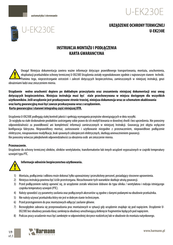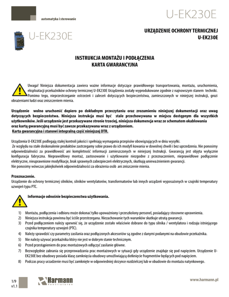 URZĄDZENIE OCHRONY TERMICZNEJ U-EK230E INSTRUKCJA MONTAŻU I PODŁĄCZENIA KARTA GWARANCYJNA Uwaga! Niniejsza dokumentacja zawiera ważne informacje dotyczące prawidłowego transportowania, montażu, uruchomienia, eksploatacji przekaźników ochrony termicznej U-EK230E Urządzenia zostały wyprodukowane zgodnie z najnowszym stanem techniki. Pomimo tego, nieprzestrzeganie ostrzeżeń i zaleceń dotyczących bezpieczeństwa, zamieszczonych w niniejszej instrukcji, grozi obrażeniami ludzi oraz zniszczeniem mienia. Urządzenie wolno uruchomić dopiero po dokładnym przeczytaniu oraz zrozumieniu niniejszej dokumentacji oraz uwag dotyczących bezpieczeństwa. Niniejsza instrukcja musi być stale przechowywana w miejscu dostępnym dla wszystkich użytkowników. Jeśli urządzenie jest przekazywane stronie trzeciej, niniejsza dokumencja wraz ze schematem okablowania oraz kartą gwarancyjną musi być zawsze przekazywana wraz z urządzeniem. Karta gwarancyjna i stanowi integralną część niniejszej DTR. Urządzenia U-EK230E podlegają stałej kontroli jakości i spełniają wymagania przepisów obowiązujących w dniu wysyłki. Ze względu na stałe doskonalenie produktów zastrzegamy sobie prawo do ich modyfi kowania w dowolnej chwili i bez uprzedzenia. Nie ponosimy odpowiedzialności za prawidłowość ani kompletność informacji zamieszczonych w niniejszej Instrukcji. Gwarancją jest objęta wyłącznie konfiguracja fabryczna. Nieprawidłowy montaż, zastosowanie i użytkowanie niezgodne z przeznaczeniem, nieprawidłowe podłączenie elektryczne, nieuprawnione modyfikacje, brak sprawnych zabezpieczeń elektrycznych, skutkują unieważnieniem gwarancji. Nie ponosimy wówczas jakiejkolwiek odpowiedzialności za obrażenia osób ani zniszczenie mienia. Przeznaczenie. Urządzenie do ochrony termicznej silników, silników wentylatorów, transformatorów lub innych urządzeń wyposażonych w czujniki temperatury uzwojeń typu PTC. Informacje odnośnie bezpieczenstwa użytkowania. 1) Montażu, podłączenia i odbioru może dokonać tylko upoważniony i przeszkolony personel, posiadający stosowne uprawnienia. 2) Niniejsza instrukcja powinna być ściśle przestrzegana. Niezachowanie tych warunków skutkuje utratą gwarancji. 3) Przed podłączeniem należy upewnić się, że urządzenie zostało właściwie dobrane do typu silnika / wentylatora i rodzaju istniejącego czujnika temperatury uzwojeń (PTC). 4) Należy sprawdzić czy parametry zasilania oraz podłączonych akcesoriów są zgodne z danymi podanymi na obudowie przekaźnika. 5) Nie należy używać przekaźnika który nie jest w dobrym stanie technicznym. 6) Przed przestąpieniem do prac montażowych odłączyć zasilanie główne. 7) Bezwzględnie zabrania się przeprowadzania prac montażowych w sytuacji gdy urządzenie znajduje się pod napięciem. Urządzenie UEK230E bez obudowy posiada klasę zamknięcia obudowy umożliwiającą dotknięcie fragmentów będących pod napięciem. 8) Podczas pracy urzadzenie musi być zamknięte w odpowiedniej skrzynce rozdzielczej lub w obudowie do montażu natynkowego. 1/9 v1.1 9) Należy zwrócić uwagę na właściwy dobór bezpieczników. 10) Bezpieczniki można jedynie wymieniać, a nie wolno ich naprawiać lub mostkować. Należy bezwzględnie stosować się do zaleceń w zakresie maksymalnej wartości bezpiecznika ( Dane techniczne). Stosować tylko bezpieczniki przewidziane w schemacie elektrycznym. 11) Brak napięcia należy skontrolować za pomocą dwuzaciskowego woltomierza. 12) Usterki stwierdzone w elektrycznych urządzeniach / modułach / środkach pracy należy niezwłocznie usunąć. Jeśli do momentu usunięcia usterki istnieje poważne zagrożenie, to nie wolno używać urządzenia / całej instalacji w tym wadliwym stanie. 13) Przekaznik U-EK230E może być użyty jedynie do celów określonych i potwierdzonych w zamówieniu. Użycie do innych celów, rozbieżnych z zamówieniem lub przekraczających parametry określone w niniejszej specyfikacji, bez pisemnej zgody dostawcy, będzie uznane za użytkowanie nieautoryzowane (niezgodne z instrukcją). 14) Oświadczamy, że nie ponosimy odpowiedzialnosci za uszkodzenia lub zniszczenia wynikłe z nieautoryzowanego (niezgodnego z instrukcją) użycia przekaźnika. Użytkownik ponosi pełna odpowiedzialność za skutki nieautoryzowanego (niezgodnego z instrukcja użytkowania) użycia przekaźnika. 15) Wszelkie reklamacje uszkodzeń spowodowanych użytkowaniem przekaźników U-EK230E niezgodnie z przeznaczeniem, nieprawidłowym montażem oraz podłączeniem niezgodnym ze schematem zostaną oddalone. Transport, Przechowywanie. 1) Wszystkie urządzenia są pakowane w fabrycznie i stosownie do wymagań wynikajacych z uzgodnionego sposobu transportu. 2) Urządzenia powinny byc transportowane w oryginalnych opakowaniach. 3) Należy pamietać o obowiazujących przepisach dotyczących prac przeładunkowych realizowanych ręcznie. 4) Należy zgłaszać wszelkie uszkodzenia opakowania sugerujace uszkodzenie zawartości. 5) Urządzenie U-EK230E powinno być przechowywane tylko w oryginalnym opakowaniu, w suchym miejscu zabezpieczonym przed zalaniem wodą i wpływem warunków atmosferycznych. 6) Nie należy przechowywać urządzenia w ekstremalnie niskich lub wysokich temperaturach. Opis funkcjonalny. Przekaźnik zasilany jest napięciem 1~230VAC (podtrzymanie pracy). Czujnik temperatury uzwojeń typu PTC musi być podłączony do przekaźnika do wejść T1, T2. Urządzenie w sposób ciągły kontroluje rezystancję podłączonych czujników temperatury uzwojeń silnika PTC. W stanie zimnym opór < 250 Ω w zależności od temperatury (w obwodzie czujnika < 1,5k Ω). Urządzenie jest włączone a styki 11 oraz 14 wbudowanego przekaźnika są zamknięte. Rezystancja czujnika zmienia się nagle na nominalną temperaturę pracy. Urządzenie wyłącza (ALARM) się przy rezystancji 3...4 kΩ w celu ochrony silnika przed przegrzaniem. Następuje przeł