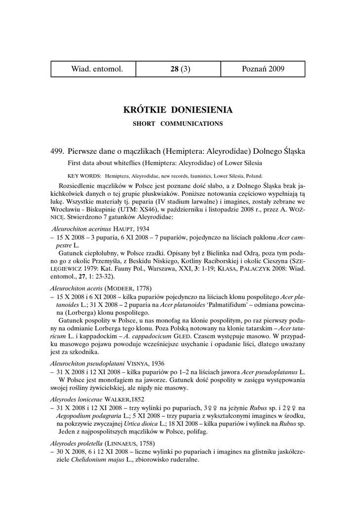 Wiad. entomol. 28 (3) Poznań 2009 KRÓTKIE DONIESIENIA SHORT COMMUNICATIONS 499. Pierwsze dane o mączlikach (Hemiptera: Aleyrodidae) Dolnego Śląska First data about whiteflies (Hemiptera: Aleyrodidae) of Lower Silesia KEY WORDS: Hemiptera, Aleyrodidae, new records, faunistics, Lower Silesia, Poland. Rozsiedlenie mączlików w Polsce jest poznane dość słabo, a z Dolnego Śląska brak jakichkolwiek danych o tej grupie pluskwiaków. Poniższe notowania częściowo wypełniają tą lukę. Wszystkie materiały tj. puparia (IV stadium larwalne) i imagines, zostały zebrane we Wrocławiu - Biskupinie (UTM: XS46), w październiku i listopadzie 2008 r., przez A. WOŹNICĘ. Stwierdzono 7 gatunków Aleyrodidae: Aleurochiton acerinus HAUPT, 1934 – 15 X 2008 – 3 puparia, 6 XI 2008 – 7 pupariów, pojedynczo na liściach paklonu Acer campestre L. Gatunek ciepłolubny, w Polsce rzadki. Opisany był z Bielinka nad Odrą, poza tym podano go z okolic Przemyśla, z Beskidu Niskiego, Kotliny Raciborskiej i okolic Cieszyna (SZELĘGIEWICZ 1979: Kat. Fauny Pol., Warszawa, XXI, 3: 1-19; KLASA, PALACZYK 2008: Wiad. entomol., 27, 1: 23-32). Aleurochiton aceris (MODEER, 1778) – 15 X 2008 i 6 XI 2008 – kilka pupariów pojedynczo na liściach klonu pospolitego Acer platanoides L.; 31 X 2008 – 2 puparia na Acer platanoides ‘Palmatifidum’ – odmiana powcinana (Lorberga) klonu pospolitego. Gatunek pospolity w Polsce, u nas monofag na klonie pospolitym, po raz pierwszy podany na odmianie Lorberga tego klonu. Poza Polską notowany na klonie tatarskim – Acer tataricum L. i kappadockim – A. cappadocicum GLED. Czasem występuje masowo. W przypadku masowego pojawu powoduje wcześniejsze usychanie i opadanie liści, dlatego uważany jest za szkodnika. Aleurochiton pseudoplatani VISNYA, 1936 – 31 X 2008 i 12 XI 2008 – kilka pupariów po 1–2 na liściach jawora Acer pseudoplatanus L. W Polsce jest monofagiem na jaworze. Gatunek dość pospolity w zasięgu występowania swojej rośliny żywicielskiej, ale nigdy nie masowy. Aleyrodes lonicerae WALKER,1852 – 31 X 2008 i 12 XI 2008 – trzy wylinki po pupariach, 3&& na jeżynie Rubus sp. i 2&& na Aegopodium podagraria L.; 5 XI 2008 – trzy puparia z wykształconymi imagines w środku, na pokrzywie zwyczajnej Urtica dioica L.; 18 XI 2008 – kilka pupariów i wylinek na Rubus sp. Jeden z najpospolitszych mączlików w Polsce, polifag. Aleyrodes proletella (LINNAEUS, 1758) – 30 X 2008, 6 i 12 XI 2008 – liczne wylinki po pupariach i imagines na glistniku jaskółczeziele Chelidonium majus L., zbiorowisko ruderalne. 192 KRÓTKIE DONIESIENIA Gatunek kosmopolityczny. W Polsce stwierdzony na Chelidonium majus, kapuście ogrodowej Brassica oleracea L., wilczomleczu migdałolistnym Euphorbia amygdaloides L. i gruszyczce zielonej Pyrola chlorantha SW. Żeruje na dolnej stronie liści i tworzy zwarte kolonie. Ma kilka pokoleń w ciągu roku. Uważany na szkodnika warzyw, głównie kapusty. Asterobemisia carpini KOCH, 1857 – 15 X 2008 – pojedyncze puparium na górnej stronie liścia wiązu Ulmus sp.; 21 i 31 X 2008 – liczne puparia po 1–3 na Rubus sp. i trzy puparia na Ulmus sp., 18 XI 2008 – dwa puparia na Rubus sp. Gatunek polifagiczny, cechuje się dużą zmiennością pupariów. Rozsiedlenie w Polsce słabo poznane. Neopealius rubi TAKAHASHI, 1954 – 15 X 2008 i 12 XI 2008 – kilka wylinek po pupariach na młodych liściach Rubus sp., niektóre w skupieniach; 31 X 2008 – pojedyncze, spasożytowane puparium z larwą na Rubus sp. W Polsce znany był dotąd z jednego stanowiska w Puszczy Kampinoskiej, skąd został podany na podstawie 45 pupariów i 4 samic zebranych w sierpniu na Rubus fruticosus L. (BINKMOENEN 1991: Ent. Ber. Amst., 51: 29-36). Polifag, odnotowany na roślinach z 7 rodzin, ale preferuje róże (Rosa spp.) i jeżyny (Rubus spp.). Najprawdopodobniej zimują postaci dorosłe. Gatunek palearktyczny, opisany z Japonii, poza tym znany z Bułgarii, Finlandii, Francji, Szwecji, Turcji, Węgier (MARTIN i in. 1991: Bull. ent. Res., 90: 407-448), Rosji – z Jużnowo Primoria (DANZIG 1966: Entom. Obozr., 45, 2: 364-386), Ukrainy – z Krymu (KOROBITSIN 1967: Entom. Obozr., 46, 4: 857-859) oraz z Kazachstanu, Tadżykistanu i z Gór Hisarskich (DANZIG 1969: Entom. Obozr., 48, 4: 868-880). Okazy dowodowe znajdują się w zbiorach autorki. Obecnie z Polski znanych jest 17 gatunków Aleyrodidae. Dalsze badania mączlików Dolnego Śląska powinny przyczynić się do wykazania kilku następnych gatunków znanych z innych regionów Polski; możliwe jest również stwierdzenie gatunków dotychczas nie podawanych z naszego kraju. Anna KLASA, Ojcowski PN, Ojców Andrzej Józef WOŹNICA, Inst. Biol. Uniw. Przyr., Wrocław 500. Nowe dane o występowaniu interesujących i rzadkich gatunków biegaczowatych (Coleoptera: Carabidae) w północno-wschodniej Polsce New data on the occurrence of interesting and rare Carabidae species (Coleoptera) in North-Eastern Poland KEY WORDS: Coleoptera, Carabidae, ground beetles, faunistics, Mazurian Lakelands, NW Poland. Carabus marginalis FABRICIUS, 1794 Gatunek występujący w środkowo-wschodniej Europie i w zachodniej części Syberii. Swoim zasięgiem obejmuje Polskę, Białoruś, Ukrainę, zachodnią Rosję i Rumunię, znany jest też z nielicznych stanowisk w Mołdawii i na Węgrzech (TURIN i in. 2003: Fauna Europaea Evertebrata No. 2. Pensoft Publishers, Sofia–Moscow. 511 ss.). W Polsce notowany rzadko, głównie z północnej, wschodniej i południowo-wschodniej części kraju, przy czym wiele WIAD. ENTOMOL., 28 (3): POZNAŃ 2009 193 doniesień pochodzi z XIX i pierwszej połowy XX w. (BURAKOWSKI i in. 1973: Kat. Fauny Pol., Warszawa, XXIII, 2:1-232). Aktualnych obserwacji tego gatunku na terenie północnowschodniej Polski dokonał m.in. TARWADZKI („Wpływ ogniskowo-kompleksowej metody ochrony borów sosnowych na zgrupowania biegaczowatych (Carabidae)” – rozprawa doktorska wykonana w Zakładzi