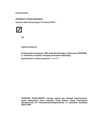 Podsumowanie PROSPEKTU PODSTAWOWEGO Deutsche Bank AG [Londyn] z 19 czerwca 2007 r. dla Papierów d nych [liczba] papierów d nych Multi Asset Best Strategy [ ka dorazowo WKN/ISIN] w odniesieniu do [poda szczegó y Instrumentu Bazowego] [emitowanych w ramach programu TM ] PROSPEKT PODSTAWOWY, którego cz ci jest niniejsze podsumowanie, zosta zatwierdzony przez Federalny Urz d Nadzoru Us ug Finansowych (Bundesanstalt für Finanzdienstleistungsaufsicht) na podstawie Dyrektywy 2003/71/WE. Poni sze informacje stanowi jedynie podsumowanie i nale y je czyta w powi zaniu z pozosta cz ci dokumentu. Podsumowanie ma umo liwi inwestorom orientacj w zakresie istotnych ciwo ci Emitenta oraz ryzyka zwi zanego z Emitentem oraz Papierami Warto ciowymi. Podsumowanie oparte jest w ca ci na Prospekcie, ale nie zawiera wszystkich informacji. Dlatego te podsumowanie nale y traktowa jako wprowadzenie do tego dokumentu, a ka da decyzja dotycz ca inwestowania w Papiery Warto ciowe powinna by podejmowana w oparciu o tre ca ego dokumentu. Potencjalni inwestorzy powinni by wiadomi, e inwestor który dochodzi swoich roszcze dotycz cych informacji zawartych w Prospekcie na drodze s dowej, mo e by - zgodnie z przepisami prawnymi danego kraju cz onkowskiego Europejskiego Obszaru Gospodarczego zobowi zany do pokrycia kosztów t umaczenia dokumentu przed rozpocz ciem post powania dowego. Emitent, który sporz dzi podsumowanie wraz z jego t umaczeniem i który doprowadzi do ich publikacji, ponosi odpowiedzialno cywiln , z zastrze eniem, e odpowiedzialno taka zachodzi jedynie wtedy, kiedy podsumowanie wprowadza w b d, jest niedok adne lub sprzeczne z innymi cz ciami tego dokumentu.. Podsumowanie sk ada si z: Podsumowania Czynników Ryzyka Podsumowania Ostatecznych Warunków Oferty Podsumowania Opisu Emitenta A. PODSUMOWANIE CZYNNIKÓW RYZYKA Czynniki ryzyka zwi zane z Emitentem Przedstawione poni ej czynniki ryzyka odnosz si do zdolno ci Deutsche Bank do wykonania swoich zobowi za z tytu u emisji papierów warto ciowych. Inwestycja w papiery d ne, w tym certyfikaty i pieni ne papiery warto ciowe Deutsche Bank kryj ryzyko, e Deutsche Bank nie wywi e si , nie wywi e si w ca ci lub nie wywi e si w terminie z powsta ych zobowi za . Dla oceny tego ryzyka potencjalni inwestorzy powinni wzi pod uwag wszystkie informacje zawarte w niniejszym Prospekcie oraz Dokumencie Rejestracyjnym Deutsche Bank oraz – o ile uznaj to za konieczne – uzgodni decyzje inwestycyjne ze swoim doradc finansowym. Rating Ratingi nadawane Emitentowi przez niezale ne agencje ratingowe okre laj zdolno Emitenta do wywi zywania si z zobowi za z tytu u papierów d nych. W dniu 14 maja 2007 r. Deutsche Bank posiada nast puj ce ratingi swoich d nych i pieni nych papierów warto ciowych przyznane mu przez odpowiednie agencje: Agencja ratingowa Zobowi zania ugoterminowe Zobowi zania krótkoterminowe Przewidywania Standard & Poors (S&P) AA- A-1+ pozytywne Moodys Aa1 P-1 stabilne AA- F1+ stabilne Fitch P Rating zobowi za drugoplanowych Drugoplanowe zobowi zania Deutsche Bank mog uzyska ni szy rating, poniewa w przypadku upad ci lub likwidacji banku nale no ci powsta e z takich zobowi za oraz roszczenia z tytu u odsetek s drugorz dne w stosunku do roszcze wszystkich wierzycieli banku, nie b cych równie roszczeniami drugoplanowymi. Deutsche Bank opublikuje rating zobowi za drugoplanowych. Ryzyka zwi zane z Papierami Warto ciowymi Inwestowanie w Papiery Warto ciowe niesie ze sob okre lone ryzyka. Mog to by mi dzy innymi: ryzyko rynku akcji, ryzyko rynku obligacji, ryzyko dewizowe, ryzyko stóp procentowych, ryzyko zmienno ci rynku, ryzyko ekonomiczne, ryzyko polityczne, ryzyko zmiany przepisów prawnych, a tak e inne ryzyka, w tym ryzyka stanowi ce po czenie takich oraz innych ryzyk. Potencjalni nabywcy powinni posiada do wiadczenie transakcyjne w odniesieniu do takich instrumentów finansowych jak Papiery Warto ciowe i Instrument Bazowy. Potencjalni nabywcy powinni by wiadomi ryzyk zwi zanych z inwestowaniem w Papiery Warto ciowe, a przed podj ciem decyzji inwestycyjnej powinni wraz ze swoimi doradcami, w tym doradcami prawnymi, podatkowymi i finansowymi, dokona szczegó owej analizy: (i) przydatno ci inwestowania w Papiery Warto ciowe w kontek cie ich indywidualnej sytuacji finansowej, podatkowej lub innej, (ii) informacji zawartych w niniejszym dokumencie, oraz (iii) Instrumentu Bazowego Papiery Warto ciowe mog traci na warto ci. Im krótszy okres do daty wykupu Papieru Warto ciowego, tym wy sze ryzyko spadku jego warto ci. 3 Inwestowanie w Papiery Warto ciowe powinno by dokonane dopiero po ocenie kierunku, terminu i rozmiaru potencjalnych przysz ych zmian warto ci Instrumentu Bazowego lub zmian w sk adzie lub metodzie obliczania warto ci Instrumentu Bazowego, z uwagi na to, e zysk z danej inwestycji jest uzale niony m.in. od takich zmian. Na warto Papierów Warto ciowych mo e mie jednoczesny wp yw szereg czynników ryzyka, dlatego nie da si przewidzie wp ywu pojedynczego czynnika ryzyka. Ponadto, nie da si równie przewidzie , jaki wp yw na warto Papierów Warto ciowych ma kilka czynników oddzia ywuj cych cznie. Nie mo na w sposób wi cy stwierdzi , jaki wp yw na warto Papierów Warto ciowych ma po czenie kilku czynników ryzyka. [Ewentualnie uzupe ni o dodatkowe czynniki ryzyka, charakterystyczne dla danego produktu: a zwi zane ze szczególnym rodzajem Instrumentu Bazowego lub warunkami emisji Papierów warto ciowych dotycz cymi okre lenia wysoko ci wyp aty i okresu wa no ci] 4 B PODSUMOWANIE OSTATECZNYCH WARUNKÓW OFERTY Informacje zawarte w niniejszym rozdziale tworz skrócony opis Papierów Warto ciowych. Oparte one na bardziej szczegó owych wyja nieniach przestawionych w rozdzia ach „Warunki Produktów” i „Ogólne Warunki” niniejszego dokumentu, które stanowi prawnie wi ce warunki emisji Papierów Warto ciowych do czone do globalnego papieru warto ciowego. Potencjalni inwestorzy powinni dok adnie zapozna si ze zrozumieniem z Warunkami Produktów 