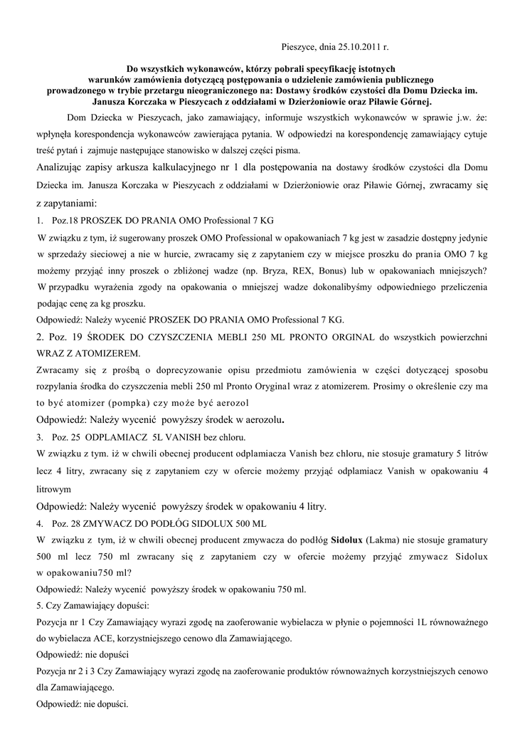 Pieszyce, dnia 25.10.2011 r. Do wszystkich wykonawców, którzy pobrali specyfikację istotnych warunków zamówienia dotyczącą postępowania o udzielenie zamówienia publicznego prowadzonego w trybie przetargu nieograniczonego na: Dostawy środków czystości dla Domu Dziecka im. Janusza Korczaka w Pieszycach z oddziałami w Dzierżoniowie oraz Piławie Górnej. Dom Dziecka w Pieszycach, jako zamawiający, informuje wszystkich wykonawców w sprawie j.w. że: wpłynęła korespondencja wykonawców zawierająca pytania. W odpowiedzi na korespondencję zamawiający cytuje treść pytań i zajmuje następujące stanowisko w dalszej części pisma. Analizując zapisy arkusza kalkulacyjnego nr 1 dla postępowania na dostawy środków czystości dla Domu Dziecka im. Janusza Korczaka w Pieszycach z oddziałami w Dzierżoniowie oraz Piławie Górnej , zwracamy się z zapytaniami: 1. Poz.18 PROSZEK DO PRANIA OMO Professional 7 KG W związku z tym, iż sugerowany proszek OMO Professional w opakowaniach 7 kg jest w zasadzie dostępny jedynie w sprzedaży sieciowej a nie w hurcie, zwracamy się z zapytaniem czy w miejsce proszku do prania OMO 7 kg możemy przyjąć inny proszek o zbliżonej wadze (np. Bryza, REX, Bonus) lub w opakowaniach mniejszych? W przypadku wyrażenia zgody na opakowania o mniejszej wadze dokonalibyśmy odpowiedniego przeliczenia podając cenę za kg proszku. Odpowiedź: Należy wycenić PROSZEK DO PRANIA OMO Professional 7 KG. 2. Poz. 19 ŚRODEK DO CZYSZCZENIA MEBLI 250 ML PRONTO ORGINAL do wszystkich powierzchni WRAZ Z ATOMIZEREM. Zwracamy się z prośbą o doprecyzowanie opisu przedmiotu zamówienia w części dotyczącej sposobu rozpylania środka do czyszczenia mebli 250 ml Pronto Oryginal wraz z atomizerem. Prosimy o określenie czy ma to być atomizer (pompka) czy mo że być aerozol Odpowiedź: Należy wycenić powyższy środek w aerozolu. 3. Poz. 25 ODPLAMIACZ 5L VANISH bez chloru. W związku z tym. iż w chwili obecnej producent odplamiacza Vanish bez chloru, nie stosuje gramatury 5 litrów lecz 4 litry, zwracany się z zapytaniem czy w ofercie możemy przyjąć odplamiacz Vanish w opakowaniu 4 litrowym Odpowiedź: Należy wycenić powyższy środek w opakowaniu 4 litry. 4. Poz. 28 ZMYWACZ DO PODŁÓG SIDOLUX 500 ML W związku z tym, iż w chwili obecnej producent zmywacza do podłóg Sidolux (Lakma) nie stosuje gramatury 500 ml lecz 750 ml zwracany się z zapytaniem czy w ofercie możemy przyjąć zmywacz Sidolux w opakowaniu750 ml? Odpowiedź: Należy wycenić powyższy środek w opakowaniu 750 ml. 5. Czy Zamawiający dopuści: Pozycja nr 1 Czy Zamawiający wyrazi zgodę na zaoferowanie wybielacza w płynie o pojemności 1L równoważnego do wybielacza ACE, korzystniejszego cenowo dla Zamawiającego. Odpowiedź: nie dopuści Pozycja nr 2 i 3 Czy Zamawiający wyrazi zgodę na zaoferowanie produktów równoważnych korzystniejszych cenowo dla Zamawiającego. Odpowiedź: nie dopuści. Pozycja nr 4 Czy Zamawiający wyrazi zgodę na zaoferowanie mleczka w płynie 500 ml z odpowiednim przeliczeniem ilości równoważnego do mleczka Cif. Odpowiedź: nie dopuści. Pozycja nr 8 Czy Zamawiający wyrazi zgodę na zaoferowanie produktu równoważnego w opakowaniu 50 szt lub 70szt z odpowiednim przeliczeniem ilości. Odpowiedź: nie dopuści. Pozycja nr 9 i 10, 14, 15,18, 25, 31, 32, 35 Czy Zamawiający wyrazi zgodę na zaoferowania produktu równoważnego, korzystniejszego cenowo dla Zamawiającego. Odpowiedź: nie dopuści. Pozycja nr 19 Czy Zamawiający wyrazi zgodę na zaoferowanie produktu równoważnego o pojemności 300ml lub 400ml z odpowiednim przeliczeniem ilości. Odpowiedź: nie dopuści. Pozycja nr 21, 22 Czy Zamawiający wyrazi zgodę na zaoferowanie worków na odpady pakowanych w rolce po 25 szt z odpowiednim przeliczeniem ilości , oraz czy Zamawiający wymaga odpowiednio 250 i 540 sztuk worków czy sztuk rolek. Odpowiedź: Zamawiający nie wyraża zgody na zaoferowanie worków na odpady pakowanych w rolce po 25 szt. Zamawiający wymaga odpowiednio 250 i 540 sztuk rolek. Pozycja nr 28 W związku z faktem iż zmywacz sidolux występuje w opakowaniach 750ml, prosimy o wyrażenie zgody na zaoferowanie produktu w opakowaniu po 750ml z odpowiednim przeliczeniem ilości, bądź wyrażenie zgody na zaoferowanie produktu równoważnego w opakowaniu 500ml. Odpowiedź:Należy wycenić ZMYWACZ DO PODŁÓG SIDOLUX 750 ml. Pozycja nr 38 Czy Zamawiający wymaga 1000 szt pojedynczych podpasek czy 1000 opakowań po 10 szt podpasek. Czy Zamawiający wyrazi zgodę na zaoferowanie podpasek firmy Bella. Odpowiedź: Zamawiający wymaga 1000 opakowań po 10 szt podpasek, nie wyrazi zgody na zaoferowanie podpasek firmy Bella. Pozycja nr 6 Czy Zamawiający dopuści środek chlorowy Jarel w opakowaniu 5l. Odpowiedź: nie dopuści. Dyrektor Jednostki Ilona Bugaj.