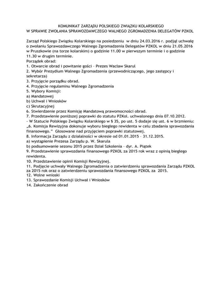 KOMUNIKAT ZARZĄDU POLSKIEGO ZWIĄZKU KOLARSKIEGO W SPRAWIE ZWOŁANIA SPRAWOZDAWCZEGO WALNEGO ZGROMADZENIA DELEGATÓW PZKOL Zarząd Polskiego Związku Kolarskiego na posiedzeniu w dniu 24.03.2016 r. podjął uchwałę o zwołaniu Sprawozdawczego Walnego Zgromadzenia Delegatów PZKOL w dniu 21.05.2016 w Pruszkowie (na torze kolarskim) o godzinie 11.00 w pierwszym terminie i o godzinie 11.30 w drugim terminie. Porządek obrad: 1. Otwarcie obrad i powitanie gości – Prezes Wacław Skarul 2. Wybór Prezydium Walnego Zgromadzenia (przewodniczącego, jego zastępcy i sekretarza) 3. Przyjęcie porządku obrad. 4. Przyjęcie regulaminu Walnego Zgromadzenia 5. Wybory Komisji: a) Mandatowej b) Uchwał i Wniosków c) Skrutacyjnej 6. Stwierdzenie przez Komisję Mandatową prawomocności obrad. 7. Przedstawienie poniższej poprawki do statutu PZKol. uchwalonego dnia 07.10.2012. - W Statucie Polskiego Związku Kolarskiego w § 35, po ust. 5 dodaje się ust. 6 w brzmieniu: „6. Komisja Rewizyjna dokonuje wyboru biegłego rewidenta w celu zbadania sprawozdania finansowego.” Głosowane nad przyjęciem poprawki statutowej. 8. Informacja Zarządu z działalności w okresie od 01.01.2015 – 31.12.2015. a) wystąpienie Prezesa Zarządu p. W. Skarula b) podsumowanie sezonu 2015 przez Dział Szkolenia – dyr. A. Piątek 9. Przedstawienie sprawozdania finansowego PZKOL za 2015 rok wraz z opinią biegłego rewidenta. 10. Przedstawienie opinii Komisji Rewizyjnej. 11. Podjęcie uchwały Walnego Zgromadzenia o zatwierdzeniu sprawozdania Zarządu PZKOL za 2015 rok oraz o zatwierdzeniu sprawozdania finansowego PZKOL za 2015. 12. Wolne wnioski 13. Sprawozdanie Komisji Uchwał i Wniosków 14. Zakończenie obrad