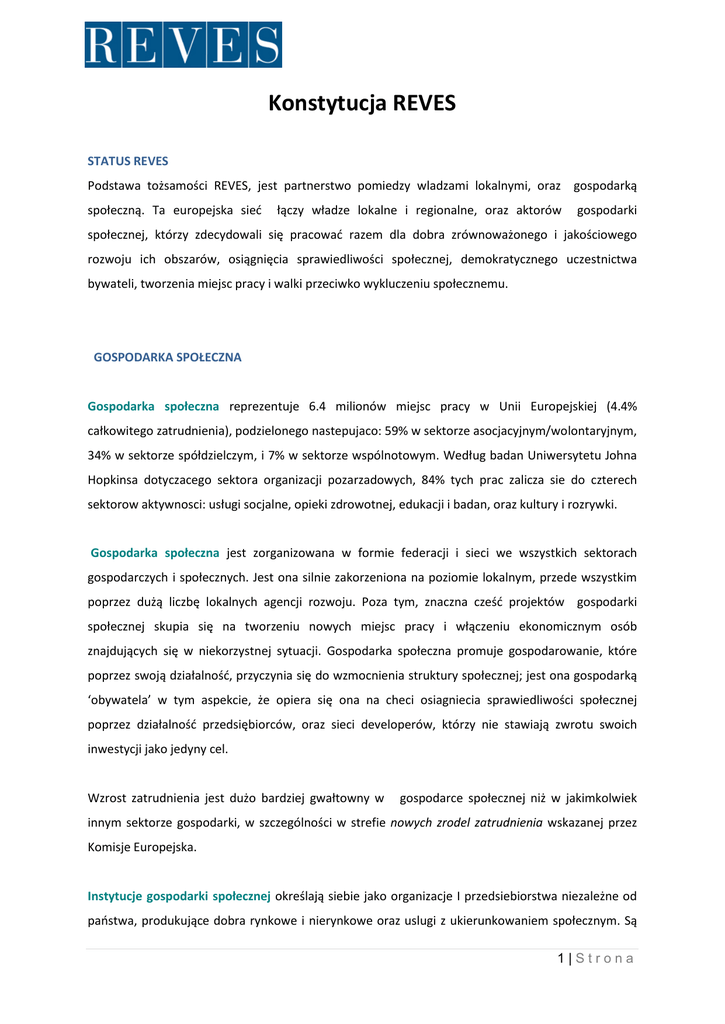 Konstytucja REVES STATUS REVES Podstawa tożsamości REVES, jest partnerstwo pomiedzy wladzami lokalnymi, oraz gospodarką społeczną. Ta europejska sieć łączy władze lokalne i regionalne, oraz aktorów gospodarki społecznej, którzy zdecydowali się pracować razem dla dobra zrównoważonego i jakościowego rozwoju ich obszarów, osiągnięcia sprawiedliwości społecznej, demokratycznego uczestnictwa bywateli, tworzenia miejsc pracy i walki przeciwko wykluczeniu społecznemu. GOSPODARKA SPOŁECZNA Gospodarka społeczna reprezentuje 6.4 milionów miejsc pracy w Unii Europejskiej (4.4% całkowitego zatrudnienia), podzielonego nastepujaco: 59% w sektorze asocjacyjnym/wolontaryjnym, 34% w sektorze spółdzielczym, i 7% w sektorze wspólnotowym. Według badan Uniwersytetu Johna Hopkinsa dotyczacego sektora organizacji pozarzadowych, 84% tych prac zalicza sie do czterech sektorow aktywnosci: usługi socjalne, opieki zdrowotnej, edukacji i badan, oraz kultury i rozrywki. Gospodarka społeczna jest zorganizowana w formie federacji i sieci we wszystkich sektorach gospodarczych i społecznych. Jest ona silnie zakorzeniona na poziomie lokalnym, przede wszystkim poprzez dużą liczbę lokalnych agencji rozwoju. Poza tym, znaczna cześć projektów gospodarki społecznej skupia się na tworzeniu nowych miejsc pracy i włączeniu ekonomicznym osób znajdujących się w niekorzystnej sytuacji. Gospodarka społeczna promuje gospodarowanie, które poprzez swoją działalność, przyczynia się do wzmocnienia struktury społecznej; jest ona gospodarką ‘obywatela’ w tym aspekcie, że opiera się ona na checi osiagniecia sprawiedliwości społecznej poprzez działalność przedsiębiorców, oraz sieci developerów, którzy nie stawiają zwrotu swoich inwestycji jako jedyny cel. Wzrost zatrudnienia jest dużo bardziej gwałtowny w gospodarce społecznej niż w jakimkolwiek innym sektorze gospodarki, w szczególności w strefie nowych zrodel zatrudnienia wskazanej przez Komisje Europejska. Instytucje gospodarki społecznej określają siebie jako organizacje I przedsiebiorstwa niezależne od państwa, produkujące dobra rynkowe i nierynkowe oraz uslugi z ukierunkowaniem społecznym. Są 1|Strona organizacjami i przedsiebiorstwami, które stosują demokratyczne uczestnictwo swoich użytkowników, oraz pracowników i których głównym celem jest ogólny zysk oraz solidarność i które nie dzielą dochodów pomiędzy swoich akcjonariuszy. WŁADZE LOKALNE I REGIONALNE Władze lokalne i regionalne sa niezbednymi aktorami w walce przeciwko ubóstwu i wyłączeniu społecznemu, oraz w kreowaniu miejsc pracy, ze wzgledu na ich umiejętność w zapewnieniu aktywnego udziału różnorodnych uczestników gospodarczych i socjalnych na obszarze ich działania. Jako lokalni przedstawiciele władzy, stykają się oni na co dzień z potrzebami obywateli, którzy ich wybrali. Dlatego maja oni możliwość przyczynić się w znacznym stopniu do stworzenia społecznej spójności, oraz do tworzenia nowych miejsc pracy, poprzez wspieranie aktorów gospodarki społecznej, w kreowaniu nowych usług, w ramach nowego i zróżnicowanego dobrobytu komunalnego. Te usugi zaspokajają potrzeby, które nie są objęte, ani przez sektor prywatny, ani przez panstwo. ZAŁOŻENIA I CELE Komisja Europejska w ramach swojej nowej Europejskiej polityki zatrudnienia, po raz perwszy uznała znaczenie gospodarki społecznej, jako twórcy miejsc pracy, poprzez promowanie nowych i włączających technik zarządzania (na przykład w spółdzielniach socjalnych), nowych rodzajów demokratycznych relacji pomiedzy instytucjami publicznymi oraz społeczenstwa obywatelskiego (na przyklad partnerstwa rozwoju lokalnego), nowe formy uczestnictwa członków i użytkowników tworzeniu przedsiębiorstw i dobrobytu. Wartym jest odnotowania, że gospodarka społeczna w szczególności adresuje potrzeby osob społecznie wykluczonych, poprzez tworzenie partnerstw ze wszystkimi aktorami gospodarczymi i społecznymi, w szczególności ze światem akademickim, w celu przeciwdziałaniu społecznemu wykluczeniu ze wzgledu na posiadanie dóbr. W KONSEKWENCJI Ze względu na zdolność regionów i miast w zapewnieniu, w ramach ich regionów, aktywnego uczestnictwa rożnego rodzaju aktorów gospodarczych i społecznych, oraz obywateli, w walce z ubóstwem oraz wykluczeniem społecznym, jak również ich zdolność do większego udziału w tworzeniu miejsc pracy i zrównoważonego rozwoju ; 2|Strona Ze względu na wysoki poziom umiejętności, know-how, oraz doświadczenie gospodarki społecznej w rozwoju organizacji pozarządowych, przedsiębiorstw ogólnego interesu, w pracy z i dla osób nieuprzywilejowanych; we wzmacnianiu wśród obywateli i społeczności, umiejętności samoorganizacji poprzez należące do i kontrolowane przez ich członków, w stymulowaniu nowej kultury społecznej przedsiębiorczości; Ze względu na powszechne życzenie dla rozwoju spolecznej sprawiedliwości, prawa do pracy oraz demokratycznego uczestnictwa obywateli, w wysokiej jakości ekonomicznym i społecznym rozwoju ich regionu; Ze wzgledu na wyzwanie pelnego zatrudnienia na poziomie europejskim, a w szczególności przewodnika dla Państw Członkowskich w kwestii polityki zatrudnienia, który został przyjęty na nadzwyczajnym posiedzeniu Luksemburskiej Rady Europejskiej o Zatrudnieniu, który sugeruje wzięcie w większym stopniu pod uwage ‘mozliwosci oferowanych poprzez kreowanie miejsc pracy na lokalnym szczeblu, w ramach Gospodarki Społecznej i w ramach nowych dzialan powiazanych z potrzebami, ktore nie są jeszcze w pelni pokryte przez rynek’, jak i zachęcanie do partnerskiego podejścia. PRZEDSTAWICIELE MIAST I REGIONOW ORAZ ORGANZACJI GOSPODARKI SPOŁECZNEJ, CZŁONKOWIE REVES, ZOBOWIAZUJĄ SIE DO: Ustanowienia stabilnego partnerstwa, długoterminowej współpracy i wspólnej koordynacji oraz polityki planowania lokalnego rozwoju, pomiędzy władzami lokalnymi, a 