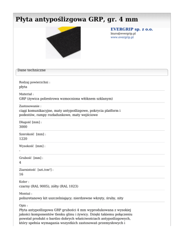 Płyta antypoślizgowa GRP, gr. 4 mm EVERGRIP sp. z o.o. [email protected] www.evergrip.pl Dane techniczne Rodzaj powierzchni : płyta Materiał : GRP (żywica poliestrowa wzmocniona włóknem szklanym) Zastosowanie : ciągi komunikacyjne, maty antypoślizgowe, pokrycia platform i podestów, rampy rozładunkowe, maty wejściowe Długość [mm] : 3000 Szerokość [mm] : 1220 Wysokość [mm] : Grubość [mm] : 4 Ziarnistość [szt./cm²] : 16 Kolor : czarny (RAL 9005), żółty (RAL 1023) Montaż : poliuretanowy kit uszczelniający; nierdzewne wkręty, śruby, nity Opis : Płyta antypoślizgowa GRP grubości 4 mm wyprodukowana z wysokiej jakości komponentów tlenku glinu i żywicy. Dzięki takiemu połączeniu powstał produkt o bardzo dobrych właściwościach antypoślizgowych, który spełnia wymagania wszystkich zastosowań przemysłowych i komercyjnych. Płyta jest rozwiązaniem trwale eliminującym możliwość poślizgnięcia się i bardzo często zastępuje tradycyjne taśmy lub farby antypoślizgowe. Płytę można mocować do podłoża za pomocą kleju-uszczelniacza, który klei a zarazem uszczelnia powierzchnię zapobiegając wnikaniu wilgoci i drobnoustrojów pod płytę. Istnieje również możliwość montażu za pomocą elementów mocujących ze stali nierdzewnej. Przed dostarczeniem do klienta płyta może być fabrycznie przycięta na żądane wymiary oraz wykończona zgodnie określonymi przez klienta wymiarami, tak aby ułatwić ich montaż. Podczas montażu można również przyciąć płytę za pomocą przecinarki kątowej z tarczą diamentową. Płyta została zaprojektowana tak, aby pasowała do wszystkich typów podłoża. Płytę o tej grubości można stosować nawet tam gdzie powierzchnia podłoża jest uszkodzona lub nie jest w najlepszym stanie. Zabezpieczenia antypoślizgowe ze względu na swoją różnorodność można stosować w każdym miejscu, gdzie występuje problem śliskich powierzchni: ■ zakłady produkcyjne ■ szkoły ■ urzędy ■ miejsca użyteczności publicznej ■ szpitale ■ statki i łodzie ■ elektrownie i elektrociepłownie ■ ścieżki dla pieszych ■ mosty i kładki ■ domy prywatne. Cechy charakterystyczne: ■ gwarancja bezpieczeństwa - powierzchnie antypoślizgowe zmniejszają możliwość poślizgnięcia się i gwarantują bezpieczną pracę w miejscach, gdzie są zamontowane; spełniają europejskie normy BHP ■ odporność - produkty są odporne na czynniki atmosferyczne i chemiczne ■ trwałość - wytrzymałość grysu antypoślizgowego może równać się z wytrzymałością diamentu przemysłowego; specjalnie skonstruowana podstawa z żywicy wzmacnianej włóknem szklanym sprawia, że całość jest odporna także na uderzenia mechaniczne ■ prosta i szybka instalacja - do montażu powierzchni antypoślizgowych nie potrzeba żadnych specjalistycznych narzędzi ■ natychmiastowe działanie - w przeciwieństwie do posadzek lub farb antypoślizgowych, nawierzchnie mogą być używane od razu po zamontowaniu, co zmniejsza lub nawet całkowicie wyklucza przestój w miejscach gdzie są montowane ■ higiena - do instalacji elementów antypoślizgowych Evergrip w przemyśle spożywczym używa się specjalnego szczeliwa klejącego, dzięki któremu powierzchnie bardzo dokładnie przylegają do podłoża; zapobiega to dostawaniu się pod spód wody i innych płynów,