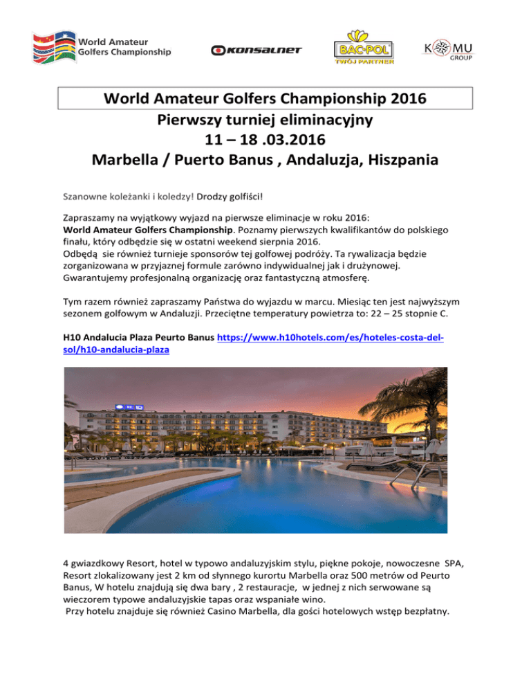World Amateur Golfers Championship 2016 Pierwszy turniej eliminacyjny 11 – 18 .03.2016 Marbella / Puerto Banus , Andaluzja, Hiszpania Szanowne koleżanki i koledzy! Drodzy golfiści! Zapraszamy na wyjątkowy wyjazd na pierwsze eliminacje w roku 2016: World Amateur Golfers Championship. Poznamy pierwszych kwalifikantów do polskiego finału, który odbędzie się w ostatni weekend sierpnia 2016. Odbędą sie również turnieje sponsorów tej golfowej podróży. Ta rywalizacja będzie zorganizowana w przyjaznej formule zarówno indywidualnej jak i drużynowej. Gwarantujemy profesjonalną organizację oraz fantastyczną atmosferę. Tym razem również zapraszamy Państwa do wyjazdu w marcu. Miesiąc ten jest najwyższym sezonem golfowym w Andaluzji. Przeciętne temperatury powietrza to: 22 – 25 stopnie C. H10 Andalucia Plaza Peurto Banus https://www.h10hotels.com/es/hoteles-costa-delsol/h10-andalucia-plaza 4 gwiazdkowy Resort, hotel w typowo andaluzyjskim stylu, piękne pokoje, nowoczesne SPA, Resort zlokalizowany jest 2 km od słynnego kurortu Marbella oraz 500 metrów od Peurto Banus, W hotelu znajdują się dwa bary , 2 restauracje, w jednej z nich serwowane są wieczorem typowe andaluzyjskie tapas oraz wspaniałe wino. Przy hotelu znajduje się również Casino Marbella, dla gości hotelowych wstęp bezpłatny. Przedstawiamy poniżej ramowy program i kilka szczegółów: 11.03 – Wylot z Warszawy i Berlina do Malagi. Przylot i transfer (ok. 30 minut) do hotelu H10 Andalucia Plaza 4 **** Sup. Przyjazd do hotelu. Zakwaterowanie. Dla grupy z Berlina możliwa runda golfa na polu Flamingos 12.03 – śniadanie w hotelu. Dzień treningowy La Quinta/ Los Naranjos. Wieczorem koktajl powitalny, z tapas oraz winem 13.03 – śniadanie w hotelu. Dzień treningowy na polu La Quinta/ Los Naranjos. 14.03 – śniadanie w hotelu. BAĆ-POL Golf Cup drużynowej na polu Los Naranjos. 15.03 – śniadanie w hotelu. KONSALNET Golf Trophy na polu La Quinta 16.03 – śniadanie w hotelu. World Amateur Golfers Championship na La Quinta. Wieczorem Ceremonia Wręczenia Nagród oraz wspólna kolacja oraz zabawa do rana 17.03 – śniadanie w hotelu – dzień wolny, możliwość dodatkowej rundy golfa na wybranym polu - do ustalenia na miejscu 18.03 – śniadanie w hotelu, czas wolny, wykwaterowanie, transfer na lotnisko, wylot do Warszawy/Berlina Świadczenia zawarte w cenie: *przelot bezpośredni z Warszawy (linie Norwegian) oraz z Berlina (linie Easyjet) do Malagi * 1 bagaż rejestrowany (maks 20 kg.) oraz podręczny (maks 10 kg) *zakwaterowanie w hotelu (7 nocy) *7 śniadań *transfery lotniskowe: lotnisko-hotel-lotnisko z bagażem golfowym *5 rund golfa – zgodnie z ramowym programem pobytu (rundy treningowe oraz rundy turniejowe) *koktajl powitalny z przekąsami oraz napojami: wino białe / czerwone *kolacja pożegnalna wraz napojami (wino białe / czerwone / soki, woda) oraz Ceremonia Wręczenia nagród *meleks każdego dnia (dla 2 osób) podczas 5 rund golfa zawartych w ofercie * żetony na driving range (1 na osobę w dniach golfowych) *opieka koordynatora z ramienia organizatora Komu Group *ubezpieczenie KL i NNW, TU Europa S.A. Golfista -Cena od osoby w pokoju 2 osobowym: 1345 EUR Nie golfista – Cena od osoby w pokoju 2 osobowym: 1099 EUR Golfista/ nie golfista - Dopłata do pokoju 1 osobowego: 273 EUR Zgłoszenia przyjmujemy na bieżąco w miarę dostępności miejsc. Bagaż golfowy płatny dodatkowo– koszt Easyjet- 80 EUR, Norwegian 65 EUR- koszt w dwie strony Zgłoszenia przyjmujemy pod [email protected] lub [email protected] Oraz telefonicznie pod numerem :519 854 196 Liczba uczestników ograniczona, zapraszamy do szybkich zapisów. Sekwencja przelotów z Berlina oraz z Warszawy BERLIN – linie Easyjet Piątek 11 marca 2016 Berlin Schoenefeld do Malaga Wylot 06:30 - Przylot 10:10 Lot EZY 4521 Piątek 18 marca 2016 Malaga do Berlin Schoenefeld Wylot 10:50 - Przylot 14:20 Lot EZY 4522 WARSZAWA – linie Norwegian Piątek 11 marca 2016 Warszawa - Malaga Wylot 19:50 przylot : 23:55 Lot DY5557 - Lot powrotny Piątek 18 marca 2016 Malaga - Warszawa Wylot 15:10 przylot 19:00 Lot DY5556 -