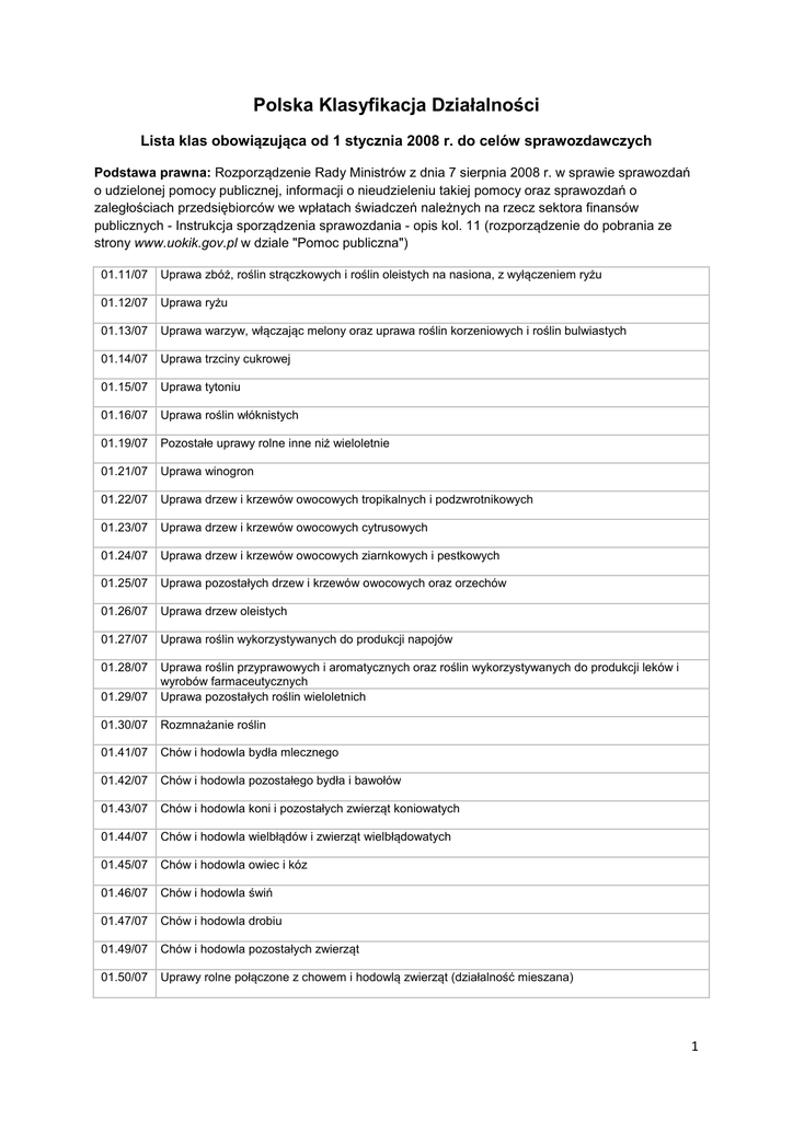 Polska Klasyfikacja Działalności Lista klas obowiązująca od 1 stycznia 2008 r. do celów sprawozdawczych Podstawa prawna: Rozporządzenie Rady Ministrów z dnia 7 sierpnia 2008 r. w sprawie sprawozdań o udzielonej pomocy publicznej, informacji o nieudzieleniu takiej pomocy oraz sprawozdań o zaległościach przedsiębiorców we wpłatach świadczeń należnych na rzecz sektora finansów publicznych - Instrukcja sporządzenia sprawozdania - opis kol. 11 (rozporządzenie do pobrania ze strony www.uokik.gov.pl w dziale "Pomoc publiczna") 01.11/07 Uprawa zbóż, roślin strączkowych i roślin oleistych na nasiona, z wyłączeniem ryżu 01.12/07 Uprawa ryżu 01.13/07 Uprawa warzyw, włączając melony oraz uprawa roślin korzeniowych i roślin bulwiastych 01.14/07 Uprawa trzciny cukrowej 01.15/07 Uprawa tytoniu 01.16/07 Uprawa roślin włóknistych 01.19/07 Pozostałe uprawy rolne inne niż wieloletnie 01.21/07 Uprawa winogron 01.22/07 Uprawa drzew i krzewów owocowych tropikalnych i podzwrotnikowych 01.23/07 Uprawa drzew i krzewów owocowych cytrusowych 01.24/07 Uprawa drzew i krzewów owocowych ziarnkowych i pestkowych 01.25/07 Uprawa pozostałych drzew i krzewów owocowych oraz orzechów 01.26/07 Uprawa drzew oleistych 01.27/07 Uprawa roślin wykorzystywanych do produkcji napojów 01.28/07 01.29/07 Uprawa roślin przyprawowych i aromatycznych oraz roślin wykorzystywanych do produkcji leków i wyrobów farmaceutycznych Uprawa pozostałych roślin wieloletnich 01.30/07 Rozmnażanie roślin 01.41/07 Chów i hodowla bydła mlecznego 01.42/07 Chów i hodowla pozostałego bydła i bawołów 01.43/07 Chów i hodowla koni i pozostałych zwierząt koniowatych 01.44/07 Chów i hodowla wielbłądów i zwierząt wielbłądowatych 01.45/07 Chów i hodowla owiec i kóz 01.46/07 Chów i hodowla świń 01.47/07 Chów i hodowla drobiu 01.49/07 Chów i hodowla pozostałych zwierząt 01.50/07 Uprawy rolne połączone z chowem i hodowlą zwierząt (działalność mieszana) 1 01.61/07 Działalność usługowa wspomagająca produkcję roślinną 01.62/07 Działalność usługowa wspomagająca chów i hodowlę zwierząt gospodarskich 01.63/07 Działalność usługowa następująca po zbiorach 01.64/07 Obróbka nasion dla celów rozmnażania roślin 01.70/07 Łowiectwo i pozyskiwanie zwierząt łownych, włączając działalność usługową 02.10/07 Gospodarka leśna i pozostała działalność leśna, z wyłączeniem pozyskiwania produktów leśnych 02.20/07 Pozyskiwanie drewna 02.30/07 Pozyskiwanie dziko rosnących produktów leśnych, z wyłączeniem drewna 02.40/07 Działalność usługowa związana z leśnictwem 03.11/07 Rybołówstwo w wodach morskich 03.12/07 Rybołówstwo w wodach śródlądowych 03.21/07 Chów i hodowla ryb oraz pozostałych organizmów wodnych w wodach morskich 03.22/07 Chów i hodowla ryb oraz pozostałych organizmów wodnych w wodach śródlądowych 05.10/07 Wydobywanie węgla kamiennego 05.20/07 Wydobywanie węgla brunatnego (lignitu) 06.10/07 Górnictwo ropy naftowej 06.20/07 Górnictwo gazu ziemnego 07.10/07 Górnictwo rud żelaza 07.21/07 Górnictwo rud uranu i toru 07.29/07 Górnictwo pozostałych rud metali nieżelaznych 08.11/07 08.12/07 Wydobywanie kamieni ozdobnych oraz kamienia dla potrzeb budownictwa, skał wapiennych, gipsu, kredy i łupków Wydobywanie żwiru i piasku; wydobywanie gliny i kaolinu 08.91/07 Wydobywanie minerałów dla przemysłu chemicznego oraz do produkcji nawozów 08.92/07 Wydobywanie torfu 08.93/07 Wydobywanie soli 08.99/07 Pozostałe górnictwo i wydobywanie, gdzie indziej niesklasyfikowane 09.10/07 Działalność usługowa wspomagająca eksploatację złóż ropy naftowej i gazu ziemnego 09.90/07 Działalność usługowa wspomagająca pozostałe górnictwo i wydobywanie 10.11/07 Przetwarzanie i konserwowanie mięsa, z wyłączeniem mięsa z drobiu 10.12/07 Przetwarzanie i konserwowanie mięsa z drobiu 10.13/07 Produkcja wyrobów z mięsa, włączając wyroby z mięsa drobiowego 10.20/07 Przetwarzanie i konserwowanie ryb, skorupiaków i mięczaków 10.31/07 Przetwarzanie i konserwowanie ziemniaków 2 10.32/07 Produkcja soków z owoców i warzyw 10.39/07 Pozostałe przetwarzanie i konserwowanie owoców i warzyw 10.41/07 Produkcja olejów i pozostałych tłuszczów płynnych 10.42/07 Produkcja margaryny i podobnych tłuszczów jadalnych 10.51/07 Przetwórstwo mleka i wyrób serów 10.52/07 Produkcja lodów 10.61/07 Wytwarzanie produktów przemiału zbóż 10.62/07 Wytwarzanie skrobi i wyrobów skrobiowych 10.71/07 Produkcja pieczywa; produkcja świeżych wyrobów ciastkarskich i ciastek 10.72/07 Produkcja sucharów i herbatników; produkcja konserwowanych wyrobów ciastkarskich i ciastek 10.73/07 Produkcja makaronów, klusek, kuskusu i podobnych wyrobów mącznych 10.81/07 Produkcja cukru 10.82/07 Produkcja kakao, czekolady i wyrobów cukierniczych 10.83/07 Przetwórstwo herbaty i kawy 10.84/07 Produkcja przypraw 10.85/07 Wytwarzanie gotowych posiłków i dań 10.86/07 Produkcja artykułów spożywczych homogenizowanych i żywności dietetycznej 10.89/07 Produkcja pozostałych artykułów spożywczych, gdzie indziej niesklasyfikowana 10.91/07 Produkcja gotowej paszy dla zwierząt gospodarskich 10.92/07 Produkcja gotowej karmy dla zwierząt domowych 11.01/07 Destylowanie, rektyfikowanie i mieszanie alkoholi 11.02/07 Produkcja win gronowych 11.03/07 Produkcja cydru i pozostałych win owocowych 11.04/07 Produkcja pozostałych niedestylowanych napojów fermentowanych 11.05/07 Produkcja piwa 11.06/07 Produkcja słodu 11.07/07 Produkcja napojów bezalkoholowych; produkcja wód mineralnych i pozostałych wód butelkowanych 12.00/07 PRODUKCJA WYROBÓW TYTONIOWYCH 13.10/07 Przygotowanie i przędzenie włókien tekstylnych 13.20/07 Produkcja tkanin 13.30/07 Wykończanie wyrobów włókienniczych 13.91/07 Produkcja dzianin metrażowych 13.92/07 Produkcja gotowych wyrobów tekstylnych 3 13.93/07 Produkcja dywanów i chodników 13.94/07 Produkcja wyrobów pow