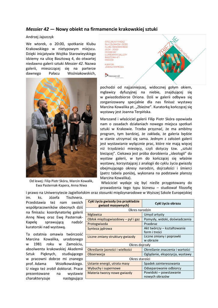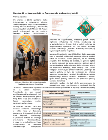 Messier 42 — Nowy obiekt na firmamencie krakowskiej sztuki Andrzej Jajszczyk We wtorek, o 20:00, spotkanie Klubu Krakowskiego w nietypowym miejscu. Dzięki inicjatywie Wojtka Starowieyskiego idziemy na ulicę Basztową 4, do otwartej niedawno galerii sztuki Messier 42. Nazwa galerii, mieszczącej się na parterze dawnego Pałacu Woźniakowskich, pochodzi od najjaśniejszej, widocznej gołym okiem, mgławicy dyfuzyjnej na niebie, znajdującej się w gwiazdozbiorze Oriona. Dziś w galerii odbywa się zorganizowany specjalnie dla nas finisaż wystawy Marcina Kowalika pt. „Zbieżne”. Kuratorką kończącej się wystawy jest Joanna Terpińska. Marszand i właściciel galerii Filip Piotr Skóra opowiada nam o zasadach działaniach nowego miejsca spotkań sztuki w Krakowie. Trzeba przyznać, że ma ambitny program, tym bardziej, że zakłada, że galeria będzie w stanie utrzymać się sama. Jednym z założeń galerii jest wystawianie wyłącznie prac, które nie mają więcej niż trzydzieści miesięcy, czyli dotyczy tzw. „sztuki bieżącej”. Ciekawa jest próba dorobienia „ideologii” do wystaw galerii, w tym do kończącej się właśnie wystawy, korzystającej z analogii do cyklu życia gwiazdy obejmującego okresy narodzin, dojrzałości i śmierci (patrz tabela poniżej, wykonana na podstawie planszy Marcina Kowalika). Od lewej: Filip Piotr Skóra, Marcin Kowalik, Właściciel wydaje się być nieźle przygotowany do Ewa Pasternak-Kapera, Anna Niwa prowadzenia tego typu biznesu – studiował filozofię i prawo na Uniwersytecie Jagiellońskim oraz stosunki międzynarodowe w Wyższej Szkole Europejskiej im. ks. Józefa Tischnera. Przedstawia też nam swoich Cykl życia gwiazdy (na przykładzie Cykl życia obrazu gwiazd masywnych) współpracowników obecnych dziś Okres narodzin na finisażu: koordynatorkę galerii Mgławica Umysł artysty Annę Niwę oraz Ewę Pasternak- Obłok międzygwiazdowy – pył i gaz Pomysły, widoki, doświadczenia Kapelę sprawującą nadzór Protogwiazda Praobraz kuratorski nad wystawą. Akt twórczy – kształtowanie Synteza jądrowa Ta ostatnia omawia twórczość Marcina Kowalika, urodzonego w 1981 roku w Zamościu, absolwenta krakowskiej Akademii Sztuk Pięknych, studiującego w pracowni dobrze mi znanego prof. Adama Wsiołkowskiego. U niego też zrobił doktorat. Prace prezentowane na wystawie charakteryzuje następująco form i treści Liczne zmiany i poprawki w obrazie Okres dojrzały Określanie jasności i wielkości Określanie znaczenia i wartości Obserwacja Oglądanie, ekspozycja, wystawy Okres starości Ustanie energii, utrata masy Spadek zainteresowania Wybuchy i supernowe Odseparowanie odbiorcy Powidoki – powstawanie Materia tworzy nowe gwiazdy nowych obrazów Liczne zmiany struktury gwiazdy i moim zdaniem bardzo trafnie: iluzyjność, kubizm, zdecydowany kolor. Sam artysta bardzo długo i ciekawie opowiada o swoich dwóch obrazach inspirowanych widokiem kościoła w Szczebrzeszynie, a właściwie obrazkiem, pędzla jego ojca, wiszącym w kuchni jego rodzinnego domu. Trzeba przyznać, że wystawione dzieła są bardzo dobre technicznie, co zdarza się coraz rzadziej we współczesnej sztuce. Wszystkie prace są wykonane bardzo starannie, przemyślane, chociaż nie wydają mi się przesadnie oryginalne, co oczywiście nie obniża ich wartości. Marcin Kowalik na szczęście unika pokusy naśladowania geometrycznych prac M. C. Eschera, pełnych złudzeń optycznych. Część prac nasuwa mi skojarzenia z surrealistą René Magrittem, nie tylko z powodu iluzyjności, ale także zdecydowanego użycia koloru (chociaż Magritte lubował się w niebieskim). A kolorowe paski to jako żywo Leon Tarasiewicz. Tyle, że ten ostatni nanosił je na ogół na trójwymiarowych Marcin Kowalik. Obrazy inspirowane bryłach i niezbyt dbał o precyzję wykonania. No cóż, widokiem kościoła w Szczebrzeszynie sztuka nie istnieje w próżni i każde nowe dzieło próbujemy odnosić do tego co już wcześniej widzieliśmy. Nie jestem też zwolennikiem oryginalności za wszelką cenę. Trzeba przyznać, że wrażenie trójwymiarowości uzyskiwane przez Marcina Kowalika na jego płaskich obrazach jest znakomite. Efekt pogłębia sposób nakładania akrylowej farby tak, że widzowi wydaje się jakby fragmenty obrazu były naklejane na podkładowe płótno. Na wystawie jest i praca trójwymiarowa – to coś w rodzaju szkieletu opinającego świecącą zielonkawym światłem rurę. Poza salami, w których prezentowane są prace Marcina Kowalika, w galerii Messier 42 są jeszcze dwie interesujące przestrzenie. Jedna to Galeria komiksu i ilustracji „Łazienka”, znajdująca się rzeczywiście w łazience. Druga to instalacja artysty z Izraela Eliada Orotha pt. „będzie / pojawia się / jest / zanika / było / pozostało?”, której centralną częścią jest piaskownica, a napisy na czarnych ścianach zachęcają do tworzenia „dzieł” z piasku. Ciekawy jestem swoją drogą czy nowa galeria będzie w stanie utrzymać się na konkurencyjnym krakowskim rynku. Za jej sukcesem przemawia profil – sprzedaż prac najnowszych. Tu pewną konkurencją może być „Otwarta Pracownia”, która jednak jest z natury niskobudżetowa, nie nastawiona na zysk i zarządzana bardzo amatorsko. Duży gracz, jeżeli chodzi o sztukę nowoczesną (celowo nie użyłem tu słowa „współczesna”), czyli „Galeria Starmach” koncentruje się na znanych nazwiskach i to raczej z pracami pochodzącymi z XX wieku. Podobnie jest z galerią „Zderzak”, której zakres zainteresowań jest co prawda nieco szerszy, ale jej możliwości wystawiennicze w zaadaptowanym mieszkaniu na piętrze kamienicy przy ul. Floriańskiej 3 są bardzo skromne w porównaniu z Messier 42. Uznana „Jan Fejkiel Gallery” specjalizuje się natomiast we współczesnej grafice i rysunku. Jest oczywiście w Krakowie trochę galerii czysto komercyjnych, nastawionych na mniej wyrobione grono odbi