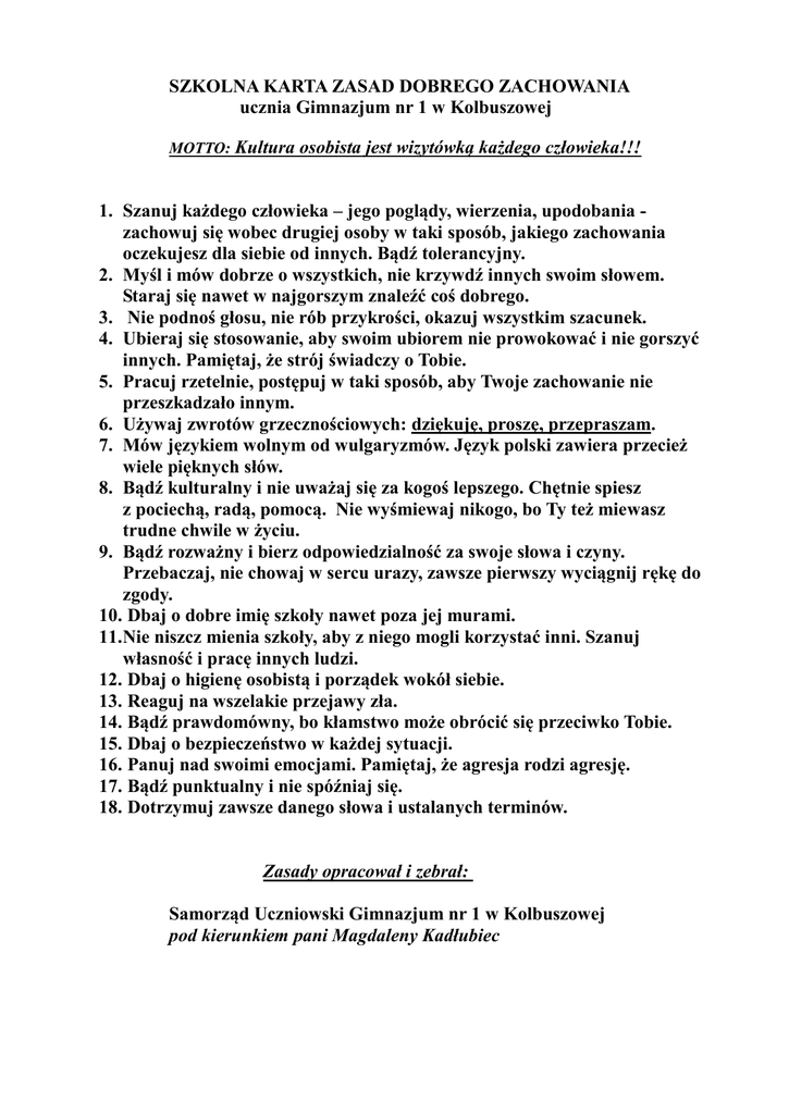 SZKOLNA KARTA ZASAD DOBREGO ZACHOWANIA ucznia Gimnazjum nr 1 w Kolbuszowej MOTTO: Kultura osobista jest wizytówką każdego człowieka!!! 1. Szanuj każdego człowieka – jego poglądy, wierzenia, upodobania zachowuj się wobec drugiej osoby w taki sposób, jakiego zachowania oczekujesz dla siebie od innych. Bądź tolerancyjny. 2. Myśl i mów dobrze o wszystkich, nie krzywdź innych swoim słowem. Staraj się nawet w najgorszym znaleźć coś dobrego. 3. Nie podnoś głosu, nie rób przykrości, okazuj wszystkim szacunek. 4. Ubieraj się stosowanie, aby swoim ubiorem nie prowokować i nie gorszyć innych. Pamiętaj, że strój świadczy o Tobie. 5. Pracuj rzetelnie, postępuj w taki sposób, aby Twoje zachowanie nie przeszkadzało innym. 6. Używaj zwrotów grzecznościowych: dziękuję, proszę, przepraszam. 7. Mów językiem wolnym od wulgaryzmów. Język polski zawiera przecież wiele pięknych słów. 8. Bądź kulturalny i nie uważaj się za kogoś lepszego. Chętnie spiesz z pociechą, radą, pomocą. Nie wyśmiewaj nikogo, bo Ty też miewasz trudne chwile w życiu. 9. Bądź rozważny i bierz odpowiedzialność za swoje słowa i czyny. Przebaczaj, nie chowaj w sercu urazy, zawsze pierwszy wyciągnij rękę do zgody. 10. Dbaj o dobre imię szkoły nawet poza jej murami. 11.Nie niszcz mienia szkoły, aby z niego mogli korzystać inni. Szanuj własność i pracę innych ludzi. 12. Dbaj o higienę osobistą i porządek wokół siebie. 13. Reaguj na wszelakie przejawy zła. 14. Bądź prawdomówny, bo kłamstwo może obrócić się przeciwko Tobie. 15. Dbaj o bezpieczeństwo w każdej sytuacji. 16. Panuj nad swoimi emocjami. Pamiętaj, że agresja rodzi agresję. 17. Bądź punktualny i nie spóźniaj się. 18. Dotrzymuj zawsze danego słowa i ustalanych terminów. Zasady opracował i zebrał: Samorząd Uczniowski Gimnazjum nr 1 w Kolbuszowej pod kierunkiem pani Magdaleny Kadłubiec