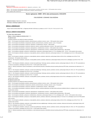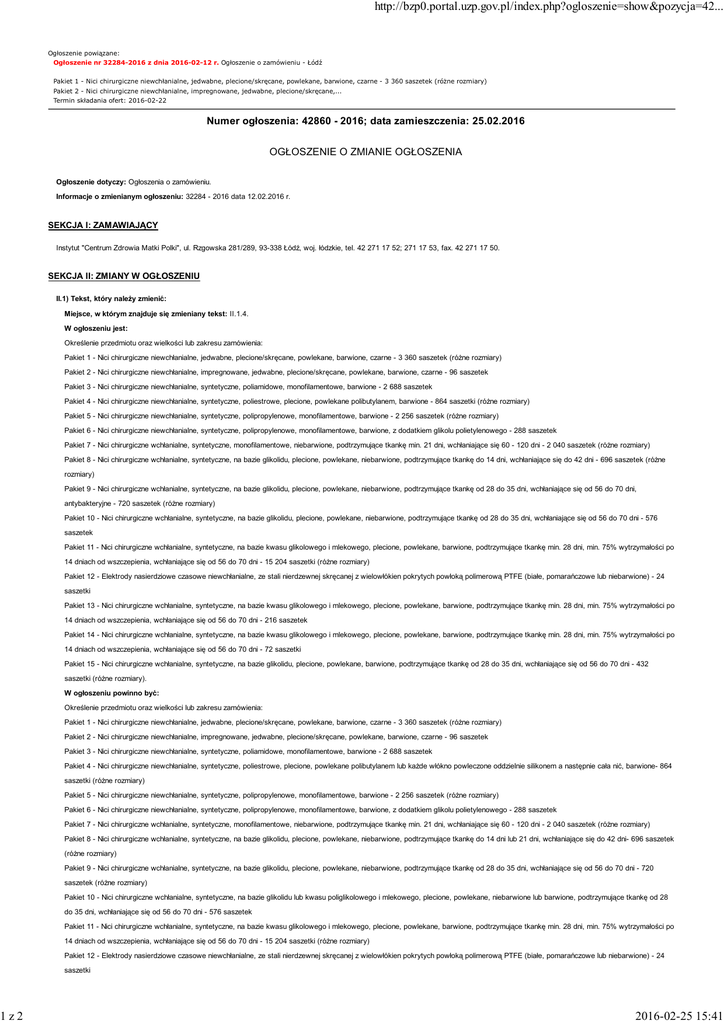 1z2 http://bzp0.portal.uzp.gov.pl/index.php?ogloszenie=show&pozycja=42... Ogłoszenie powiązane: Ogłoszenie nr 32284-2016 z dnia 2016-02-12 r. Ogłoszenie o zamówieniu - Łódź Pakiet 1 - Nici chirurgiczne niewchłanialne, jedwabne, plecione/skręcane, powlekane, barwione, czarne - 3 360 saszetek (róŜne rozmiary) Pakiet 2 - Nici chirurgiczne niewchłanialne, impregnowane, jedwabne, plecione/skręcane,... Termin składania ofert: 2016-02-22 Numer ogłoszenia: 42860 - 2016; data zamieszczenia: 25.02.2016 OGŁOSZENIE O ZMIANIE OGŁOSZENIA Ogłoszenie dotyczy: Ogłoszenia o zamówieniu. Informacje o zmienianym ogłoszeniu: 32284 - 2016 data 12.02.2016 r. SEKCJA I: ZAMAWIAJĄCY Instytut "Centrum Zdrowia Matki Polki", ul. Rzgowska 281/289, 93-338 Łódź, woj. łódzkie, tel. 42 271 17 52; 271 17 53, fax. 42 271 17 50. SEKCJA II: ZMIANY W OGŁOSZENIU II.1) Tekst, który naleŜy zmienić: Miejsce, w którym znajduje się zmieniany tekst: II.1.4. W ogłoszeniu jest: Określenie przedmiotu oraz wielkości lub zakresu zamówienia: Pakiet 1 - Nici chirurgiczne niewchłanialne, jedwabne, plecione/skręcane, powlekane, barwione, czarne - 3 360 saszetek (róŜne rozmiary) Pakiet 2 - Nici chirurgiczne niewchłanialne, impregnowane, jedwabne, plecione/skręcane, powlekane, barwione, czarne - 96 saszetek Pakiet 3 - Nici chirurgiczne niewchłanialne, syntetyczne, poliamidowe, monofilamentowe, barwione - 2 688 saszetek Pakiet 4 - Nici chirurgiczne niewchłanialne, syntetyczne, poliestrowe, plecione, powlekane polibutylanem, barwione - 864 saszetki (róŜne rozmiary) Pakiet 5 - Nici chirurgiczne niewchłanialne, syntetyczne, polipropylenowe, monofilamentowe, barwione - 2 256 saszetek (róŜne rozmiary) Pakiet 6 - Nici chirurgiczne niewchłanialne, syntetyczne, polipropylenowe, monofilamentowe, barwione, z dodatkiem glikolu polietylenowego - 288 saszetek Pakiet 7 - Nici chirurgiczne wchłanialne, syntetyczne, monofilamentowe, niebarwione, podtrzymujące tkankę min. 21 dni, wchłaniające się 60 - 120 dni - 2 040 saszetek (róŜne rozmiary) Pakiet 8 - Nici chirurgiczne wchłanialne, syntetyczne, na bazie glikolidu, plecione, powlekane, niebarwione, podtrzymujące tkankę do 14 dni, wchłaniające się do 42 dni - 696 saszetek (róŜne rozmiary) Pakiet 9 - Nici chirurgiczne wchłanialne, syntetyczne, na bazie glikolidu, plecione, powlekane, niebarwione, podtrzymujące tkankę od 28 do 35 dni, wchłaniające się od 56 do 70 dni, antybakteryjne - 720 saszetek (róŜne rozmiary) Pakiet 10 - Nici chirurgiczne wchłanialne, syntetyczne, na bazie glikolidu, plecione, powlekane, niebarwione, podtrzymujące tkankę od 28 do 35 dni, wchłaniające się od 56 do 70 dni - 576 saszetek Pakiet 11 - Nici chirurgiczne wchłanialne, syntetyczne, na bazie kwasu glikolowego i mlekowego, plecione, powlekane, barwione, podtrzymujące tkankę min. 28 dni, min. 75% wytrzymałości po 14 dniach od wszczepienia, wchłaniające się od 56 do 70 dni - 15 204 saszetki (róŜne rozmiary) Pakiet 12 - Elektrody nasierdziowe czasowe niewchłanialne, ze stali nierdzewnej skręcanej z wielowłókien pokrytych powłoką polimerową PTFE (białe, pomarańczowe lub niebarwione) - 24 saszetki Pakiet 13 - Nici chirurgiczne wchłanialne, syntetyczne, na bazie kwasu glikolowego i mlekowego, plecione, powlekane, barwione, podtrzymujące tkankę min. 28 dni, min. 75% wytrzymałości po 14 dniach od wszczepienia, wchłaniające się od 56 do 70 dni - 216 saszetek Pakiet 14 - Nici chirurgiczne wchłanialne, syntetyczne, na bazie kwasu glikolowego i mlekowego, plecione, powlekane, barwione, podtrzymujące tkankę min. 28 dni, min. 75% wytrzymałości po 14 dniach od wszczepienia, wchłaniające się od 56 do 70 dni - 72 saszetki Pakiet 15 - Nici chirurgiczne wchłanialne, syntetyczne, na bazie glikolidu, plecione, powlekane, barwione, podtrzymujące tkankę od 28 do 35 dni, wchłaniające się od 56 do 70 dni - 432 saszetki (róŜne rozmiary). W ogłoszeniu powinno być: Określenie przedmiotu oraz wielkości lub zakresu zamówienia: Pakiet 1 - Nici chirurgiczne niewchłanialne, jedwabne, plecione/skręcane, powlekane, barwione, czarne - 3 360 saszetek (róŜne rozmiary) Pakiet 2 - Nici chirurgiczne niewchłanialne, impregnowane, jedwabne, plecione/skręcane, powlekane, barwione, czarne - 96 saszetek Pakiet 3 - Nici chirurgiczne niewchłanialne, syntetyczne, poliamidowe, monofilamentowe, barwione - 2 688 saszetek Pakiet 4 - Nici chirurgiczne niewchłanialne, syntetyczne, poliestrowe, plecione, powlekane polibutylanem lub kaŜde włókno powleczone oddzielnie silikonem a następnie cała nić, barwione- 864 saszetki (róŜne rozmiary) Pakiet 5 - Nici chirurgiczne niewchłanialne, syntetyczne, polipropylenowe, monofilamentowe, barwione - 2 256 saszetek (róŜne rozmiary) Pakiet 6 - Nici chirurgiczne niewchłanialne, syntetyczne, polipropylenowe, monofilamentowe, barwione, z dodatkiem glikolu polietylenowego - 288 saszetek Pakiet 7 - Nici chirurgiczne wchłanialne, syntetyczne, monofilamentowe, niebarwione, podtrzymujące tkankę min. 21 dni, wchłaniające się 60 - 120 dni - 2 040 saszetek (róŜne rozmiary) Pakiet 8 - Nici chirurgiczne wchłanialne, syntetyczne, na bazie glikolidu, plecione, powlekane, niebarwione, podtrzymujące tkankę do 14 dni lub 21 dni, wchłaniające się do 42 dni- 696 saszetek (róŜne rozmiary) Pakiet 9 - Nici chirurgiczne wchłanialne, syntetyczne, na bazie glikolidu, plecione, powlekane, niebarwione, podtrzymujące tkankę od 28 do 35 dni, wchłaniające się od 56 do 70 dni - 720 saszetek (róŜne rozmiary) Pakiet 10 - Nici chirurgiczne wchłanialne, syntetyczne, na bazie glikolidu lub kwasu poliglikolowego i mlekowego, plecione, powlekane, niebarwione lub barwione, podtrzymujące tkankę od 28 do 35 dni, wchłaniające się od 56 do 70 dni - 576 saszetek Pakiet 11 - Nici chirurgiczne wchłanialne, syntetyczne, na bazie kwasu glikolowego i mlekowego, plecione, powlekane, barwione, podtrzymujące tkankę min. 28 dni,