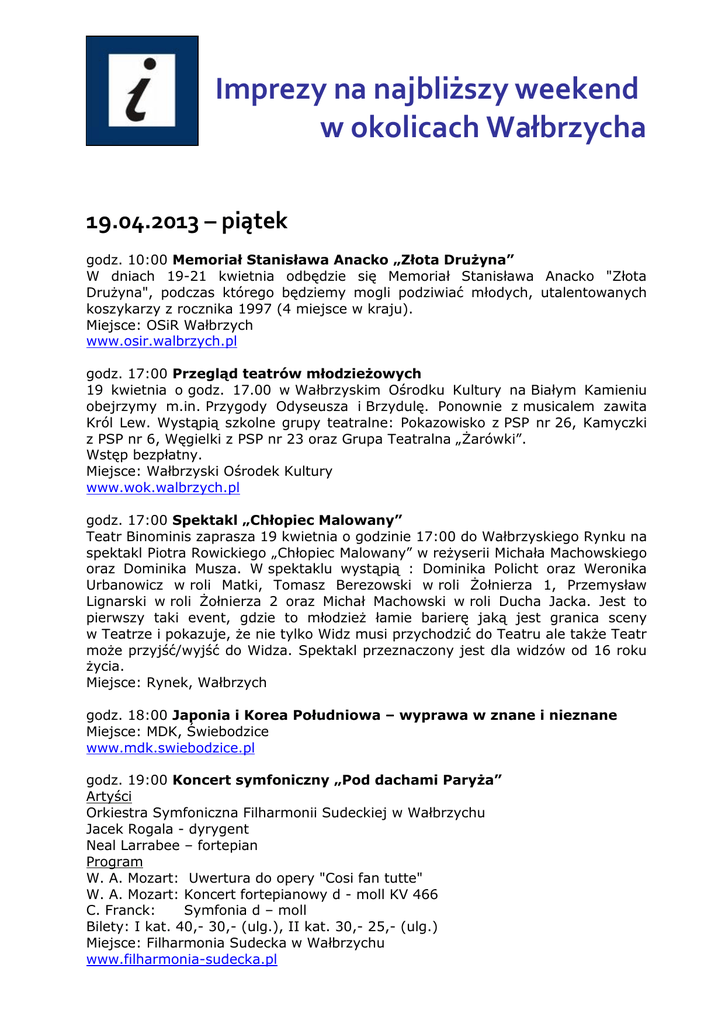 Imprezy na najbliższy weekend w okolicach Wałbrzycha 19.04.2013 – piątek godz. 10:00 Memoriał Stanisława Anacko „Złota Drużyna” W dniach 19-21 kwietnia odbędzie się Memoriał Stanisława Anacko "Złota Drużyna", podczas którego będziemy mogli podziwiać młodych, utalentowanych koszykarzy z rocznika 1997 (4 miejsce w kraju). Miejsce: OSiR Wałbrzych www.osir.walbrzych.pl godz. 17:00 Przegląd teatrów młodzieżowych 19 kwietnia o godz. 17.00 w Wałbrzyskim Ośrodku Kultury na Białym Kamieniu obejrzymy m.in. Przygody Odyseusza i Brzydulę. Ponownie z musicalem zawita Król Lew. Wystąpią szkolne grupy teatralne: Pokazowisko z PSP nr 26, Kamyczki z PSP nr 6, Węgielki z PSP nr 23 oraz Grupa Teatralna „Żarówki”. Wstęp bezpłatny. Miejsce: Wałbrzyski Ośrodek Kultury www.wok.walbrzych.pl godz. 17:00 Spektakl „Chłopiec Malowany” Teatr Binominis zaprasza 19 kwietnia o godzinie 17:00 do Wałbrzyskiego Rynku na spektakl Piotra Rowickiego „Chłopiec Malowany” w reżyserii Michała Machowskiego oraz Dominika Musza. W spektaklu wystąpią : Dominika Policht oraz Weronika Urbanowicz w roli Matki, Tomasz Berezowski w roli Żołnierza 1, Przemysław Lignarski w roli Żołnierza 2 oraz Michał Machowski w roli Ducha Jacka. Jest to pierwszy taki event, gdzie to młodzież łamie barierę jaką jest granica sceny w Teatrze i pokazuje, że nie tylko Widz musi przychodzić do Teatru ale także Teatr może przyjść/wyjść do Widza. Spektakl przeznaczony jest dla widzów od 16 roku życia. Miejsce: Rynek, Wałbrzych godz. 18:00 Japonia i Korea Południowa – wyprawa w znane i nieznane Miejsce: MDK, Świebodzice www.mdk.swiebodzice.pl godz. 19:00 Koncert symfoniczny „Pod dachami Paryża” Artyści Orkiestra Symfoniczna Filharmonii Sudeckiej w Wałbrzychu Jacek Rogala - dyrygent Neal Larrabee – fortepian Program W. A. Mozart: Uwertura do opery "Cosi fan tutte" W. A. Mozart: Koncert fortepianowy d - moll KV 466 C. Franck: Symfonia d – moll Bilety: I kat. 40,- 30,- (ulg.), II kat. 30,- 25,- (ulg.) Miejsce: Filharmonia Sudecka w Wałbrzychu www.filharmonia-sudecka.pl godz. 19:00 „Od Piaf do Garou” – recital Michała Bajora „Od Piaf do Garou” to kolejny recital Michała Bajora promujący jednocześnie nowy podwójny album z piosenkami francuskimi. Od wielu lat publiczność Michała Bajora prosiła o taką płytę i taki koncert. Michał wychował się na piosenkach z nad Sekwany. W roku 1984 Wojciech Młynarski rozwinął te zainteresowania i postawił kropkę nad „i” drogi estradowej artysty. Zaprosił aktora do spektaklu muzycznego pt. ”Brel” w warszawskim teatrze Ateneum. Spektakl stał się wielkim wydarzeniem, a Bajor został okrzyknięty, przez publiczność i krytykę, następcą takich bardów francuskich jak Charles Aznavour, czy Gilbert Becaud. Od tego momentu aktor i piosenkarz poświęcił się prawie całkowicie karierze związanej z muzyką. Stworzył swój własny teatr piosenki podróżując po kraju i świecie z wieloma recitalami. Od 25 lat piszą dla niego najlepsi polscy kompozytorzy i autorzy tekstów, a piosenek tych jest już kilkaset. Artysta zaśpiewa piosenki z repertuaru takich znakomitości muzycznych jak m.in. Edith Piaf, Charles Aznavour, Yves Montand, Gilbert Becaud czy Garou. Wszystkie w tłumaczeniach mistrza Wojciecha Młynarskiego i stylowych aranżacjach Wojciecha Borkowskiego. Opowie również historie związane z wykonawcami i śpiewanymi piosenkami. Zapraszamy na wieczór piosenek lirycznych, melodyjnych, dramatycznych i komediowych. Miejsce: Teatr Miejski, Świdnica godz. 20:00 Koncert zespołów The Modts i SILENTlive w Kamiennej Górze Miejsce: Klub Waleczne Serca, Kamienna Góra godz. 20:00 Recital Leszka Cichońskiego 19 kwietnia w Klubie A'Propos odbędą się warsztaty gitarowe oraz recital Leszka Cichońskiego - znakomitego gitarzysty i wokalisty bluesowego. Bilety: 25 zł przedsprzedaż, 35 zł w dniu koncertu, wstęp wolny dla uczestników warsztatów Miejsce: Klub A’Propos www.aproposclub.pl Cinema City 10:00 Zambezia 10:00, 15:00 Oz: Wielki i Potężny 3D 10:15, 12:15 Kurdowie 10:40, 13:20, 16:00, 18:40, 21:20 Niepamięć 11:00, 14:15, 16:15, 18:30, 20:30, 22:30 Straszny film 5 11:15, 13:30, 15:45, 18:00 Kurdowie 3D 11:30, 16:30, 19:00, 21:45 Układ zamknięty 12:00, 17:00, 20:15, 22:15 Spring Breakers 12:45 Jack pogromca olbrzymów 3D 13:00, 17:30, 19:40, 21:50 Panaceum 14:00, 21:30 Imagine 14:30, 19:15 Intruz 15:20, 17:40, 20:00, 22:20 G.I Joe 2: Odwet 3D 20.04.2013 – sobota godz. 10:00 IV Akademia Kobiet Zainspirowanych – Ekopraktyczni W sobotę, 20 kwietnia o godzinie 10.00 rozpocznie się IV Akademia Kobiet Zainspirowanych. Tym razem tematem rozważań będzie szeroko pojęta ekologia. Gościem honorowym spotkania będzie wiceminister środowiska Stanisław Gawłowski. Miejsce: Hotel Maria www.kobiecanki.pl godz. 10:00 Memoriał Stanisława Anacko „Złota Drużyna” Miejsce: OSiR Wałbrzych www.osir.walbrzych.pl godz. 11:00 Wielkie budowanie z klocków Lego w Galerii Victoria Miejsce: Galeria Victoria www.galeriavictoria.pl godz. 11:00 Motohałda 20-21.04.2013 po raz siódmy w Wałbrzychu odbędzie się MOTOHAŁDA – Mistrzostw Polski Strefy Zachodniej z cyklu CROSS COUNTRY – tym razem jako pierwsze zawody motocyklowe w kraju w sezonie 2013 !!! Tak jak ostatnio, zawody odbędą się w wyjątkowej scenerii wałbrzyskiej góry „Chełmiec” oraz największej na Dolnym Śląsku hałdy „Wiesław”, a zawodnicy wystartują ze stadionu przy ul. Sportowej na Sobięcinie. Miejsce startu: Stadion, ul. Sportowa (Sobięcin) www.motohalda.pl godz. 11:30 Artystyczny weekend – Świat mozaiki Miejsce: Muzeum w Wałbrzychu www.muzeum.walbrzych.pl godz. 12:00 VI Rycerski Bieg na Zamek Grodno Miejsce: Zagórze Śląskie – Centrum www.sport.walim.pl godz. 19:00 Spektakl „Na Boga” - premiera Miejsce: Teatr Dramatyczny im. J. Szaniawskiego w Wałbrzychu www.teatr.walbrzych.pl godz. 20:00 S