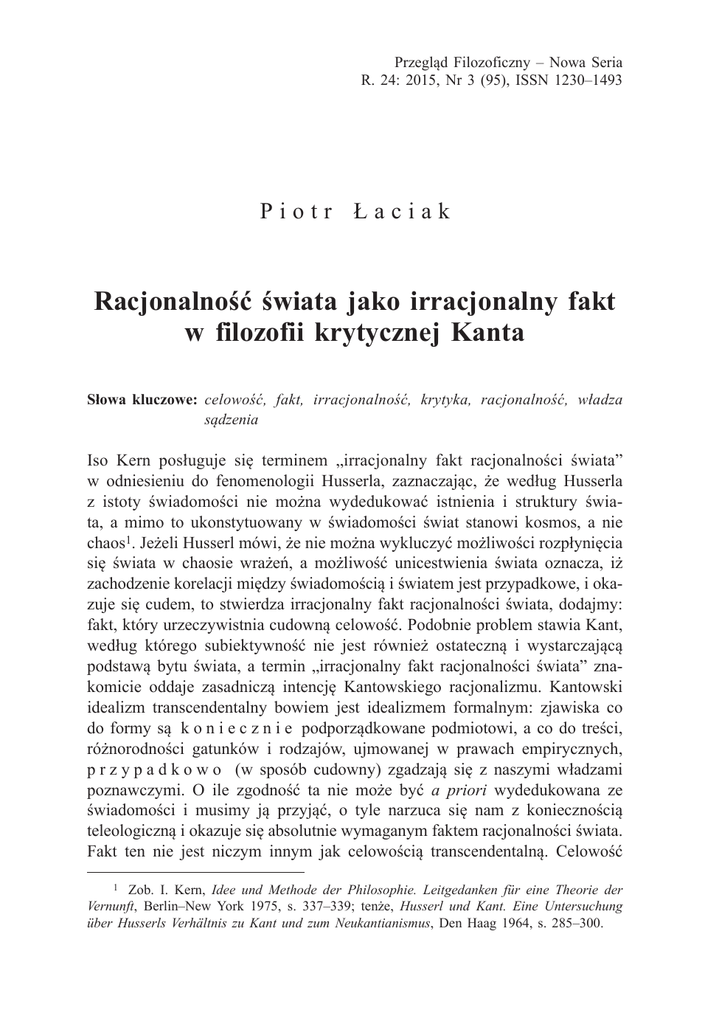 Przegląd Filozoficzny – Nowa Seria R. 24: 2015, Nr 3 (95), ISSN 1230–1493 Piotr Łaciak Racjonalność świata jako irracjonalny fakt w filozofii krytycznej Kanta Słowa kluczowe: celowość, fakt, irracjonalność, krytyka, racjonalność, władza sądzenia Iso Kern posługuje się terminem „irracjonalny fakt racjonalności świata” w odniesieniu do fenomenologii Husserla, zaznaczając, że według Husserla z istoty świadomości nie można wydedukować istnienia i struktury świata, a mimo to ukonstytuowany w świadomości świat stanowi kosmos, a nie chaos1. Jeżeli Husserl mówi, że nie można wykluczyć możliwości rozpłynięcia się świata w chaosie wrażeń, a możliwość unicestwienia świata oznacza, iż zachodzenie korelacji między świadomością i światem jest przypadkowe, i okazuje się cudem, to stwierdza irracjonalny fakt racjonalności świata, dodajmy: fakt, który urzeczywistnia cudowną celowość. Podobnie problem stawia Kant, według którego subiektywność nie jest również ostateczną i wystarczającą podstawą bytu świata, a termin „irracjonalny fakt racjonalności świata” znakomicie oddaje zasadniczą intencję Kantowskiego racjonalizmu. Kantowski idealizm transcendentalny bowiem jest idealizmem formalnym: zjawiska co do formy są k o n i e c z n i e podporządkowane podmiotowi, a co do treści, różnorodności gatunków i rodzajów, ujmowanej w prawach empirycznych, p r z y p a d k o w o (w sposób cudowny) zgadzają się z naszymi władzami poznawczymi. O ile zgodność ta nie może być a priori wydedukowana ze świadomości i musimy ją przyjąć, o tyle narzuca się nam z koniecznością teleologiczną i okazuje się absolutnie wymaganym faktem racjonalności świata. Fakt ten nie jest niczym innym jak celowością transcendentalną. Celowość Zob. I. Kern, Idee und Methode der Philosophie. Leitgedanken für eine Theorie der Vernunft, Berlin–New York 1975, s. 337–339; tenże, Husserl und Kant. Eine Untersuchung über Husserls Verhältnis zu Kant und zum Neukantianismus, Den Haag 1964, s. 285–300. 1 144 Piotr Łaciak bowiem jest wprawdzie zasadą refleksywnej władzy sądzenia, zasadą regulatywną, ale zarazem potwierdza się w doświadczeniu jako fakt zgodności tego, co szczegółowe, z tym, co ogólne. Zgodność przyrody w aspekcie jej szczegółowych, empirycznych praw z naszymi władzami poznawczymi Kant uznaje za fakt niezrozumiały, tak że samą celowość można zinterpretować jako irracjonalny fakt racjonalności świata. Krytyka w perspektywie determinującej i refleksywnej władzy sądzenia Krytyka czystego rozumu (od gr. krinein: rozróżniać, osądzać, rozstrzygać, oddzielać) jest rozróżnianiem możliwości użycia rozumu, osądzaniem ich według kryteriów odnajdowanych w samym procesie rozróżniania i oddzielaniem użycia właściwego od nieuprawnionego. Warunkiem krytycznego myślenia jest wolność bezstronnego osądu, któremu poddaje się rozum, przy czym krytyka rozumu oznacza jego samokrytykę, ponieważ instancją osądzającą rozum jest „wyższy, występujący jako sędzia rozum”2. Owa niczym nieskrępowana wolność oznacza nie tylko niezależność od żywionych bez zastanowienia przesądów, które zniekształcają obraz rzeczywistości, przesądów osłabiających zdolność do bezstronnego osądu rozumu, lecz także – od ogólnych zasad założonych a priori bez uprzedniego zbadania źródeł poznania i jego granic oraz od jednostkowych, empirycznych faktów przyjmowanych również bez przeprowadzenia takiego badania. Gdzie rozpoznaje się jedynie to, co ogólne, w postaci zasad zniewalających nasz umysł, tam nie ma krytyki, lecz jest doktryna czy system, tam z kolei, gdzie konkretne doświadczenie uznaje się za ostateczne kryterium, nie jest również możliwa krytyka, ponieważ doświadczenie tego, co jednostkowe, zostaje potraktowane jako pierwotny fakt bez uprzedniego namysłu nad warunkami jego możliwości3. W przeci2 I. Kant, Krytyka czystego rozumu, przeł. M. Żelazny, w: I. Kant, Dzieła zebrane, t. 2, red. M.A. Chojnacka, M. Marciniak, Toruń 2013, A 739/B 767. Teksty Kanta cytuję według toruńskiego wydania jego Dzieł zebranych. W wypadku Krytyki czystego rozumu podaję numery stron według numeracji wydań oryginalnych (A i B), zaznaczonej na marginesach polskiego przekładu. Przy pozostałych dziełach Kanta numeracja stron poprzedzona cyfrą rzymską, oznaczającą tom, odnosi się do edycji Kants Werke Pruskiej Akademii Nauk, wskazanej również na marginesach polskiego wydania Dzieł zebranych, które wzoruje się na tej edycji. W polskiej edycji dzieł Kanta, w której zamieszczono jedynie teksty skierowane do druku przez samego Kanta, zabrakło niewydanego za jego życia i przywoływanego w artykule Pierwszego wprowadzenia do „Krytyki władzy sądzenia”, które cytuję za przekładem opublikowanym w innym toruńskim wydaniu tekstów teleologicznych Kanta. 3 Zob. A. Baeumler, Das Irrationalitätsproblem in der Ästhetik und Logik des 18. Jahrhunderts bis zur Kritik der Urteilskraft, Darmstadt 1981, s. 6–14. Racjonalność świata jako irracjonalny fakt w filozofii krytycznej Kanta 145 wieństwie do dogmatycznego racjonalizmu, absolutyzującego to, co ogólne, oraz do sceptycznego empiryzmu, gloryfikującego to, co szczegółowe, samą krytykę rozumu można potraktować jako wyodrębnianie i osądzanie korelacji zachodzącej między tym, co ogólne, i tym, co szczegółowe, zgodnie z zasadą, że „rozum jest zdolnością wyprowadzania szczegółu z ogółu”4, a w naszym naukowym myśleniu – żeby się odwołać do Wilhelma Windelbanda5 – podstawowym stosunkiem jest właśnie stosunek między tym, co ogólne, i tym, co szczegółowe. Na temat tej korelacji Kant wypowiada się w „Dodatku do dialektyki transcendentalnej” Krytyki czystego rozumu, odróżniając apodyktyczne użycie rozumu od użycia hipotetycznego: O ile rozum jest zdolnością