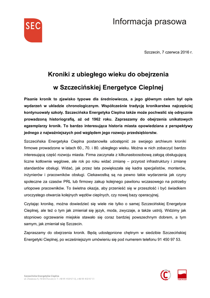 Szczecin, 7 czerwca 2016 r. Kroniki z ubiegłego wieku do obejrzenia w Szczecińskiej Energetyce Cieplnej Pisanie kronik to zjawisko typowe dla średniowiecza, a jego głównym celem był opis wydarzeń w układzie chronologicznym. Współcześnie tradycję kronikarstwa najczęściej kontynuowały szkoły. Szczecińska Energetyka Cieplna także może pochwalić się odręcznie prowadzoną historiografią, aż od 1962 roku. Zapraszamy do obejrzenia unikatowych egzemplarzy kronik. To bardzo interesująca historia miasta opowiedziana z perspektywy jednego z najważniejszych pod względem jego rozwoju przedsiębiorstw. Szczecińska Energetyka Cieplna postanowiła udostępnić ze swojego archiwum kroniki firmowe prowadzone w latach 60., 70. i 80. ubiegłego wieku. Można w nich zobaczyć bardzo interesującą część rozwoju miasta. Firma zaczynała z kilkunastoosobową załogą obsługującą liczne kotłownie węglowe, ale rok po roku widać zmianę – przyrost infrastruktury i zmianę standardów obsługi. Widać, jak przez lata powiększała się kadra specjalistów, monterów, inżynierów i pracowników obsługi. Ciekawostką są na pewno takie wydarzenia jak czyny społeczne za czasów PRL lub firmowy zakup kolejnego pawilonu wczasowego na potrzeby urlopowe pracowników. To świetna okazja, aby przenieść się w przeszłość i być świadkiem uroczystego otwarcia kolejnych węzłów cieplnych, czy nowej bazy operacyjnej. Czytając kronikę, można dowiedzieć się wiele nie tylko o samej Szczecińskiej Energetyce Cieplnej, ale też o tym jak zmieniał się język, moda, zwyczaje, a także ustrój. Widzimy jak stopniowo ogrzewanie miejskie stawało się coraz bardziej powszechnym dobrem, a tym samym, jak zmieniał się Szczecin. Zapraszamy do obejrzenia kronik. Będą udostępnione chętnym w siedzibie Szczecińskiej Energetyki Cieplnej, po wcześniejszym umówieniu się pod numerem telefonu 91 450 97 53.