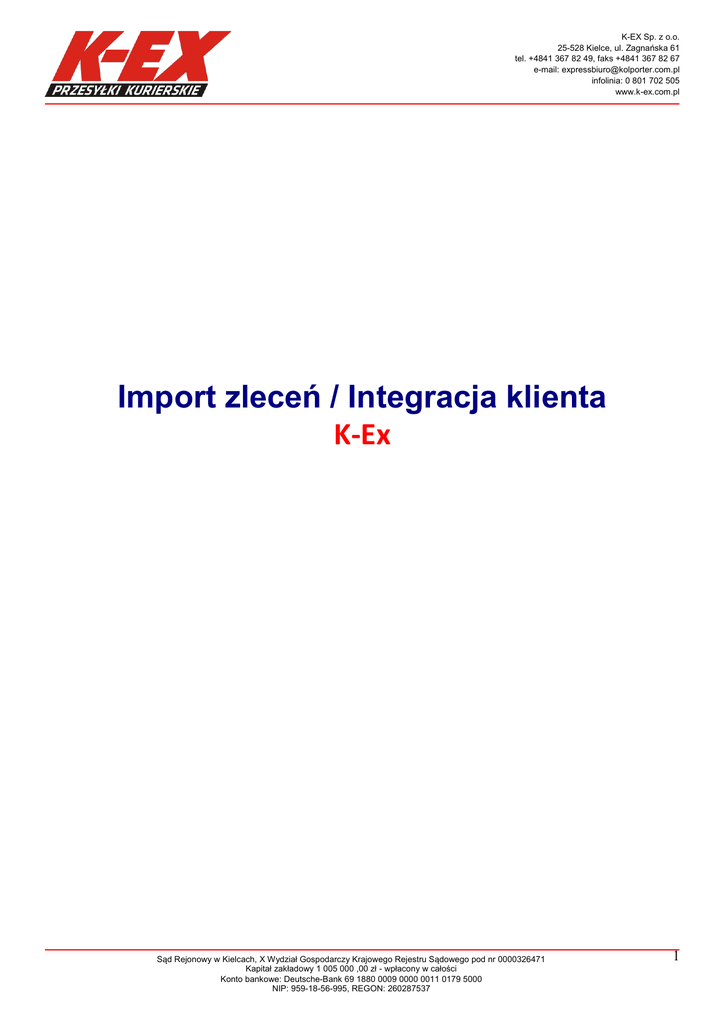 K-EX Sp. z o.o. 25-528 Kielce, ul. Zagnańska 61 tel. +4841 367 82 49, faks +4841 367 82 67 e-mail: [email protected] infolinia: 0 801 702 505 www.k-ex.com.pl Import zleceń / Integracja klienta K-Ex Sąd Rejonowy w Kielcach, X Wydział Gospodarczy Krajowego Rejestru Sądowego pod nr 0000326471 Kapitał zakładowy 1 005 000 ,00 zł - wpłacony w całości Konto bankowe: Deutsche-Bank 69 1880 0009 0000 0011 0179 5000 NIP: 959-18-56-995, REGON: 260287537 1 K-EX Sp. z o.o. 25-528 Kielce, ul. Zagnańska 61 tel. +4841 367 82 49, faks +4841 367 82 67 e-mail: [email protected] infolinia: 0 801 702 505 www.k-ex.com.pl 1 Integracja systemów Klient – K-Ex jako sposobem zwiększenia wydajności tworzenia wysyłki 1.1 Import przesyłek na podstawie pliku CSV Wprowadzenie danych na temat przesyłek do systemu K-Ex, może odbywać się z wykorzystaniem mechanizmu importu pliku csv z danymi wysyłkowymi, za pomocą systemu WWW. Opcja ta dostępna jest w zakładce Przesyłki -> Import przesyłek. Przyciskiem Przeglądaj wskazujemy plik z danymi do importu, po czym potwierdzamy rozpoczęcie procesu wprowadzania zleceń (przycisk Importuj). Prawidłowym źródłem importu jest plik CSV, w którym separatorem pól jest znak ';' (średnik). Plik może zawierać nagłówki kolumn, ale wówczas muszą być one zgodne z podanymi w specyfikacji pliku. Dla pliku z nagłówkami kolejność ułożenia kolumn nie jest istotna. W sytuacji kiedy importowany plik nie zawiera nagłówków kolumn, wówczas rozłożenie danych musi występować wg kolejności zdefiniowanej w specyfikacji pliku, która dostępną jest do pobrania na stronie systemu WWW. Pliku do importu musi być kodowany w UTF-8. Rozwiązanie to pozwala na zarządzanie wysyłką, oraz wydrukiem dokumentacji transportowej z poziomu systemu WWW. Sąd Rejonowy w Kielcach, X Wydział Gospodarczy Krajowego Rejestru Sądowego pod nr 0000326471 Kapitał zakładowy 1 005 000 ,00 zł - wpłacony w całości Konto bankowe: Deutsche-Bank 69 1880 0009 0000 0011 0179 5000 NIP: 959-18-56-995, REGON: 260287537 2 K-EX Sp. z o.o. 25-528 Kielce, ul. Zagnańska 61 tel. +4841 367 82 49, faks +4841 367 82 67 e-mail: [email protected] infolinia: 0 801 702 505 www.k-ex.com.pl 1.2 Integracja systemów przy wykorzystaniu platformy EDI Platforma EDI służy do wymiany danych pomiędzy systemem klienta a systemem K-Ex. Polega na udostępnieniu przez klienta pliku z danymi wymaganymi do stworzenia zlecenia wysyłki. Klienta1 Platforma Klienta2 Serwer e-mail EDI System K-Ex Platforma EDI obsługuje wymianę danych w formacie XML. Dane przekazywane przez klienta w innym, ustalonym formacie, będą przetwarzane przez platformę EDI i przekazywane do systemu K-Ex. Dostępne formaty plików to: XML, CSV, TEXT. 1.2.1 Sposób komunikacji Wymiana komunikatów EDI obywa się w formie plików. W jednym pliku może być zawarty tylko jeden komunikat EDI. Jednak struktura komunikatu EDI może dopuszczać przekazywanie wielu logicznych jednostek danych (np. wielu zleceń). Każdy plik posiada unikalny identyfikator w ramach wymiany danych z konkretnym klientem. Oznacza to, że w ciągu całego działania systemu wymiany danych nie będzie dwóch rożnych plików (co do zawartości) z takim samym identyfikatorem. Unikalność nazw zapewnia oprogramowanie klienta dla plików generowanych przez klienta. Każdy plik posiada unikalny identyfikator. Identyfikator jest tworzony na podstawie typu komunikatu EDI przekazywanego w pliku oraz numeru sekwencyjnego Nazwa pliku: TT_NNNNNNNNNNNN gdzie: • TT – dwa znaki określając typ komunikatu, • NNNNNNNNNNNN – numer sekwencyjny właściwy dla typu komunikatu Na chwilę obecną system posiada następujące typu komunikatów: symbol typu / typ komunikatu EDI 10 zlecenie EXP/LTL 17 trasy Z punktu widzenia transportu, lista typów nie jest istotna. Ważne jest aby zachować format identyfikatora. Przykłady poprawnych identyfikatorów: 10_0000000010000 17_0000002530000 Typ komunikatu informuje system o rodzaju danych przekazywanych na serwer. Najczęściej są to dane na temat zleceń transportowych. Symbolem 10 oznaczone są komunikaty zawierające zlecenia kurierskie oraz paletowe. Numer sekwencyjny może być wartością inkrementowaną, bądź datą wygenerowania (wgrania) komunikatu. Ważne jest aby zachowywał on unikalność. Przykłady poprawnych identyfikatorów: Sąd Rejonowy w Kielcach, X Wydział Gospodarczy Krajowego Rejestru Sądowego pod nr 0000326471 Kapitał zakładowy 1 005 000 ,00 zł - wpłacony w całości Konto bankowe: Deutsche-Bank 69 1880 0009 0000 0011 0179 5000 NIP: 959-18-56-995, REGON: 260287537 3 K-EX Sp. z o.o. 25-528 Kielce, ul. Zagnańska 61 tel. +4841 367 82 49, faks +4841 367 82 67 e-mail: [email protected] infolinia: 0 801 702 505 www.k-ex.com.pl Lub 10_201001121746.exx (10_datagodzina) 10_000000000001.exx (10_wartośćinkrementowana) Wygenerowany przez klienta pliki ze zleceniami, za pomocą FTP, wgrywane są na serwer K-Ex do symbolicznie nazwanego katalogu IN. Pliki są pobierane i przetwarzane na zlecenia umieszczane w systemie K-Ex. Ponieważ transmisja przez FTP nie jest natychmiastowa, konieczne jest zapewnienie, aby pliki nie były dalej przetwarzane przed zakończeniem transferu FTP. Szczegóły procedury opartej na zmianie nazw plików zapisane są poniżej Procedura umieszczania danych w katalogu IN 1. Nazwy plików są tworzone na podstawie identyfikatora pliku i rozszerzenia. 2. Rozszerzenie ‘.exx’ oznacza plik, który jest aktualnie tworzony przez klienta 3. Rozszerzenie ‘.edx’ oznacza plik gotowy do odbioru przez FTP. 4. Algorytm dla klientów (ident_pliku = TT_NNNNNNNNNNNN): a. utworzyć plik ident_pliku.exx z treścią komunikatu EDI, b. gdy plik jest już gotowy, należy umieścić go na serwerze i zmienić nazwę ident_pliku.exx na ident_pliku.edx W trakcie wgrywania pliku powinien mieć on rozszerzenie exx. Po prawidłowym jego wyeksportowaniu, zmieniamy rozszerzenie na .edx Oznacza to 