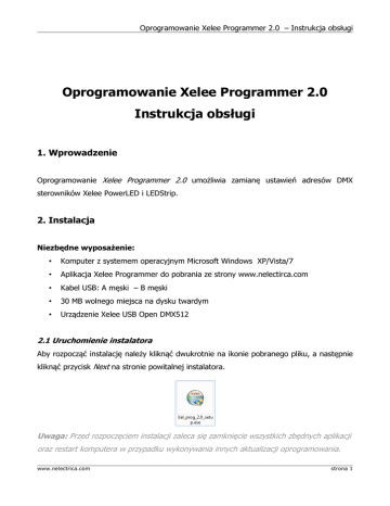 Oprogramowanie Xelee Programmer 2.0 – Instrukcja obsługi Oprogramowanie Xelee Programmer 2.0 Instrukcja obsługi 1. Wprowadzenie Oprogramowanie Xelee Programmer 2.0 umożliwia zamianę ustawień adresów DMX sterowników Xelee PowerLED i LEDStrip. 2. Instalacja Niezbędne wyposażenie: • Komputer z systemem operacyjnym Microsoft Windows XP/Vista/7 • Aplikacja Xelee Programmer do pobrania ze strony www.nelectirca.com • Kabel USB: A męski – B męski • 30 MB wolnego miejsca na dysku twardym • Urządzenie Xelee USB Open DMX512 2.1 Uruchomienie instalatora Aby rozpocząć instalację należy kliknąć dwukrotnie na ikonie pobranego pliku, a następnie kliknąć przycisk Next na stronie powitalnej instalatora. Uwaga: Przed rozpoczęciem instalacji zaleca się zamknięcie wszystkich zbędnych aplikacji oraz restart komputera w przypadku wykonywania innych aktualizacji oprogramowania. www.nelectrica.com strona 1 Oprogramowanie Xelee Programmer 2.0 – Instrukcja obsługi Rys.1. Strona powitalna. 2.2 Warunki licencji Następny ekran przedstawia warunki licencji. Kontynuowanie instalacji możliwe jest po zaakceptowaniu licencji poprzez kliknięcie przycisku I Agree. Rys.2. Warunki licencji. www.nelectrica.com strona 2 Oprogramowanie Xelee Programmer 2.0 – Instrukcja obsługi 2.3 Wybór komponentów Kolejny ekran pozwala na wybór komponentów do zainstalowania, oraz utworzenie skrótów na pulpicie i w menu Programy. Zalecana jest instalacja komponentu FTDI Drivers. Rys.3. Wybór komponentów. 2.4 Folder docelowy Na tym etapie można zmienić domyślny folder instalacji oprogramowania. Rys.4. Wybór folderu docelowego. www.nelectrica.com strona 3 Oprogramowanie Xelee Programmer 2.0 – Instrukcja obsługi Naciśnięcie przycisku Install rozpoczyna kopiowanie plików aplikacji i utworzenie wybranych skrótów. Rys.5. Przebieg instalacji. 2.5 Zakończenie instalacji Ostatni ekran pozwala na zaznaczenie opcji automatycznego uruchomienia programu, lub zakończenie instalatora bez uruchamiania aplikacji. Rys.6. Zakończenie instalacji. www.nelectrica.com strona 4 Oprogramowanie Xelee Programmer 2.0 – Instrukcja obsługi 3. Praca z oprogramowniem Xelee Programmer 3.1 Pierwsze kroki • Podłącz urządzenie Xelee USB do dowolnego nieużywanego portu USB. • Uruchom aplikację Xelee Programmer. Podłączenie urządzenia USB spowoduje wyświetlenie komunikatu Connected w prawym dolnym rogu okna aplikacji. Jeśli wystąpią problemy z połączeniem przejdź do sekcji Rozwiązywanie problemów. Rys.7. Okno aplikacji. • Podłącz Wyjście DMX urządzenia USB do wejścia DMX pierwszego sterownika Xelee w szeregu za pomocą niekrosowanego patchcordu UTP kat. 5. Uwaga: Przy programowaniu ustawień sterowników Xelee, wszystkie inne urządzenia aktywne, jak splittery DMX, kontrolery innych dostawców, itp. powinny zostać wypięte z sieci, pozostawiając tylko szereg urządzeń Xelee. Urządzenia Xelee połączone w topologii magistrali zostaną zaprogramowane tymi samymi ustawieniami. www.nelectrica.com strona 5 Oprogramowanie Xelee Programmer 2.0 – Instrukcja obsługi 3.2 Interfejs programowania ręcznego - Manual Adresy kanałów Pola tekstowe sekcji „Channel addresses” pozwalają na wprowadzenie adresów DMX dla poszczególnych kanałów sterownika Xelee, opisanych jako „Red”, „Green”, „Blue” i „White” (Rys.8). Rys.8. Ustawienia adresów sterownika. Uwaga: Wpisanie adresu „0” spowoduje wyłączenie danego kanału. Ustawienia autoadresowania Pole wyboru tej sekcji (Rys.9) pozwala na wybór pomiędzy wymuszonym trybem autoadresowania (ON/OFF) lub pozostawieniem ustawień zależnych od przełącznika na sterowniku (Use Hardware switch). Rys.9. Wybór trybu autoadresowania. Wybór urządzenia/zakresu urządzeń do programowania Pola tekstowe tej sekcji pozwalają na wybór urządzeń do zaprogramowania wybranymi ustawieniami. Lewe pole określa pierwsze, a prawe ostatnie urządzenie w szeregu, do którego mają zostać zapisane ustawienia. Rys.10. Wybór urządzenia/zakresu urządzeń. www.nelectrica.com strona 6 Oprogramowanie Xelee Programmer 2.0 – Instrukcja obsługi Przyciski komend transmisji Resetuje wszystkie sterowniki Xelee podłączone w szeregu.. Wysyła ustawienia do wybranych urządzeń. Poprawne zapisanie ustawień powoduje ustawienie 50% jasności na kanale „Green” sterowników Xelee. 3.2 Interfejs programowania automatycznego – Auto Rys.11. Karta programowania automatycznego. Adres Bazowy Pole tekstowe (Rys.12), pozwala na wprowadzenie adresu DMX jaki zostanie przypisany pierwszemu kanałowi pierwszego sterownika Xelee w zakresie programowania. Rys.12. Adres bazowy. www.nelectrica.com strona 7 Oprogramowanie Xelee Programmer 2.0 – Instrukcja obsługi Wybór urządzenia/zakresu urządzeń do programowania Pola tekstowe tej sekcji pozwalają na wybór urządzeń do zaprogramowania wybranymi ustawieniami. Lewe pole określa pierwsze, a prawe ostatnie urządzenie w szeregu, do którego mają zostać zapisane ustawienia. Rys.13. Wybór urządzenia/zakresu urządzeń. Ustawienia wersji Automatyczne programowanie może ustawiać adresy urządzeń na trzy możliwe sposoby, zależne od wyboru wersji programowanych sterowników (Rys.14). Rys.14. Wybór wersji sterowników. • RGBW – wybór tej opcji powoduje ustawienie adresów kanałów czerwonego, zielonego, niebieskiego i białego w sposób ciągły, zaczynając od adresu bazowego. Przykład: wprowadzenie adresu bazowego „3” i zakresu urządzeń „2 - 4” spowoduje przypisanie następujących adresów DMX do kanałów urządzeń: - urządzenie 2: czerwony - „3” , zielony - „4” , niebieski - „5” , biały - „6”; - urządzenie 3: czerwony - „7” , zielony - „8” , niebieski - „9” , biały - „10”; - urządzenie 4: czerwony - „11” , zielony - „12” , niebieski - „13” , biały - „14”; • RGB - wybór tej opcji powoduje ustawienie adresów kanałó