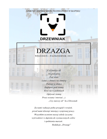 GAZETKA ZESPOŁU SZKÓŁ TECHNICZNYCH W SŁUPSKU DRZAZGA WR ZE SI EŃ—P A ŹD ZI ERN I K 2 0 15 ,,Czy starczy sił Iść pod górę Pod wiatr Latać z chmury na chmurę Patrzeć w słońce Zaglądać pod ziemię Kryć się w jaskiniach Opływać ziemię Przez oceany i morza(…). ,,Czy starczy sił” ks.J.Dzwonek Za nami wakacje pełne przygód i wrażeń, przed nami dziesięć miesięcy wytężonej pracy. Wszystkim uczniom naszej szkoły życzymy wytrwałości w dążeniu do wyznaczonych celów i spełnienia marzeń. Redakcja ,,Drzazgi” WARTO ZWIEDZIĆ…SŁOWIŃSKI PARK NARODOWY Jesteście osobami otwartymi na nowe przygody? Może zamiast spędzać czas przy komputerze bądź innych pochłaniaczach czasu warto by było odwiedzić jeden z najwspanialszych zakątków nad Morzem Bałtyckim ? Nie trzeba daleko szukać, w naszym rejonie można zorganizować naprawdę ciekawe wycieczki. Słowiński Park Narodowy jest znany nie tylko z pięknych widoków, ale również bogatej roślinności różnych gatunków zwierząt oraz nadmorskiego klimatu. Stworzony został dla zachowania w niezmienionym pięknie układu jezior przymorskich, bagien, torfowisk, łąk, nadmorskich borów i lasów, zwłaszcza wydmowego pasa mierzei z unikatowymi w Europie wydmami ruchomymi . Miejscowości wchodzące w obszar parku to: Rąbka, Człuchy, Retowo, Gać, Łokciowice, Czołpino, Gardna Wielka, Gardna Mała, Żarnowska, Kluki, Smołdziński Las, Izbica, Łeba, Rowy, Smołdzino. Teren jest obszerny, dzięki temu możemy zwiedzić naprawdę wiele. Poniżej zamieszczone jest zdjęcie wydm, które znajdują się pomiędzy Łebą a Rowami. Jezioro Gardno: Największym walorem parku jest Morze Bałtyckie. Warto wziąć ze sobą aparat i uwiecznić piękno natury na fotografiach. Najlepsze przygody czekają nas latem. Słońce, woda, spacery… cudownie relaksują. Zimą widok zmrożonych tafli lodu przy ogromnych falach sprawia, że robi się nam jeszcze zimniej, warto jednak zabrać ze sobą kubek gorącej czekolady. Piękno przyrody morskiej jest tak przyciągające, że najniższe temperatury nie przegonią nawet zmarźlaka! Małgorzata Repke kl.IV TDS KĄCIK LITERACKI To już czas, kiedy od nowa musimy wdrożyć się w życie szkoły. Wakacje minęły, ale nie załamujmy się! ;) „Powrót do szkoły” (…)Pogoda wrześniem spojrzała, Trochę się zimniej zrobiło, tak jakby już wyczuwała, że czas wakacji mija. Już w głowie plany nowe, obietnice i przyrzeczenia. Książki i zeszyty gotowe, a lato oblicze swe zmienia. Chłodne noce, krótsze dnie, ranki szare i mgliste, jednak do szkoły się chce myśli są jasne i czyste(…) Wybrała:Nikola Stępień kl.ITDS WITAMY UCZNIÓW KLAS PIERWSZYCH! Teraz nauczyciele będą wymagać od Ciebie większej samodzielności i aktywności. Czeka Cię dużo więcej nauki niż w gimnazjum.. ;) Oto kilka rad, które ułatwią Wam funkcjonowanie w naszej szkole: 1.Ucz się systematycznie, żeby nie mieć zaległości i szybko staraj się poprawiać jedynki (Taa.. Niby oczywiste, ale to prawda :D). 2. Nie spóźniaj się na lekcje (nauczyciele tego strrrasznie nie lubią), bądź kulturalny :P. Twoje zachowanie w szkole jest tak samo ważne, jak oceny. 3. Naucz się uważnego słuchania i robienia notatek. Większość nauczycieli nie będzie już dyktowała. Wyłapuj rzeczy najważniejsze i zapisuj je najlepiej czytelnie i w punktach. 4. Nie bój się pytać, jeżeli czegoś nie wiesz. Pamiętaj, że nie ma głupich pytań. 5. Tutaj nie zaniżają ocen. To w gimnazjum je zawyżali?. Nie załamuj się niższymi ocenami. 6. Picie i palenie nie przysporzy Ci dobrych przyjaźni. Teraz taki szpan jest tępiony. Nie jesteś osobą gorszą od innych, żebyś w ten sposób musiał(a) zwracać na siebie uwagę. 7. Pamiętaj, że aktywność na początku zapewni Ci spokój pod koniec roku. 8. Staraj się nie zwracać zbytniej uwagi na siebie, noś strój czysty, schludny, nie wyzywający. 9. Szanuj siebie, nie daj się poniżać. O pomoc zwracaj się do wychowawcy lub pedagoga szkolnego. 10. Zdarza się tak, że stare przyjaźnie kończą się w gimnazjum. Nie zrażaj się tym, szukaj nowych przyjaciół. 11. Dystans między Tobą a nauczycielem nie jest taki duży, jak Ci się wydaje. Staraj się go zrozumieć tak, jak chciałbyś żeby on zrozumiał Ciebie. 12. Nie poddawaj się pierwszym niepowodzeniom. Nie bądź pesymistą, myśl POZYTYWNIE! Nikola Stępień kl.ITDS POZDROWIENIA - Pozdrawiam Aleksandrę Pytel oraz Sylwię Jędrzejewską - Angelika Pietrzak - Serdeczne pozdrowienia dla pana Mariusza Gorzenia od klasy IV TDS ! - Słodkie buziaki od Bazosa dla Repsona ! - Pozdrowienia dla Magdy Leśniak od tajemniczego wielbiciela. - Całusy dla pięknej i uroczej Klaudii Tatarynowicz - Twój wielbiciel. - Pozdrowienia dla p.prof. Rafała Szamockiego - Pozdrowienia dla p.prof. Alicji Starzeckiej. - Pozdrowienia dla Patryka Roszaka - przesyła Sandra. - Pozdrowienia dla Martyny Jaroszewicz - od Ziomów. - Michał S. przesyła gorące pozdrowienia dla wszystkich pięknych dziewczyn z "Drzewniaka". - Pozdrowienia dla Michała Syrnyka - przesyłają dwie tajemnicze wielbicielki. - Pozdrowienia dla Michała Lipki, Cezarego Mościbrodzkiego, Marcina Murawy oraz Rudego z kl. I TD. - Pozdrowienia dla Alicji Knopik, Agnieszki Maciukiewicz, Kingi Nowak, Nikoli Stępień i Wiktorii Matuszewskiej- przesyłają koleżanki. - Gorące pozdrowienia dla Angeliki Pietrzak od wielbiciela. - Serdeczne pozdrowienia dla Angeliki Bazowskiej i Kingi Głuszek od Gosi. - Pozdrowienia Dla Klaudii Lewandowskiej - Twoja najlepsza koleżanka ! - Pozdrowienia dla Ady Smolińskiej. Małgorzata Repke kl.IV TDS MÓJ PRZEPIS NA…Sernik ,,Złota rosa” Ciasto: -kostka margaryny -3 żółtka -pół szkl.cukru -3 szkl.mąki -2 płaskie łyżeczki proszku do pieczenia -opakowanie cukru waniliowego. Wszystkie składniki zagnieść i wyłożyć ciastem spód oraz boki blachy. Masa: -3 kostki sera -3 jajka -1,5 szk