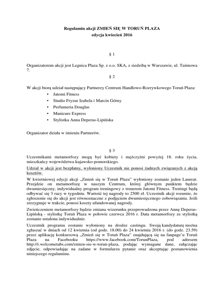 Regulamin akcji ZMIEŃ SIĘ W TORUŃ PLAZA edycja kwiecień 2016 §1 Organizatorem akcji jest Legnica Plaza Sp. z o.o. SKA, z siedzibą w Warszawie, ul. Taśmowa 7. §2 W akcji biorą udział następujący Partnerzy Centrum Handlowo-Rozrywkowego Toruń Plaza: • Jatomi Fitness • Studio Fryzur Izabela i Marcin Górny • Perfumeria Douglas • Manicure Express • Stylistka Anna Deperas-Lipińska Organizator działa w imieniu Partnerów. §3 Uczestnikami metamorfozy mogą być kobiety i mężczyźni powyżej 18. roku życia, mieszkańcy województwa kujawsko-pomorskiego. Udział w akcji jest bezpłatny, wyłoniony Uczestnik nie ponosi żadnych związanych z akcją kosztów. W kwietniowej edycji akcji „Zmień się w Toruń Plaza” wyłoniony zostanie jeden Laureat. Przejdzie on metamorfozę w naszym Centrum, której głównym punktem będzie dwumiesięczny, indywidualny program treningowy z trenerem Jatomi Fitness. Treningi będą odbywać się 3 razy w tygodniu. Wartość tej nagrody to 2500 zł. Uczestnik akcji rozumie, że zgłoszenie się do akcji jest równoznaczne z podjęciem dwumiesięcznego zobowiązania. Jeśli zrezygnuje w trakcie, ponosi koszty ufundowanej nagrody. Zwieńczeniem metamorfozy będzie zmiana wizerunku przeprowadzona przez Annę DeperasLipińską - stylistkę Toruń Plaza w połowie czerwca 2016 r. Data metamorfozy ze stylistką zostanie ustalona indywidualnie. Uczestnik programu zostanie wyłoniony na drodze castingu. Swoją kandydaturę można zgłaszać w dniach od 12 kwietnia (od godz. 18.00) do 24 kwietnia 2016 r. (do godz. 23.59) przez aplikację konkursową „Zmień się w Toruń Plaza” znajdującą się na fanpage’u Toruń Plaza na Facebooku https://www.facebook.com/TorunPlaza, pod adresem http://r.welcometabs.com/zmien-sie-w-torun-plaza, podając wymagane dane, załączając zdjęcie, odpowiadając na zadane w formularzu pytanie oraz akceptując postanowienia niniejszego regulaminu. Aby wziąć udział w akcji „Zmień się w Toruń Plaza” należy zamieścić w aplikacji konkursowej swoje zdjęcie i dokończyć zdanie: W swoim wyglądzie chciałabym/łbym zmienić… Uczestnicy akcji zobowiązani są do wypełnienia pól dodatkowych w formularzu. Należy podać imię i nazwisko, adres e-mail, nr tel. kontaktowego oraz podać swój wiek. Do akcji mogą być zgłaszane tylko zdjęcia, do których przysługują Uczestnikowi nieograniczone autorskie prawa osobiste i majątkowe, a także nienaruszające praw osób trzecich. Do zdjęcia Uczestnik jest zobowiązany dołączyć następujące oświadczenia: „Niniejszym wyrażam zgodę na przetwarzanie danych osobowych w związku z konkursem przez Legnica Plaza Sp. z o.o. SKA, z siedzibą w Warszawie, ul. Taśmowa 7” oraz „Przenoszę na Organizatora konkursu majątkowe prawa autorskie do przesłanego zdjęcia na wszystkich znanych polach eksploatacji”. Zgłoszenie zdjęcia do akcji jest równoznaczne z oświadczeniem Uczestnika, że przysługują mu nieograniczone autorskie prawa osobiste i majątkowe do zdjęcia i że ponosi ona wszelką odpowiedzialność za złamanie tych praw. Komplet wszystkich powyższych elementów nazywany jest zgłoszeniem. Każdy Uczestnik akcji jest uprawniony do wysłania 1 zgłoszenia. Zgłoszenie nie może zawierać treści niecenzuralnych, sprzecznych z prawem, dobrymi obyczajami, naruszać praw osób trzecich, jak również nie może przedstawiać lub opisywać sytuacji lub zdarzeń, które mogą powodować zagrożenie dla zdrowia lub życia ludzi lub zwierząt. Zanim zgłoszenie pojawi się w aplikacji zostanie sprawdzone pod kątem zgodności z zasadami akcji. Wszelkie zgłoszenia zawierające grafiki lub zdjęcia, które nie są tematycznie związane z akcją „Zmień się w Toruń Plaza” będą usuwane. Weryfikacja zgłoszenia może potrwać do 12 godzin. Organizator akcji zastrzega sobie prawo do usunięcia treści wgranych do aplikacji przez Uczestników, które są sprzeczne z treścią Regulaminu, z obowiązującym prawem, naruszają prawa osób trzecich lub też treści obraźliwych, wulgarnych, bądź też zawierających treści dyskryminujące płeć, rasę, narodowość, język, religię, nawołujące do przemocy lub takich, które mają charakter pornograficzny. Komisja konkursowa obradująca w składzie: - Anna Deperas-Lipińska - stylistka Toruń Plaza - Paulina Anikowska - Marketing Manager Toruń Plaza wyłoni Laureata, biorąc pod uwagę: - zgodność zgłoszenia z tematyką konkursu, - oryginalność i kreatywność zgłoszenia. Wyniki zostaną ogłoszone 26 kwietnia 2016 r. na stronie www.torun-plaza.pl oraz na fanpage’u na Facebooku https://www.facebook.com/TorunPlaza. Laureat zostanie poinformowany o wygranej telefonicznie. Metamorfoza rozpocznie się 27 kwietnia i potrwa do 26 czerwca. §4 Program metamorfozy: - realizacja dwumiesięcznego planu treningowego z trenerem Jatomi Fitness - zmiana fryzury w Studio Fryzur Izabela i Marcin Górny - konsultacje z wizażystką i makijaż w Perfumerii Douglas (w przypadku, jeśli laureatką metamorfoz będzie kobieta) - manicure w Manicure Express - zakupy ze stylistką Anną Deperas-Lipińską, na które Uczestnik akcji otrzyma Kartę Podarunkową Toruń Plaza o wartości 500 zł. Wszystkie elementy powyższego programu odbędą się na terenie Centrum HandlowoRozrywkowego Toruń Plaza. §5 Wyłoniony Laureat metamorfoz wyraża zgodę na: - konsultacje i trening z trenerem Jatomi Fitness (3 razy w tygodniu przez dwa miesiące) - zmianę fryzury (możliwe farbowanie, strzyżenie i inne zabiegi fryzjerskie), - wykonanie makijażu przez wizażystkę (w przypadku, jeśli laureatką metamorfoz będzie kobieta), - wykonanie manicure, - przebycie analizy kolorystycznej i stylizacji, - udział w finałowej sesji fotograficznej, - udział w krótkim filmie dokumentującym metamorfozę. §6 Uczestnik akcji wyraża zgodę na wykorzystanie materiału fotograficznego i filmowego z przebiegu metamorfozy do 
