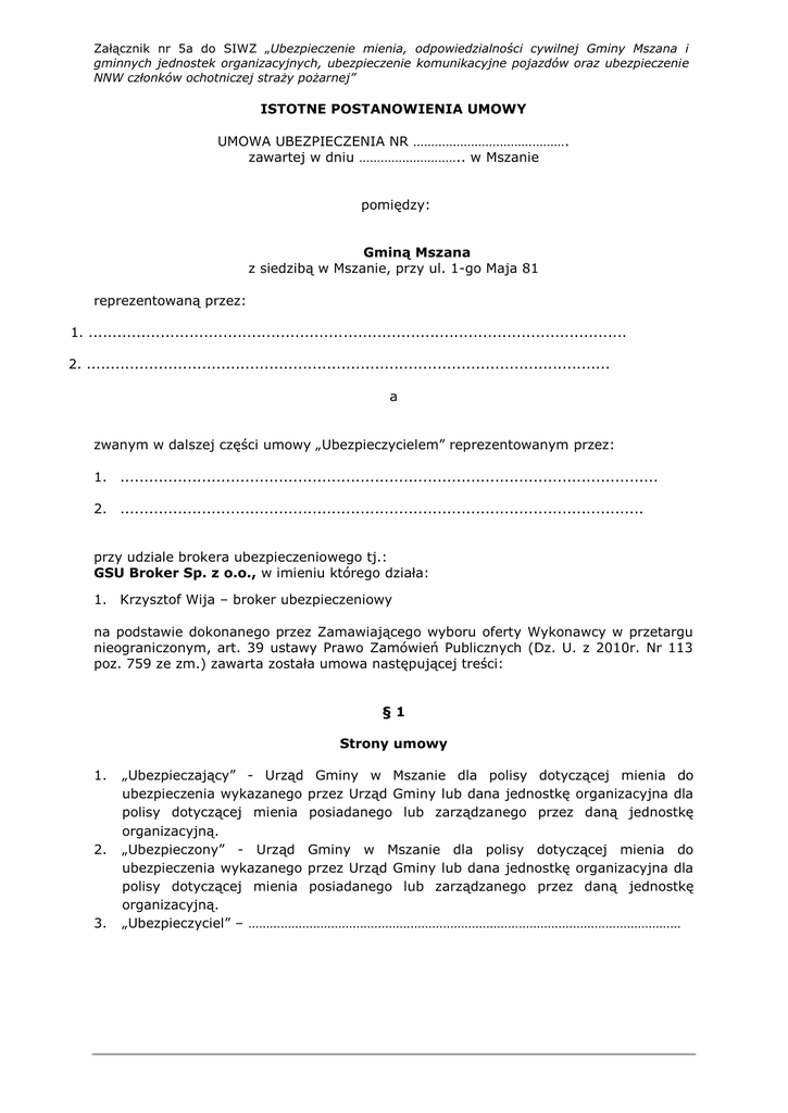 Załącznik nr 5a do SIWZ „Ubezpieczenie mienia, odpowiedzialności cywilnej Gminy Mszana i gminnych jednostek organizacyjnych, ubezpieczenie komunikacyjne pojazdów oraz ubezpieczenie NNW członków ochotniczej straży pożarnej” ISTOTNE POSTANOWIENIA UMOWY UMOWA UBEZPIECZENIA NR ……………………………………. zawartej w dniu ……………………….. w Mszanie pomiędzy: Gminą Mszana z siedzibą w Mszanie, przy ul. 1-go Maja 81 reprezentowaną przez: 1. ................................................................................................................ 2. ............................................................................................................. a zwanym w dalszej części umowy „Ubezpieczycielem” reprezentowanym przez: 1. ................................................................................................................ 2. ............................................................................................................. przy udziale brokera ubezpieczeniowego tj.: GSU Broker Sp. z o.o., w imieniu którego działa: 1. Krzysztof Wija – broker ubezpieczeniowy na podstawie dokonanego przez Zamawiającego wyboru oferty Wykonawcy w przetargu nieograniczonym, art. 39 ustawy Prawo Zamówień Publicznych (Dz. U. z 2010r. Nr 113 poz. 759 ze zm.) zawarta została umowa następującej treści: §1 Strony umowy 1. 2. 3. „Ubezpieczający” - Urząd Gminy w Mszanie dla polisy dotyczącej mienia do ubezpieczenia wykazanego przez Urząd Gminy lub dana jednostkę organizacyjna dla polisy dotyczącej mienia posiadanego lub zarządzanego przez daną jednostkę organizacyjną. „Ubezpieczony” - Urząd Gminy w Mszanie dla polisy dotyczącej mienia do ubezpieczenia wykazanego przez Urząd Gminy lub dana jednostkę organizacyjna dla polisy dotyczącej mienia posiadanego lub zarządzanego przez daną jednostkę organizacyjną. „Ubezpieczyciel” – ………………………………………………………………………………………………………… Załącznik nr 5a do SIWZ „Ubezpieczenie mienia, odpowiedzialności cywilnej Gminy Mszana i gminnych jednostek organizacyjnych, ubezpieczenie komunikacyjne pojazdów oraz ubezpieczenie NNW członków ochotniczej straży pożarnej” §2 Przedmiot ubezpieczenia Przedmiotem jest ubezpieczenie Gminy Mszana i gminnych jednostek organizacyjnych w zakresie: - ubezpieczenia mienia od ognia i innych zdarzeń losowych, - ubezpieczenia mienia od kradzieży z włamaniem i rabunku z ryzykiem dewastacji, - ubezpieczenia sprzętu elektronicznego, - ubezpieczenia maszyn od uszkodzeń/awarii (MB), - ubezpieczenia maszyn i urządzeń (CPM) - ubezpieczenia oszklenia, - ubezpieczenia odpowiedzialności cywilnej Szczegółowy wykaz przedmiotu ubezpieczenia zawarty został w Załączniku nr 4a do SIWZ. §3 Obowiązki stron Ubezpieczyciel zobowiązany jest do zawarcia polis ubezpieczenia odpowiedzialności cywilnej oraz ubezpieczenia mienia zarządzanego przez Gminę Mszana i gminne jednostki organizacyjne wskazane w opisie przedmiotu zamówienia (OPZ) na warunkach wskazanych w ogólnych warunkach Ubezpieczenia (OWU), i niniejszej umowie. Szczegółowy zakres ochrony dla Gminy Mszana i poszczególnych jednostek organizacyjnych zawarty został w Załączniku nr 2 do SIWZ. W tym celu Ubezpieczyciel zobowiązany jest: a) przekazać GSU Broker Sp. z o.o. w terminie do 7 dni od daty zawarcia niniejszej umowy polisy ubezpieczeniowe wystawione na podmioty zgodnie z zakresem i warunkami wskazanymi w niniejszej umowie: - Urząd Gminy w Mszanie ul. 1 Maja 81, 44-325 Mszana, - jednostki organizacyjne Urzędu Gminy w Mszanie, b) jeżeli wystąpi zagrożenie, że Ubezpieczyciel pomimo próby nie zdoła skutecznie zawrzeć polisy winien zaproponować GSU Broker Sp. z o.o., która zobowiązana jest ze strony Ubezpieczonego do koordynacji procesu zawierania polis ubezpieczenia, propozycję automatycznego ubezpieczenia zakresu dla którego nie przygotowano polis do czasu ich przygotowania. c) po zakończeniu procesu zawierania polis Ubezpieczający przekaże Ubezpieczycielowi, za pośrednictwem GSU Broker sp. z o.o., kopię wszystkich zawartych polis. 2. Ubezpieczony jest zobowiązany do zweryfikowania otrzymanych polis. 3. Ubezpieczyciel jest zobowiązany do uwzględnienia w harmonogramie prac, przerwy świąteczne w pracy jednostek organizacyjnych, zwłaszcza placówek oświatowych. 4. Ubezpieczyciel zobowiązany jest zachować w tajemnicy wszelkie informacje, w których posiadanie wszedł wykonując zamówienie. §4 Warunki ubezpieczenia 1. Polisy ubezpieczeń o których mowa w §3 obejmują następujące rodzaje ubezpieczeń: 1) ubezpieczenie mienia od ognia i innych zdarzeń losowych: Załącznik nr 5a do SIWZ „Ubezpieczenie mienia, odpowiedzialności cywilnej Gminy Mszana i gminnych jednostek organizacyjnych, ubezpieczenie komunikacyjne pojazdów oraz ubezpieczenie NNW członków ochotniczej straży pożarnej” a. suma ubezpieczenia: wg wartości początkowej brutto lub odtworzeniowej, gotówka wartość nominalna, b. system ubezpieczenia: gotówka, mienie niskocenne, nakłady inwestycyjne na pierwsze ryzyko; pozostałe mienie na sumy stałe, c. zakres ubezpieczenia: ogień, uderzenie pioruna, wybuch, upadek statku powietrznego, następstwa szkód wodno-kanalizacyjnych, huragan (prędkość nie mniejsza niż 17,5 m/s), powódź – limit odpowiedzialności 1,0 mln PLN na jedno i wszystkie zdarzenia w okresie ubezpieczenia, grad, osuwanie się ziemi, lawina, uderzenie pojazdu, napór śniegu lub lodu, topnienie śniegu lub lodu, deszcz nawalny (współczynnik wydajności co najmniej 4 wg. IM i GW) – limit odpowiedzialności 1,0 mln PLN na jedno i wszystkie zdarzenia w okresie ubezpieczenia, dym, sadza, trzęsienie ziemi, huk ponaddźwiękowy, działanie mrozu, przewrócenie się lub upadek drzewa, zalanie przez wydostanie się wody, innych cieczy lub pary z urządzeń wodno-kanalizacy