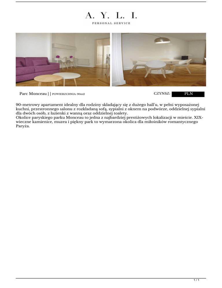 Parc Monceau | | POWIERZCHNIA: 90m2 CZYNSZ: PLN 90-metrowy apartament idealny dla rodziny składający się z dużego hall'u, w pełni wyposażonej kuchni, przestronnego salonu z rozkładaną sofą, sypialni z oknem na podwórze, oddzielnej sypialni dla dwóch osób, z łazienki z wanną oraz oddzielnej toalety. Okolice paryskiego parku Monceau to jedna z najbardziej prestiżowych lokalizacji w mieście. XIXwieczne kamienice, muzea i piękny park to wymarzona okolica dla miłośników romantycznego Paryża. 1/1 Powered by TCPDF (www.tcpdf.org)
