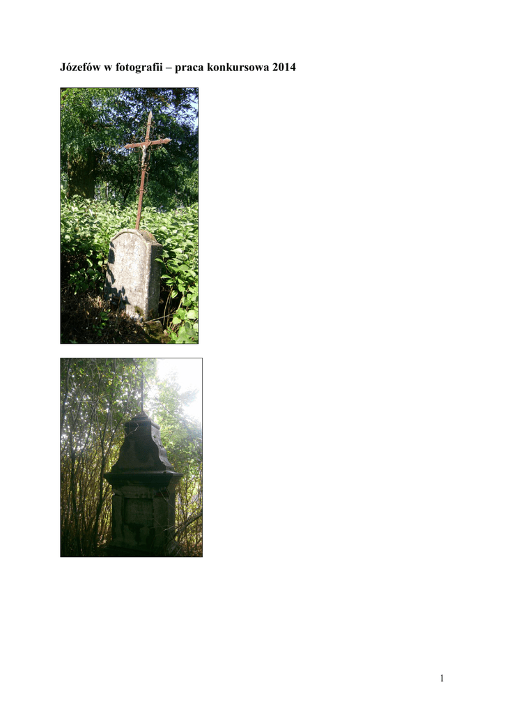 Józefów w fotografii – praca konkursowa 2014 1 Fot. 1, 2, 3. Nagrobki z cmentarza Ewangelicko-Augsburskiego (foto. A. Reślińska – 2011 r.) Fot. 4. W tym budynku mieściła się szkoła. (foto. A. Reślińska – 2011 r.) Fot. 5. Dom z 1912 r. (foto. A. Reślińska – 2011 r.) 2 Fot. 6. Dom drewniany kryty strzechą. (foto. A. Reślińska – 2011 r.) Fot. 7. Studnia z żurawiem. (foto. A. Reślińska – 2011 r.) 3 Fot. 8. Hodowla bydła mięsnego. (foto. A. Reślińska – 2011 r.) Fot. 9. Żniwa w 2011 r. (foto. A. Reślińska – 2011 r.) Fot. 10. Żuraw gniazdujący na terenie Józefowa. (foto. A. Reślińska – 2011 r.) 4 Fot. 11. Wioska indiańska. (foto. A. Reślińska – 2011 r.) Fot. 12. Stado danieli. (foto. M. Michniacki – 2011 r.) Fot. 13. W tym domu mieściło się więzienie. (foto. M. Nowak – 1980 r.) 5 Fot. 14. Gliniany budynek gospodarczy położony na terenie dawnej szkoły. (foto. M. Nowak – 1980 r.) Fot. 15. Fragment starej zagrody. (foto. M. Nowak) 6 Fot. 16. Nauczycielka pani Niewiadomska. (foto. K. Kamiński) Fot. 17. Zaprzęg konny. (foto. K. Kamiński) Fot. 18. Stodoła drewniana kryta strzechą z gniazdem bocianim. (foto. K. Kamiński) Fot. 19. Prace polowe. (foto. M. Nowak) 7 Fot. 20. Uczniowie w ogródku szkolnym. (foto. Cz. Szymczak – lata 40.) Fot. 20. Cyganie koczujący w Józefowie na „Planach”. (foto. K. Rybarczyk – 1946 r.) Fot. 21. Dzieci na boisku. (foto M. Nowak.) 8 9