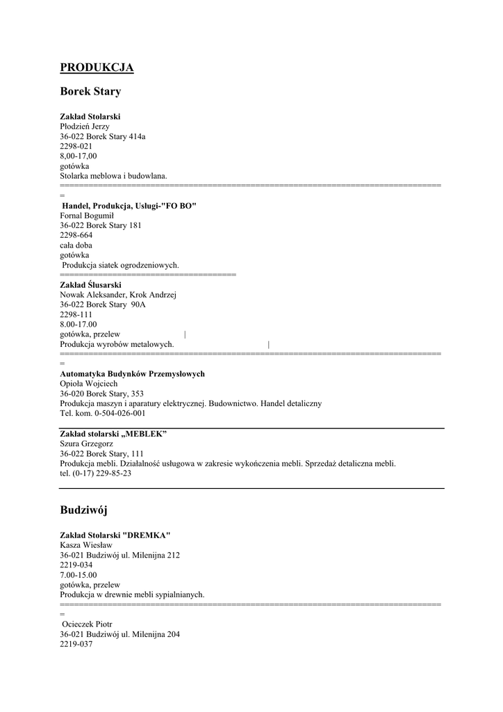 PRODUKCJA Borek Stary Zakład Stolarski Płodzień Jerzy 36-022 Borek Stary 414a 2298-021 8,00-17,00 gotówka Stolarka meblowa i budowlana. ================================================================================ = Handel, Produkcja, Usługi-"FO BO" Fornal Bogumił 36-022 Borek Stary 181 2298-664 cała doba gotówka Produkcja siatek ogrodzeniowych. ===================================== Zakład Ślusarski Nowak Aleksander, Krok Andrzej 36-022 Borek Stary 90A 2298-111 8.00-17.00 gotówka, przelew | Produkcja wyrobów metalowych. | ================================================================================ = Automatyka Budynków Przemysłowych Opioła Wojciech 36-020 Borek Stary, 353 Produkcja maszyn i aparatury elektrycznej. Budownictwo. Handel detaliczny Tel. kom. 0-504-026-001 Zakład stolarski „MEBLEK” Szura Grzegorz 36-022 Borek Stary, 111 Produkcja mebli. Działalność usługowa w zakresie wykończenia mebli. SprzedaŜ detaliczna mebli. tel. (0-17) 229-85-23 Budziwój Zakład Stolarski "DREMKA" Kasza Wiesław 36-021 Budziwój ul. Milenijna 212 2219-034 7.00-15.00 gotówka, przelew Produkcja w drewnie mebli sypialnianych. ================================================================================ = Ocieczek Piotr 36-021 Budziwój ul. Milenijna 204 2219-037 7.00-20.00 gotówka | Wyrób elementów ogrodzeniowych. ================================================================================ = P.P.U.H "STANBES" Głodowski Stanisław 36-021 Budziwój ul. Kwiatowa 7 2219-875 gotówka, przelew Produkcja, handel, usługi Eksport - Import. ================================================ AT-BI Bijak Jacek, Hakalla Łukasz 36-021 Budziwój ul. J.Pawła II 267 2219-198 8.00-16.00 gotówka, przelew | Konstrukcje aluminiowe, przetwórstwo tworzyw sztucznych. Reklama wizualna. ===================================== ART-METAL Paśkiewicz Marzena 36-021 Budziwój ul.Ks. Kowalskiego 10 2219-969 8.00-19.00 gotówka Warsztat metaloplastyczny - wytwarzanie z metalu przedmiotów dekoracyjnych i uŜytkowych. ==================================================================== P.P.H.U."MEB-SAM" Noga Mariusz 36-021 Budziwój ul. Milenijna 25 2219-831, 0693-402-073 8.00-18.00 gotówka, przelew | Renowacja i wykonawstwo tapicerki meblowo-samochodowej. | ================================================================================ = Mitał Janusz 36-021 Budziwój ul.Ks.J.Kowalskiego 123 2219-829 35-001 Rzeszów ul. ul. Piłsudskiego 34 Produkcja, handel, usługi. ================================================================================ = Biała Zakład Stolarski Rak Franciszek 36-020 Tyczyn, Biała 352 2299-039 gotówka Stolarstwo remontowo- budowlane. ========================================== Firma MASTER PACK Grzesik Janusz | 36-020 Tyczyn, Biała 538 2299-293 7.00-15.00 Rzeszów ul. Lubelska 46 7.00-15.00, sob. 7.00-12.00 gotówka, przelew Produkcja opakowań ===================================================================== Usługi-Produkcja-Handel Rozborska Teresa 36-020 Tyczyn, Biała 8 2299-075 Produkcja i sprzedaŜ wyrobów z wikliny. ====================================================== Firma PAMA - PAK Pacześniak Antoni 36-020 Tyczyn, Biała 252 2299-200, 606-344-011 8.00-17.00 przelew, gotówka Produkcja, handel, usługi w zakresie opakowań tekturowych. ================================================================================ = Zakład Produkcyjno - Handlowy "ROJ" Roj Ludwika 36-020 Tyczyn, Biała 41 2299-220 7.00-20.00 przelew, gotówka | Produkcja i sprzedaŜ artykułów z tworzyw sztucznych dla budownictwa. | | ================================================================================ = Gabinet Protetyki Stomatologicznej Łukasz Pazdan Pazdan Łukasz 36-020 Tyczyn, Biała 375 Produkcja sprzętu medycznego i chirurgicznego oraz przyrządów ortopedycznych, mebli medycznych. tel. (0-17) 229-36-40 Firma ResWind Micał Marta 36-020 Tyczyn, Biała 167 Produkcja wyrobów z tworzyw sztucznych, wyrobów stolarskich i ciesielskich dla budownictwa, opakowań drewnianych, wyrobów z papieru i tektury, produkcja mebli. brak nr.tel JAR-Pak Walat Jarosław 36-020 Tyczyn, Biała 181 Produkcja opakowań z tworzyw sztucznych, handel hurtowy, komisowy i detaliczny tel. (0-17) 229-92-93 BM-FOLIE Andrzej Walat 36-020 Tyczyn, Biała 181 36-042 Lubenia, Siedliska 439 36-040 Boguchwała, Kolejowa 15 Produkcja opakowań z tworzyw sztucznych. Handel hurtowy, komisowy i detaliczny. tel. (0-17) 229-18-16 Hermanowa Zakład Produkcyjno- Uslugowo- Handlowy "AGAMIK" Domino Jerzy 36-020 Tyczyn, Hermanowa 417 2219-760, 2291-765 7.00-15.00 przelew, gotówka | Wytwarzanie art.z tworzyw sztucznych. Działalność krawiecka i usługi doradcze w zakresie wzornictwa przemysłowego kroju i szycia. Działalność handlowa art. branŜy przemysłowej. ================================================================================ = ART FORM - Artystyczne Formy Mebli Malak Grzegorz Hul Grzegorz 36-020 Tyczyn, Hermanowa 96 tel. (0-17) 2291-043 9.00-17.00 przelew, gotówka Produkcja i sprzedaŜ mebli. ================================================================================ = ART- FORM Malak Marta 36-020 Tyczyn, Hermanowa 96 2291-043 8.00-17.00 przelew, gotówka Produkcja, handel, usługi a w szczególności produkcja i montaŜ mebli. ================================================================= Art Form Marta Malak 36-020 Tyczyn, Hermanowa 96 Produkcja mebli, handel hurtowy i detaliczny tel. (0-17) 229-19-63 „RESBRAM” Perełka Krzysztof 36-020 Tyczyn, Hermanowa 96 Produkcja gotowych wyrobów metalowych. SprzedaŜ detaliczna nowych towarów w wyspecjalizowanych sklepach. Wznoszenie kompletnych budynków i budowli lub ich części; inŜynieria lądowa i wodna. tel.(0-17) 229-10-39 Tyczyn Zakład Stolarski Błoński Edward 36-020 Tyczyn ul. Orkana 5 7.00-17.00 sob.7.00-15.00 Produkcja i sprzedaŜ mebli tapicerowanych i krzeseł toczonych. =====================================