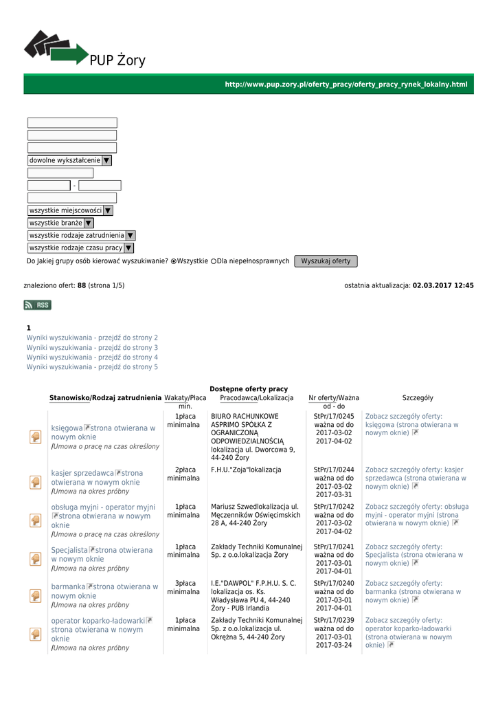 PUP Żory http://www.pup.zory.pl/oferty_pracy/oferty_pracy_rynek_lokalny.html Ukryj wyszukiwarke dowolne wykształcenie ▼ wszystkie miejscowości ▼ wszystkie branże ▼ wszystkie rodzaje zatrudnienia ▼ wszystkie rodzaje czasu pracy ▼ Do Jakiej grupy osób kierować wyszukiwanie? Wszystkie Dla niepełnosprawnych Wyszukaj oferty znaleziono ofert: 88 (strona 1/5) ostatnia aktualizacja: 02.03.2017 12:45 1 Wyniki wyszukiwania - przejdź do strony 2 Wyniki wyszukiwania - przejdź do strony 3 Wyniki wyszukiwania - przejdź do strony 4 Wyniki wyszukiwania - przejdź do strony 5 Dostępne oferty pracy Stanowisko/Rodzaj zatrudnienia Wakaty/Płaca Pracodawca/Lokalizacja min. 1płaca BIURO RACHUNKOWE minimalna ASPRIMO SPÓŁKA Z księgowa strona otwierana w OGRANICZONĄ nowym oknie ODPOWIEDZIALNOŚCIĄ /Umowa o pracę na czas określony lokalizacja ul. Dworcowa 9, 44-240 Żory Nr oferty/Ważna Szczegóły od - do StPr/17/0245 Zobacz szczegóły oferty: ważna od do księgowa (strona otwierana w 2017-03-02 nowym oknie) 2017-04-02 kasjer sprzedawca strona otwierana w nowym oknie /Umowa na okres próbny 2płaca minimalna F.H.U."Zoja"lokalizacja StPr/17/0244 ważna od do 2017-03-02 2017-03-31 Zobacz szczegóły oferty: kasjer sprzedawca (strona otwierana w nowym oknie) obsługa myjni - operator myjni strona otwierana w nowym oknie /Umowa o pracę na czas określony 1płaca minimalna Mariusz Szwedlokalizacja ul. Męczenników Oświęcimskich 28 A, 44-240 Żory StPr/17/0242 ważna od do 2017-03-02 2017-04-02 Zobacz szczegóły oferty: obsługa myjni - operator myjni (strona otwierana w nowym oknie) Specjalista strona otwierana w nowym oknie /Umowa na okres próbny 1płaca minimalna Zakłady Techniki Komunalnej Sp. z o.o.lokalizacja Żory StPr/17/0241 ważna od do 2017-03-01 2017-04-01 Zobacz szczegóły oferty: Specjalista (strona otwierana w nowym oknie) barmanka strona otwierana w nowym oknie /Umowa na okres próbny 3płaca minimalna I.E."DAWPOL" F.P.H.U. S. C. lokalizacja os. Ks. Władysława PU 4, 44-240 Żory - PUB Irlandia StPr/17/0240 ważna od do 2017-03-01 2017-04-01 Zobacz szczegóły oferty: barmanka (strona otwierana w nowym oknie) operator koparko-ładowarki strona otwierana w nowym oknie /Umowa na okres próbny 1płaca minimalna Zakłady Techniki Komunalnej Sp. z o.o.lokalizacja ul. Okrężna 5, 44-240 Żory StPr/17/0239 ważna od do 2017-03-01 2017-03-24 Zobacz szczegóły oferty: operator koparko-ładowarki (strona otwierana w nowym oknie) Stanowisko/Rodzaj zatrudnienia Wakaty/Płaca Pracodawca/Lokalizacja min. 1płaca LUXURY CLINIC asystentka minimalna STOMATOLOGIA I MEDYCYNA stomatologiczna/higienistka ESTETYCZNA ALEKSANDRA stomatologiczna strona LAMPART-ROŻEKlokalizacja otwierana w nowym oknie al. Wojska Polskiego 3, /Umowa o pracę na czas określony 44-240 Żory Szczegóły Zobacz szczegóły oferty: asystentka stomatologiczna/higienistka stomatologiczna (strona otwierana w nowym oknie) magazynier strona otwierana w nowym oknie /Umowa na okres próbny 1płaca minimalna PT DYSTRYBUCJA SPÓŁKA AKCYJNAlokalizacja ul. Boczna 8 m. budynek 5, 44-240 Żory StPr/17/0237 ważna od do 2017-03-01 2017-04-01 Zobacz szczegóły oferty: magazynier (strona otwierana w nowym oknie) dietetyk strona otwierana w nowym oknie /Umowa o pracę na czas określony 1płaca minimalna SuperSlim Kinga Kuśka lokalizacja al. Wojska Polskiego 1 m. C, 44-240 Żory StPr/17/0236 ważna od do 2017-03-01 2017-04-30 Zobacz szczegóły oferty: dietetyk (strona otwierana w nowym oknie) pomocnik linii produkcyjnej strona otwierana w nowym oknie /Umowa na okres próbny 1płaca minimalna WB TRIM TECH SPÓŁKA Z OGRANICZONĄ ODPOWIEDZIALNOŚCIĄ lokalizacja ul. Wodzisławska 191 m. A, 44-245 Żory StPr/17/0233 ważna od do 2017-03-01 2017-04-01 Zobacz szczegóły oferty: pomocnik linii produkcyjnej (strona otwierana w nowym oknie) barista/kelner strona otwierana w nowym oknie /Umowa zlecenie 1płaca minimalna MASAYA JRS Sabina Szczęsny lokalizacja ul. Rynek 13, 44-240 Żory StPr/17/0232 ważna od do 2017-03-01 2017-03-21 Zobacz szczegóły oferty: barista/kelner (strona otwierana w nowym oknie) fryzjer strona otwierana w nowym oknie /Umowa o pracę na czas 2płaca minimalna Salon Fryzjerski METAMORFOZA Magdalena Karwotlokalizacja ul. Rybnicka 242, 44-240 Żory StPr/17/0226 ważna od do 2017-02-28 2017-03-28 Zobacz szczegóły oferty: fryzjer (strona otwierana w nowym oknie) 2płaca minimalna Oferta zamknięta. Dostępna dla osób bezrobotnych zarejestrowanych w StPr/17/0225 ważna od do 2017-03-01 2017-03-13 Zobacz szczegóły oferty: pracownik ogólno-budowlany (strona otwierana w nowym oknie) nieokreślony pracownik ogólno-budowlany strona otwierana w nowym oknie /Umowa o pracę na czas określony tutejszym urzędzie lokalizacja asystent ds. rynku wschodniego strona otwierana w nowym oknie /Umowa o pracę na czas określony 1płaca minimalna REXMAL Tomasz Frąckiewicz lokalizacja - StPr/17/0223 ważna od do 2017-03-01 2017-03-13 Zobacz szczegóły oferty: asystent ds. rynku wschodniego (strona otwierana w nowym oknie) pomoc ogrodnika strona otwierana w nowym oknie /Umowa o pracę na czas 1płaca minimalna Zakłady Techniki Komunalnej Sp. z o.o.lokalizacja ul. Okrężna 5, 44-240 Żory StPr/17/0222 ważna od do 2017-02-28 2017-03-24 Zobacz szczegóły oferty: pomoc ogrodnika (strona otwierana w nowym oknie) ogrodnik strona otwierana w nowym oknie /Umowa na okres próbny 1płaca minimalna Zakłady Techniki Komunalnej Sp. z o.o.lokalizacja ul. Okrężna 5, 44-240 Żory StPr/17/0221 ważna od do 2017-02-28 2017-03-24 Zobacz szczegóły oferty: ogrodnik (strona otwierana w nowym oknie) magazynier strona otwierana w nowym oknie /Umowa na okres próbny 2płaca minimalna SL Poland Sp z o.o.lokalizacja ul. Przemysłowa 10, 44-240 Żory StPr/17/0219 ważna od do 2017-02-27 2017-03-27 Zobacz szczegóły oferty: magazynier (strona otwierana w nowym oknie) 1płaca minimalna NIEPUBLICZNY ZAKŁAD OPIEKI ZDROWOTNEJ "PORADNIA ZD