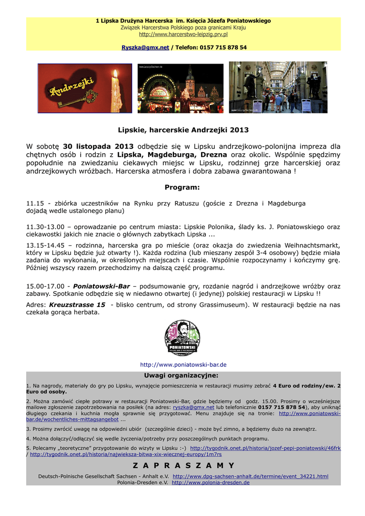 1 Lipska Drużyna Harcerska im. Księcia Józefa Poniatowskiego Związek Harcerstwa Polskiego poza granicami Kraju http://www.harcerstwo-leipzig.prv.pl [email protected] / Telefon: 0157 715 878 54 Lipskie, harcerskie Andrzejki 2013 W sobotę 30 listopada 2013 odbędzie się w Lipsku andrzejkowo-polonijna impreza dla chętnych osób i rodzin z Lipska, Magdeburga, Drezna oraz okolic. Wspólnie spędzimy popołudnie na zwiedzaniu ciekawych miejsc w Lipsku, rodzinnej grze harcerskiej oraz andrzejkowych wróżbach. Harcerska atmosfera i dobra zabawa gwarantowana ! Program: 11.15 - zbiórka uczestników na Rynku przy Ratuszu (goście z Drezna i Magdeburga dojadą wedle ustalonego planu) 11.30-13.00 – oprowadzanie po centrum miasta: Lipskie Polonika, ślady ks. J. Poniatowskiego oraz ciekawostki jakich nie znacie o głównych zabytkach Lipska ... 13.15-14.45 – rodzinna, harcerska gra po mieście (oraz okazja do zwiedzenia Weihnachtsmarkt, który w Lipsku będzie już otwarty !). Każda rodzina (lub mieszany zespół 3-4 osobowy) będzie miała zadania do wykonania, w określonych miejscach i czasie. Wspólnie rozpoczynamy i kończymy grę. Później wszyscy razem przechodzimy na dalszą część programu. 15.00-17.00 - Poniatowski-Bar – podsumowanie gry, rozdanie nagród i andrzejkowe wróżby oraz zabawy. Spotkanie odbędzie się w niedawno otwartej (i jedynej) polskiej restauracji w Lipsku !! Adres: Kreuzstrasse 15 - blisko centrum, od strony Grassimuseum). W restauracji będzie na nas czekała gorąca herbata. http://www.poniatowski-bar.de Uwagi organizacyjne: 1. Na nagrody, materiały do gry po Lipsku, wynajęcie pomieszczenia w restauracji musimy zebrać 4 Euro od rodziny/ew. 2 Euro od osoby. 2. Można zamówić ciepłe potrawy w restauracji Poniatowski-Bar, gdzie będziemy od godz. 15.00. Prosimy o wcześniejsze mailowe zgłoszenie zapotrzebowania na posiłek (na adres: [email protected] lub telefonicznie 0157 715 878 54), aby uniknąć długiego czekania i kuchnia mogła sprawnie się przygotować. Menu znajduje się na tronie: http://www.poniatowskibar.de/wochentliches-mittagsangebot ... 3. Prosimy zwrócić uwagę na odpowiedni ubiór (szczególnie dzieci) - może być zimno, a będziemy dużo na zewnątrz. 4. Można dołączyć/odłączyć się wedle życzenia/potrzeby przy poszczególnych punktach programu. 5. Polecamy „teoretyczne” przygotowanie do wizyty w Lipsku :-) http://tygodnik.onet.pl/historia/jozef-pepi-poniatowski/46frk / http://tygodnik.onet.pl/historia/najwieksza-bitwa-xix-wiecznej-europy/1m7rs Z A P R A S Z A M Y Deutsch-Polnische Gesellschaft Sachsen - Anhalt e.V. http://www.dpg-sachsen-anhalt.de/termine/event_34221.html Polonia-Dresden e.V. http://www.polonia-dresden.de