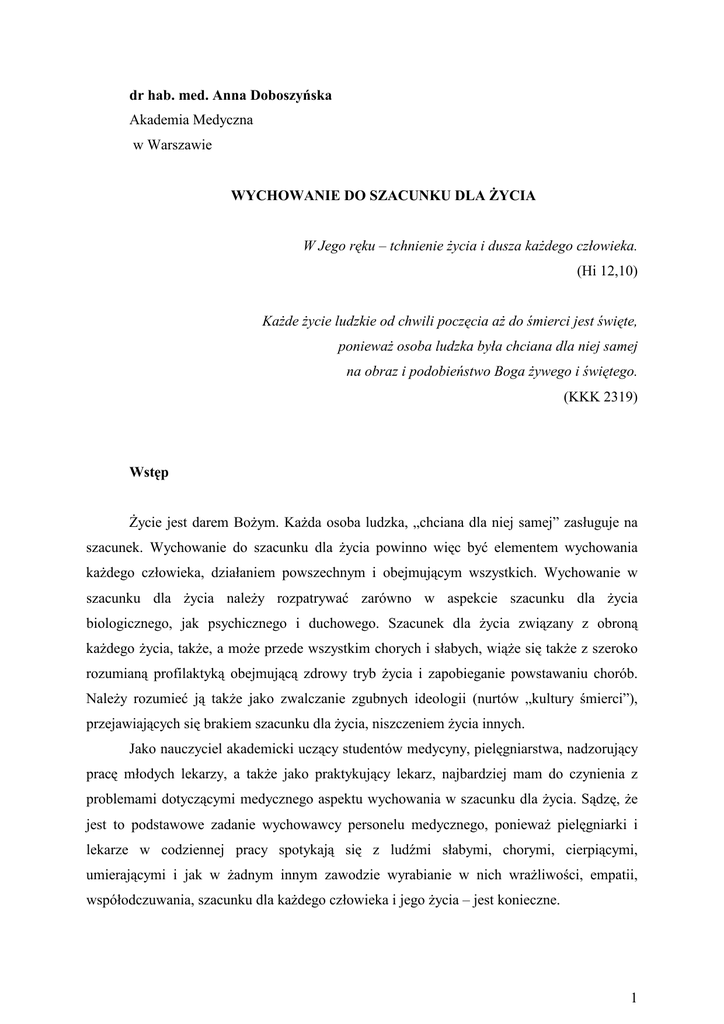 dr hab. med. Anna Doboszyńska Akademia Medyczna w Warszawie WYCHOWANIE DO SZACUNKU DLA śYCIA W Jego ręku – tchnienie Ŝycia i dusza kaŜdego człowieka. (Hi 12,10) KaŜde Ŝycie ludzkie od chwili poczęcia aŜ do śmierci jest święte, poniewaŜ osoba ludzka była chciana dla niej samej na obraz i podobieństwo Boga Ŝywego i świętego. (KKK 2319) Wstęp śycie jest darem BoŜym. KaŜda osoba ludzka, „chciana dla niej samej” zasługuje na szacunek. Wychowanie do szacunku dla Ŝycia powinno więc być elementem wychowania kaŜdego człowieka, działaniem powszechnym i obejmującym wszystkich. Wychowanie w szacunku dla Ŝycia naleŜy rozpatrywać zarówno w aspekcie szacunku dla Ŝycia biologicznego, jak psychicznego i duchowego. Szacunek dla Ŝycia związany z obroną kaŜdego Ŝycia, takŜe, a moŜe przede wszystkim chorych i słabych, wiąŜe się takŜe z szeroko rozumianą profilaktyką obejmującą zdrowy tryb Ŝycia i zapobieganie powstawaniu chorób. NaleŜy rozumieć ją takŜe jako zwalczanie zgubnych ideologii (nurtów „kultury śmierci”), przejawiających się brakiem szacunku dla Ŝycia, niszczeniem Ŝycia innych. Jako nauczyciel akademicki uczący studentów medycyny, pielęgniarstwa, nadzorujący pracę młodych lekarzy, a takŜe jako praktykujący lekarz, najbardziej mam do czynienia z problemami dotyczącymi medycznego aspektu wychowania w szacunku dla Ŝycia. Sądzę, Ŝe jest to podstawowe zadanie wychowawcy personelu medycznego, poniewaŜ pielęgniarki i lekarze w codziennej pracy spotykają się z ludźmi słabymi, chorymi, cierpiącymi, umierającymi i jak w Ŝadnym innym zawodzie wyrabianie w nich wraŜliwości, empatii, współodczuwania, szacunku dla kaŜdego człowieka i jego Ŝycia – jest konieczne. 1 1. Przepisy prawne Wychowanie w szacunku dla Ŝycia naleŜy rozumieć równieŜ jako wychowanie do przestrzegania prawa chroniącego Ŝycie wynikającego z prawa BoŜego, zapisanego w dziesięciu przykazaniach, zebranego w Katechizmie Kościoła Katolickiego1. Prawo stanowione przez człowieka zawarte jest w konstytucji, kodeksie prawnym, prawnych zasadach korporacyjnych... Obowiązkiem obywatelskim jest wybieranie takich osób stanowiących prawa (np. w wyborach do sejmu, przedstawicieli do ciał prawodawczych samorządu lekarskiego..), które będą przyczyniały się do powstania zapisów prawnych gwarantujących szacunek dla Ŝycia. 2. Kodeks Etyki Lekarskiej W Encyklice Evangelium vitae Jan Paweł II2 napisał o pracownikach słuŜby zdrowia: Ich zawód kaŜe im strzec ludzkiego Ŝycia i słuŜyć mu. Jest to równieŜ przesłanie i zalecenie Kodeksu Etyki Lekarskiej3. Poza zasadami i zaleceniami dotyczącymi postępowania lekarza wobec chorych, Kodeks Etyki Lekarskiej mówi o postępowaniu wobec kolegów lekarzy i ich rodzin. Znajdują się tam takŜe bardzo jasno sformułowane zalecenia dotyczące postępowania nauczyciela wobec uczniów i wzorach dla studentów i młodych lekarzy. Art. 77 KE mówi o tym, Ŝe ...lekarze nauczający studentów powinni zaznajamiać ich z Kodeksem Etyki Lekarskiej. Studenci medycyny powinni zarówno przyswajać sobie, jak i respektować zasady zawarte w niniejszym Kodeksie. Zaś art. 78 KE mówi o tym, Ŝe .. lekarze, którzy nauczają studentów lub szkolą lekarzy, powinni swoim postępowaniem stanowić przykład godny naśladowania dla studentów i młodych lekarzy będących pod ich opieką. Wychowanie w szacunku dla Ŝycia, nie jest więc abstrakcyjnym pojęciem które nie dotyczy nauczycieli, czy starszych lekarzy. Przestrzeganie zasad kodeksu etyki lekarskiej jest obowiązkiem takŜe studentów medycyny, ale przykład mają im dać starsi koledzy - lekarze, respektujący Kodeks mówiący o szacunku dla Ŝycia. W zbiorze zasad wydanych przez Komitet Etyki w Nauce przy PAN równieŜ podkreśla się obowiązki pracownika nauki: pracownik nauki powinien słowem i przykładem przekazywać swoim uczniom wiedze, umiejętności i zasady dobrych obyczajów w nauce (par. 3.3) 1 Katechizm Kościoła Katolickiego, Pallotinum, Poznań 1994. Jan Paweł II, Encyklika Evangelium vitae, 1995. 3 T. Brzeziński, Etyka lekarska, Wydawnictwo Lekarskie PZWL, Warszawa 2002. 2 2 3. Kodeks Etyki Zawodowej Pielęgniarki i PołoŜnej W części ogólnej w p. 3 Kodeksu Etyki Zawodowej Pielęgniarki i PołoŜnej jest mowa o konieczności pracy nad własnym rozwojem osobowym, kształtowaniem wraŜliwości etycznej i sumienia... a w części szczegółowej w rozdziale I p. 2 jest mowa o przestrzeganiu praw osób objętych ich troską, oraz o poszanowaniu godności osobistej podopiecznych. A takŜe dalej w rozdziale II p. 20 jest mowa o tym, Ŝe pielęgniarka ma prawo do odmowy uczestnictwa w zabiegach oraz czynnościach godzących w Ŝycie człowieka i jego godność... a w 21. Ŝe nie ma obowiązku uczestniczenia w zabiegach, badaniach naukowych i eksperymentach biomedycznych, które swoją istotą przeczą uznawanym przez nią normom etycznym. Z zasady postępowania pracowników słuŜby zdrowia, określonych w kodeksach etycznych, a takŜe w innych zbiorach zasad, wynika obowiązek doskonalenia się zawodowego i etyczno-moralnego, szacunku dla innych ludzi i słuŜenia przykładem młodszym kolegom. 4. ZagroŜenia Ŝycia we współczesnym świecie ZagroŜenia Ŝycia wynikają z bardzo wielu przyczyn. Mogą wiązać się niekiedy z rozwojem nauki, wykorzystanie jej osiągnięć dla niszczycielskich celów (np. bomba atomowa), z postępem technicznym nie idącym w parze z respektowaniem zasad ekologii (przemysłowe zanieczyszczenie środowiska)… Wiele zagroŜeń dla Ŝycia i zdrowia wynika takŜe z chęci zysku nieuczciwych, cynicznych wytwórców szkodliwych produktów. TakŜe atomizacja społeczeństwa, utraty podstawowych wartości, osłabienie znaczenia rodziny ma istotny wpływ na zagroŜenie Ŝycia juŜ w innym wymiarze.. Przeciwdziałanie wielu zagroŜeniom nie zawsze jest moŜliwe, konieczne jest natomiast uświadomienie ich