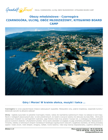 Oferta: CZARNOGÓRA, ULCINJ, OBÓZ MŁODZIEŻOWY, KITE&WIND BOARD CAMP Obozy młodzieżowe - Czarnogóra CZARNOGÓRA, ULCINJ, OBÓZ MŁODZIEŻOWY, KITE&WIND BOARD CAMP Góry i Morze! W krainie słońca, muzyki i tańca … Czarnogóra to coraz popularniejsze miejsce wakacyjnych wyjazdów. Niewysokie ceny, piękne krajobrazy, wspaniałe kurorty i doskonałe warunki na aktywne wakacje! Ulcinj - najdalej wysunięte na południe Czarnogóry miasto, należy do najchętniej wybieranych miejsc na wakacje w tym kraju. Słynie z rozległych piaszczystych plaż, na tyle przestronnych, że nawet w szczycie sezonu nie odczuwa się tutaj tłoku . Ulcinj jest najstarszym miastem na czarnogórskim wybrzeżu. Jego historia może liczy prawie 3 tysiące lat, a urzekająca starówka pamięta jeszcze tureckich władców i afrykańskich piratów. Ulcinj warto odwiedzić ze względu na jego orientalną atmosferę. Nawoływanie z minaretu, kobiety w kolorowych strojach narodowych handlujące egzotycznymi owocami, wyjątkowa starówka, do której prowadzą wąskie i kręte uliczki, małe sklepiki, stragany, kafejki, liczne tawerny i dwa targi tworzą niepowtarzalny, zupełnie odmienny w Strona 1 z 3 Masz pytania? Zadzwoń +48 42 639 80 99, +48 42 256 88 99, +48 42 256 80 99 [email protected] porównaniu z innymi miasteczkami Czarnogóry, charakter. Kwintesencją udanego wypoczynku jest Velika Plaza - piaszczysta plaża położona na południe od miasta, ciągnąca się przez ponad 13 km. To prawdziwy raj dla wind- i kitesurferów oraz plażowiczów:) . Szeroka momentami na ponad 50 metrów plaża sprawia, że przez moment możemy poczuć się nad Adriatykiem jak nad naszym Morzem Bałtyckim. Miękki ciepły piasek, dużo słońca, wspaniała kuchnia, piękne plenery, egzotyka i bardzo przyjazne ceny - zapraszamy na wakacje w Ulcinj! Program ramowy Dzień 1: Wyjazd z Polski w godzinach popołudniowych według rozkładu jazdy. Przejazd przez Polskę, Słowację, Węgry, Bośnię. Dzień 2: Przyjazd do Czarnogóry w godzinach około południowych, zakwaterowanie grupy. Spotkanie organizacyjne z rezydentem i kadrą. Przekazanie podstawowych informacji o miejscowości, prezentacja programów lokalnych i programu pobytu. Kolacja. Dzień 3-10: Wypoczynek i relaks na lokalnych plażach i program animacyjny. Dla osób decydujących na kite lub windsurfing zajęcia z instruktorami i szkolenie. W trakcie pobytu możliwość skorzystania z wycieczek: Montenegrotour, Albania (opisy poniżej programu). Dzień 11: Wykwaterowanie. Wyjazd w drogę powrotną do Polski. W drodze powrotnej zwiedzanie Dubrovnika. Przejazd przez Bośnię, Węgry, Słowację. Dzień 12: Przyjazd do Polski. Wyżywienie Wyżywienie: 3 x dziennie: - śniadania w formie bufetu m.in.: nabiał, wędliny, kiełbaski, jajka, musli, pieczywo, warzywa, - obiady serwowane: jedno ciepłe danie + napój, - kolacje serwowane: pierwsze danie zupa, główne danie np. mięso lub ryba, z frytkami lub ziemniakami, sałatka, deser. Terminy i ceny: Kliknięcie na cene pozwoli na przejście do formularza rezerwacji internetowej. Symbol Data Skierowanie Skierowanie - miejsce w pokoju 3-4 osobowym z łazienką lub apartamencie 5-6 osobowym z łazienką. Każdy uczestnik zobowiązany jest posiadać ważny paszport lub dowód osobisty. Zakwaterowanie w obiektach odbywa się od godziny 12.00 w dniu przyjazdu, natomiast wykwaterowanie odbywa się do godziny 9.00 w dniu wyjazdu. Strona 2 z 3 Masz pytania? Zadzwoń +48 42 639 80 99, +48 42 256 88 99, +48 42 256 80 99 [email protected] Kalkulacja cenowa sporządzona na dzień 25.11.2015 1 EUR = 4,23 PLN. Cena zawiera przejazd luksusowym autokarem (klimatyzacja, barek, DVD); 9 noclegów w hotelu w pokojach 3 - 4 osobowych; wyżywienie zgodnie z opisem (9 śniadań, 9 obiadów, 9 kolacji); suchy prowiant na drogę; opiekę kadry i animatorów; program animacyjny na miejscu; Cena nie zawiera Dopłaty obowiązkowe ubezpieczenia 50 PLN/os SIGNAL IDUNA (KL 10.000 euro, NNW 7.000 PLN, bagaż 800 PLN) - płatne obowiązkowo w biurze; opłaty klimatycznej 10 euro/os/pobyt - płatne obowiązkowo w autokarze; zwrotnej kaucji 20 euro/os - zwracana przy braku szkód w hotelu przy powrocie do Polski. Dopłaty fakultatywne fakultatwynych dopłat do szkoleń kite lub windsurfinogowych wg. wyboru - opis i ceny szkolen w zakładkach. Podczas promocji nie łącza sie zniżki dla dzieci powyzej 3 lat. Dziecko do 3 lat zawsze ma stałą cenę plus ubezpieczenie. Strona 3 z 3 Masz pytania? Zadzwoń +48 42 639 80 99, +48 42 256 88 99, +48 42 256 80 99 [email protected]