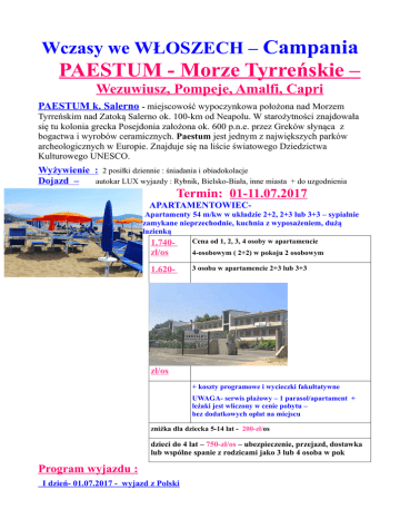 Wczasy we WŁOSZECH – Campania PAESTUM - Morze Tyrreńskie – Wezuwiusz, Pompeje, Amalfi, Capri PAESTUM k. Salerno - miejscowość wypoczynkowa położona nad Morzem Tyrreńskim nad Zatoką Salerno ok. 100-km od Neapolu. W starożytności znajdowała się tu kolonia grecka Posejdonia założona ok. 600 p.n.e. przez Greków słynąca z bogactwa i wyrobów ceramicznych. Paestum jest jednym z największych parków archeologicznych w Europie. Znajduje się na liście światowego Dziedzictwa Kulturowego UNESCO. Wyżywienie : 2 posiłki dziennie : śniadania i obiadokolacje Dojazd – autokar LUX wyjazdy : Rybnik, Bielsko-Biała, inne miasta + do uzgodnienia Termin: 01-11.07.2017 APARTAMENTOWIECApartamenty 54 m/kw w układzie 2+2, 2+3 lub 3+3 – sypialnie zamykane nieprzechodnie, kuchnia z wyposażeniem, dużą łazienką 1.740zł/os Cena od 1, 2, 3, 4 osoby w apartamencie 1.620- 3 osoba w apartamencie 2+3 lub 3+3 4-osobowym ( 2+2) w pokoju 2 osobowym zł/os + koszty programowe i wycieczki fakultatywne UWAGA- serwis plażowy – 1 parasol/apartament + leżaki jest wliczony w cenie pobytu – bez dodatkowych opłat na miejscu zniżka dla dziecka 5-14 lat - 200-zł/os dzieci do 4 lat – 750-zł/os – ubezpieczenie, przejazd, dostawka lub wspólne spanie z rodzicami jako 3 lub 4 osoba w pok Program wyjazdu : I dzień- 01.07.2017 - wyjazd z Polski - wyjazd z Polski około 03.00, przejazd non stop do Włoch – podróż ok 17-18 godzin. Przyjazd do hotelu na obiadokolację o nocleg w okolice Orvieto. II dzień- 02.07.2017 – Neapol , przyjazd do Paestum - śniadanie, przyjazd do Neapolu – zwiedzanie z lokalnym przewodnikiem – koszt 6 Euro/os Porta Capuana i Castel Capuanno - miejsce zaślubin Zygmunta I z Boną Sforza, Katedra pomniki dawnych władców Neapolu, relikwie św. Januarego patrona Neapolu, przejście do Bazyliki di Santa Restituta. Przejazd do Paestum, zakwaterowanie, obiadokolacja, nocleg. III dzień –03.07.2017 - odpoczynek w Paestum - śniadanie. Odpoczynek w Paestum, obiadokolacja, wieczorny wyjazd do do miasteczka Agropoli – Starówka, wejście na zamek, panorama zatoki i portu. Na trasie zakupy w lokalnym markecie. IV dzień –04.07.2017 - Paestum – park archeologiczny - śniadanie, odpoczynek nad morzem, obiadokolacja. Wieczorem zwiedzanie Paestum (Park archeologiczny - bazylika i greckie świątynie z V w.p.n.e, amfiteatr rzymski), nocleg. V dzień – 05.07.2017 - wyspa Capri, wybrzeże Amalfi - śniadanie, całodzienna wycieczka statkiem wzdłuż Wybrzeża Amalfi, z zawijaniem na trasie do portów Positano i Amalfi oraz 6 godzinnym pobytem na wyspie Capri i wjazdem kolejką szynową (koszt 45 Euro/os dorośli oraz 35 Euro dzieci i młodzież do 16 lat), powrót do Paestum na obiadokolację i nocleg. VI dzień –06.07.2017 - wypoczynek, zwiedzanie - śniadanie, wypoczynek w Paestum, rano dla chętnych wizyta w wytwórni mozzarelli, obiadokolacja, nocleg. VII dzień –07.07.2017 - Wezuwiusz, Pompeje - śniadanie, wycieczka do Pompei (zwiedzanie z przewodnikiem w języku polskim z audioguides starożytnego miasteczka zniszczonego przez wybuch wulkanu w 79 roku, w którym jednak zachowało się wiele domów z wyposażeniem, malowidłami i rzeźbami), następnie wyjazd pod Wezuwiusz -możliwość dojścia do krateru – koszt wycieczki 35 Euro/os dorośli oraz 25 Euro dzieci do l. 16). Powrót na obiadokolację i nocleg do Paestum. VIII dzień –08.07.2017 - wypoczynek, Agropoli - śniadanie, wypoczynek w Paestum, obiadokolacja, wieczorny wyjazd do do miasteczka Agropoli. Powrót do Paestum na nocleg. IX dzień – 09.07.2017 - Rzym - śniadanie, wyjazd do Rzymu , zwiedzanie : „Rzym antyczny i barokowy” (Bazylika Św. Piotra, Plac Św. Piotra, Zamek Św, Anioła, Schody Hiszpańskie, Piazza Navona, Panteon, Fontana Di Trevi, Kapitol ), po południu przyjazd do hotelu k. Orvieto. Zakwaterowanie w hotelu – obiadokolacja i nocleg. X dzień – 10.07.2017 - śniadanie, wyjazd do Polski, na trasie możliwość krótkiego zwiedzania Orvieto z lokalnym przewodnikiem – koszt 5 Euro/os. Powrót do Polski w godzinach popołudniowych . XI dzień – 11.07.2017 - powrót do Polski we wczesnych godzinach rannych . CENA obejmuje: przejazd autokarem lux – pozostaje na miejscu z grupą 9 noclegów we Włoszech w tym 7 noclegów w dużych apartamentach 54-m kw/ w Paestum, Wioska Wakacyjna „Villagio Cerullo”, 50 metrów od własnej plaży, serwis plażowy w cenie ( 1 parasol + leżaki na 1 apartament ), apartamenty 3-pokojowe, każdy posiada 2 sypialnie, salon, łazienkę, kuchnię z wyposażeniem. Na miejscu programy animacyjne na plaży i w ośrodku. Na trasie 2 noclegi tranzytowe w okolicach Orvietopokoje 2,3,4 osobowe z łazienkami wyżywienie 2 x dziennie : śniadanie i 2- daniowe obiadokolacje - kuchnia polska samoobsługowa , na trasie 2 śniadania i 2 obiadokolacja w hotelu opiekę pilota – rezydenta, nie oprowadza w miejscach zastrzeżonych dla lokalnych przewodników polisa TU Gothaer NNW (do 10.000 zł) i KL (do 40.000 zł) wycieczka do Agropoli,- 2 wyjazdy. CENA nie obejmuje: kosztów biletów wstępu i wjazdów do miast (Rzym), wycieczek fakultatywnych : Wezuwiusz, Pompeje, Paestum oraz rejsu na Capri i wybrzeże Amalfi – razem ok. 80 EURO/os + Rzym-zwiedzanie z przewodnikiem koszt 20 Euro/os, Neapol 6 Euro/os., Orvieto 5 Euro/os. wyżywienia na czas podróży ORGANIZATOR : Biuro podróży Polan Travel Bielsko-Biała tel 33 81 19 550 [email protected] www.polan-travel.com.pl