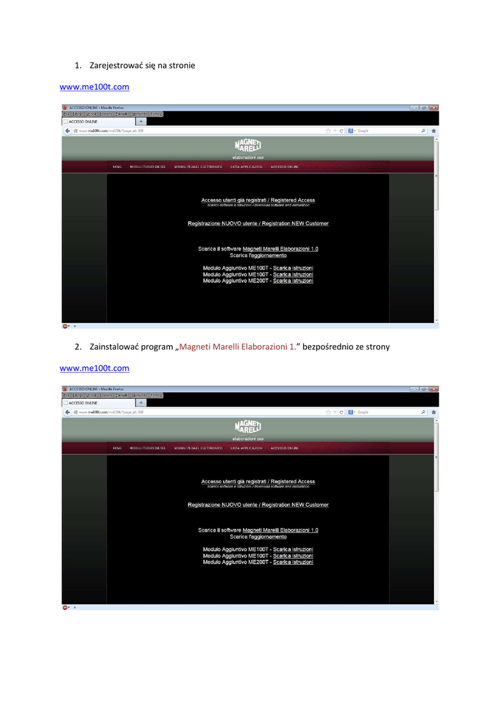 1. Zarejestrowad się na stronie www.me100t.com 2. Zainstalowad program „Magneti Marelli Elaborazioni 1.” bezpośrednio ze strony www.me100t.com 3. Uruchomid program Magneti Marelli Elaborazioni (PC musi mied aktywne połączenie z Internetem, a moduł podłączony do tego samego komputera poprzez przewód USB) 4. Zalogowad się danymi, wysłanymi przez administratora (otrzymuje się je po wypełnieniu formularza na stronie www.me100t.com – patrz pkt 1.) 5. Użyd przycisku „Mappatura” w celu wyboru modelu samochodu, do którego chcemy zainstalowad moduł. Weryfikacją poprawnego połączenia modułu do komputera są dane identyfikacyjne modułu w prawy górnym rogu programu. 6. Należy dokonad poprawnego wyboru modelu samochodu i silnika w oparciu o pojemnośd moc nominalną i kod silnika, jeżeli występuje. Następnie użyd przycisku „Download File” po lewej stronie w wierszu właściwym dla wybranego modelu. 7. Ustawid parametry dla konkretnych ustawieo. Naciśnięcie klawisza Mappa „x” spowoduje aktywację konkretnego programu – dla posiadaczy pilota (ME300T) nie ma to znaczenia, gdyż za jego pomocą można zmieniad programy po zainstalowaniu modułu do samochodu. Pilot (jeżeli w posiadaniu) kodujemy używając numeru, który znajduje się na obudowie (mała naklejka) lub w środku na płycie głównej; wpisując ów numer w pojawiające się pole po zmianie statusu Telecomando OFF / ON. Zaraz po zainstalowaniu oprogramowania, w module znajdziemy nastawy rekomendowane przez Magneti Marelli, w których można dokonad modyfikacji na własną odpowiedzialnośd za pomocą STEP 1 (ogólna zmiana) i STEP 2 PRO (wybiórcze strojenie). STEP 1 STEP 2 PRO Ten próg oferuje możliwośd zmiany parametrów w 3 zakresach obciążenia pracy silnika ALTI-WYSOKIE 70 DO 100% MEDI-ŚREDNIE 30 DO 70% BASS- NISKIE 0 DO 30% LIMITE PRESSIONE RAIL-LIMIT CISNIENIA NA LISTWIE COMMON RAIL Ustawienia zapisujemy przy pomocy przycisku „Indietro” !!! UWAGA !!! Magneti Marelli Aftermaket Parts & Services S.p.A. przypomina, że dodatkowa centralka jest przeznaczona wyłącznie do zastosowao WYCZYNOWYCH, a więc można ją stosowad do jazdy torowej, na torach prywatnych lub wyznaczonych, na drogach zamkniętych dla ruchu. Magneti Marelli Aftermaket Parts & Services S.p.A. nie ponosi żadnej odpowiedzialności za niewłaściwe użycie tego urządzenia. Użytkownik jest zawsze zobowiązany do przestrzegania kodeksu drogowego oraz obowiązujących przepisów. . Magneti Marelli Aftermaket Parts & Services S.p.A. nie ponosi żadnej odpowiedzialności za ewentualne szkody spowodowane przez samochód w wyniku wad wyrobu lub błędnego zainstalowania wyżej wymienionych wyrobów.