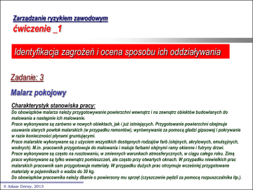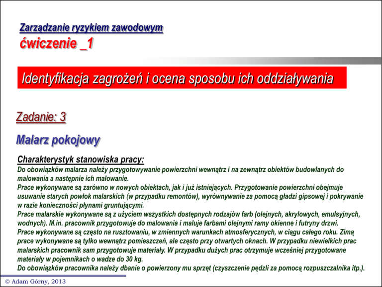 Zarządzanie ryzykiem zawodowym ćwiczenie _1 Identyfikacja zagrożeń i ocena sposobu ich oddziaływania Zadanie: 3 Malarz pokojowy Charakterystyk stanowiska pracy: Do obowiązków malarza należy przygotowywanie powierzchni wewnątrz i na zewnątrz obiektów budowlanych do malowania a następnie ich malowanie. Prace wykonywane są zarówno w nowych obiektach, jak i już istniejących. Przygotowanie powierzchni obejmuje usuwanie starych powłok malarskich (w przypadku remontów), wyrównywanie za pomocą gładzi gipsowej i pokrywanie w razie konieczności płynami gruntującymi. Prace malarskie wykonywane są z użyciem wszystkich dostępnych rodzajów farb (olejnych, akrylowych, emulsyjnych, wodnych). M.in. pracownik przygotowuje do malowania i maluje farbami olejnymi ramy okienne i futryny drzwi. Prace wykonywane są często na rusztowaniu, w zmiennych warunkach atmosferycznych, w ciągu całego roku. Zimą prace wykonywane są tylko wewnątrz pomieszczeń, ale często przy otwartych oknach. W przypadku niewielkich prac malarskich pracownik sam przygotowuje materiały. W przypadku dużych prac otrzymuje wcześniej przygotowane materiały w pojemnikach o wadze do 30 kg. Do obowiązków pracownika należy dbanie o powierzony mu sprzęt (czyszczenie pędzli za pomocą rozpuszczalnika itp.). Adam Górny, 2013