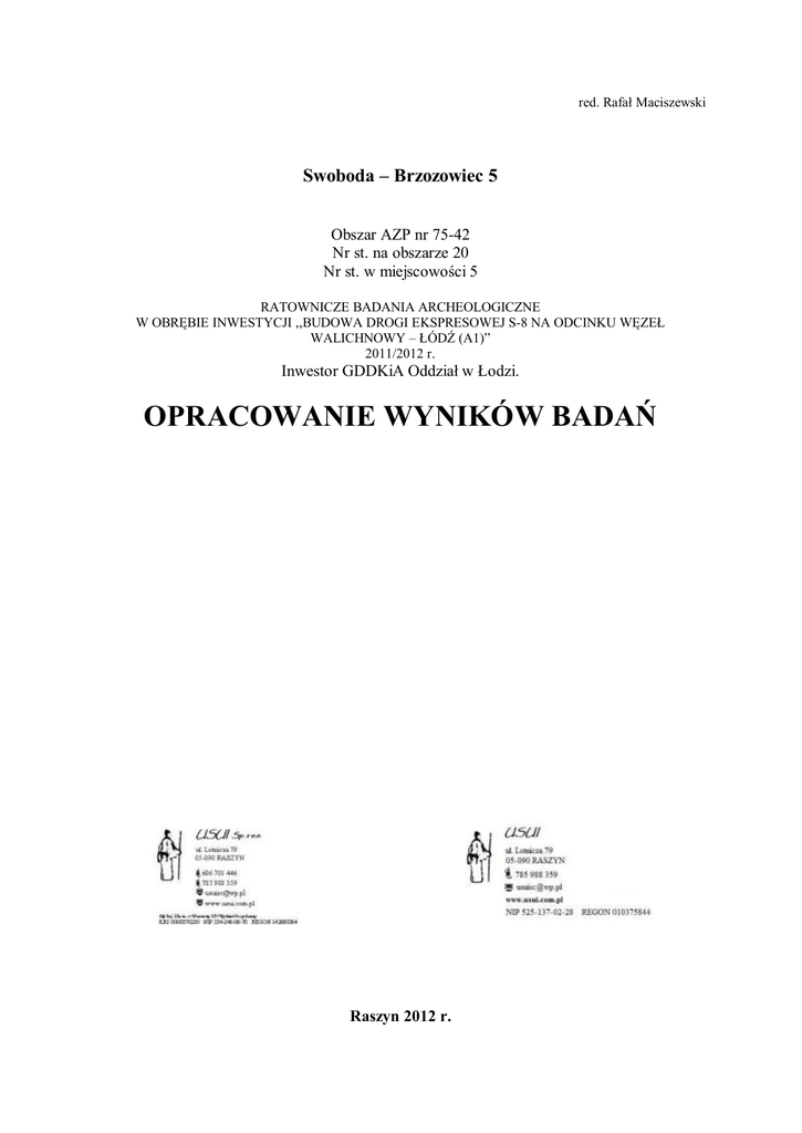 red. Rafa Maciszewski Swoboda – Brzozowiec 5 Obszar AZP nr 75-42 Nr st. na obszarze 20 Nr st. w miejscowo ci 5 RATOWNICZE BADANIA ARCHEOLOGICZNE W OBR BIE INWESTYCJI ,,BUDOWA DROGI EKSPRESOWEJ S-8 NA ODCINKU W ZE WALICHNOWY – ÓD (A1)” 2011/2012 r. Inwestor GDDKiA Oddzia w odzi. OPRACOWANIE WYNIKÓW BADA Raszyn 2012 r. 1 A - KARTA EWIDENCYJNA ZABYTKU ARCHEOLOGICZNEGO AZP LOKALIZACJA 2 PO ENIE FIZYCZNOGEOGRAFICZNE M. Swoboda-Brzozowiec JEDNOSTKA FIZYCZNOGEOGRAFICZNA Nr stan. w miejscowo ci w morzu pla a mierzeja skarpa wa wydm. - - - - - STREFA NADMORSKA (NADZALEWOWA) 5 DU E DOLINY GMINA Lututów POWIAT wieruszowski WOJEWÓDZTWO ódzkie AZP nr obsz. 75-42 318.22 TEREN - w wodzie nr st. 20 o terasa denna terasa nadzalewowa terasy wy sze brzeg wysoczyzny - - - - - MA E DOLINY o punkt osadniczy nieokre lona nowo ytno nieokre lona 6 OPIS OBSZARU STANOW. obserw. utrudniona pole otwarte x pole zamkni te x nasycenie znaleziskami: jednocentryczne bez przeszk. x równomierne wielocentryczne 7 x - powierzchnia stanowiska: -1 ar -0,5 ha -1ha - x - sto ma a e i proste sfa dowania i niewielkie cyple cyple wybitne wa y i garby wyniesienia o ekspozycji okr nej TEREN OS ONI TY x doliny podstawa stoku XIX/XX wiek nieokre lona P x L - zwi x x - okre lenie specjalistyczne - 4 DOST PNO niezabud. y torf.-bagn. - TERENU r.zabud. zabudow. park - las - bagno - woda - nieu ytek sad x x - torf - pole orne x ka teren przemys owy 5 jam, 7 fr. ceramiki 19 jam, 9 do ków pos upowych 8 WNIOSKI KONSERWAT. niezb dna szczegó owa inwentaryzacja Budowa drogi ekspresowej S-8 niezb dne badania wykopaliskowe niezb dna interwencja administracyjna 9 AKTUALNA OCHRONA nr rejestru zabytków -5ha -15ha >15ha - - wyst powania znalezisk: rednia ZAGRO ENIA kraw NIEEKSPONOWANY TEREN EKSPONOWANY stok doliny N W - x okre lenie bli sze Wspó rz. geogr. N 51 20’ 11 E 18 28’49 doliny denud., niecki, jary, parowy Nazwa lokalna STREFA POZA DOLINAMI kotlinki, zag bienia bezodp ywowe Nr dzia ki geodez. równina obsz. falisty obsz. pagórk. obsz. górzysty jaskinie, schroniska skalne Identyfikator EGB GDDKiA oddzia w odzi FORMA SZCZEGÓLNA x ciciel terenu 5 KLASYFIKACJA FUNKCJONALNO-KULTUROWO-CHRONOLOGICZNA STANOWISKA nr funkcja kultura chronologia opis materia ów, obiektów, warstw oraz form terenowych 1. 2. dno doliny X - 3 UTWÓR GEOLOGICZNY lu ny kraw dzie, stoki wkl - T x - - data wpisu do rejestru park kulturowy - 10 WYKONANIE KARTY 11 data (dd,mm,rrrr) akceptacja WKZ 30.06.2012r. autor karty - WERYFIK. KONSERW. Miejscowo , data mgr Monika Maciszewska okre lili chronologi mgr Monika Maciszewska 12 ZBIORY i NR INWENT. miejsce przechowywania - plan zagospodarowania przestrzennego du a - sprawdzi -konsultant AZP Muzeum Ziemi Wielu skiej, ul. Narutowicza 13 98-300 Wielu nr inwentarza 13 MAPA W SKALI 1:10.000 – UK AD WSPÓ RZ DNYCH KARTOGRAF. god o arkusza (nr i nazwa) 134.143 Swoboda Brzozowiec X 385,99 15 DOKUMENTACJA Y 463,35 16 LITERATURA DOKUMENTACJA: WKZ w Sieradzu, Muzeum w Wieluniu LITERATURA: www.usui.com.pl 14 HISTORIA BADA STANOWISKA (rok/ rodzaj bada / autor i instytucja) 2010 Badania powierzchniowe i sonda owe mgr R. Czerniak, mgr P. Staniucha 2011/2012 Badania ratownicze mgr Monika Maciszewska - USUI Sp. z o.o. USUI Rafa Maciszewski 17 INNE DANE Rafa Maciszewski 1. WST P 1.1. PODZIA PRZESTRZENI BADAWCZEJ Podzia przestrzeni badawczej zosta oparty na siatce arowej. Ary lokalizowane by y w ryc. 1 oparciu o przynale no do poszczególnego hektara, oznaczonego du ymi literami. Poszczególne ary w obr bie hektara oznaczane by y cyframi arabskimi od 1 – 10 w pasach pionowych i oznaczeniami literowymi od a – j w pasach poziomych, pocz wszy od lewego górnego rogu ryc. 1. W zwi zku z tym poszczególny ar oznaczany zosta symbolem hektara oraz symbolem literowo cyfrowym np. Bc8. Wewn trznie ar podzielony zosta na cztery wiartki oznaczane ma ymi literami a,b,c,d ryc. 2. ryc. 2 6 Poszczególne jednostki sk adowe stanowiska archeologicznego, takie jak obiekty, warstwy oraz zabytki ruchome lokalizowane by y w oparciu o numer hektara i ara. Poszczególne obiekty oraz warstwy pozaobiektowe oznaczane by y w zbiorach rozdzielnych cyframi arabskimi, przy czym humus oznaczony zosta zawsze jako warstwa nr 1 a calec jako warstwa nr 0. Warstwom obiektowym przyporz dkowany zosta numer obiektu oraz oznaczenie literowe (np. 1a). W przypadku wyst pienia podobiektów, nadawany zosta im numer obiektu g ównego oraz oznaczenie cyfrowe (np. 1.1). Wewn trzny podzia stratygraficzny podobiektów wyró niony zosta przy pomocy oznacze przyporz dkowanych numerowi podobiektu (np. 1.1a) literowych ryc. 3. obiekt nr 1 w. 1a w. 1.1a obiekt nr 1.1 w. 1b w. 1.1b w. 1c ryc. 3 1.2. PRZYJ TE ZASADY DOKUMENTACJI Podstaw dokumentacji stanowi rysunki planów poszczególnych arów wykonywane w skali 1:50 z nanoszonymi zarysami rzutów poziomych obiektów i warstw pozaobiektowych, ich numeracj i warto ciami niwelacyjnymi (przeliczonymi) oraz liniami ci profilowych. Obok tego wykonywane by y rysunki przekrojów poszczególnych obiektów w skali 1:20 z podan ich numeracj i warto ci niwelacyjn stropu (przeliczon ). Uzupe nienie stanowi plan zbiorczy wykonywany w skali 1:200. Dokumentacj fotograficzn wykonano w technice cyfrowej. Profile obiektów fotografowane by y bez obrysu. Poszczególne zdj cia grupowane by y w folderach tematycznych (np. ary, obiekty profile, obiekty plany). Poszczególne pliki opisywane by y numerami odpowiadaj cymi numerom obiektów lub arów (np. obiekty profile 10). Dokumentacja opisowa opiera a si na sformalizowanych formularzach – tzw. „kartach”. Stosowano: KART OBIEKTU, KART WARSTWY POZAOBIEKTOWEJ, KART ZABYTKU WYDZIELONEGO. Na KARCIE OBIEKTU umieszczano zminiaturyzowane zdj cie profilu obiektu oraz cyfrowy jego obrys. Zastosowanie tej podwójnej dokumentacji 7 rysunkowej umo liwia weryfikacj rysunków polowych i tym samym u atwia pó niejsze opracowanie. 1.3. PRZYJ TE ZASADY ODHUMUSOWANIA I EKSPLORACJI Przestrze badawcza odhumusowana