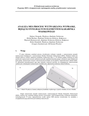 IX Konferencja naukowo-techniczna Programy MES w komputerowym wspomaganiu analizy, projektowania i wytwarzania ANALIZA MES PROCESU WYTWARZANIA WYPRASKI, BĘDĄCEJ INTEGRALNYM ELEMENTEM KARABINKA WOJSKOWEGO Tadeusz Niezgoda, Wojskowa Akademia Techniczna Michał Bachan, Akademia Techniczno-Rolnicza, Bydgoszczy Wojciech Bieniaszewski, Akademia Techniczno-Rolnicza, Bydgoszcz Robert Kamiński, Wojskowa Akademia Techniczna Grzegorz Kazimierczak, GM System Wrocław 1. Wstęp W pracy dokonano symulacji procesu wtryskiwania wybranej wypraski, z zastosowaniem narzędzi numerycznych działających z zastosowaniem Metody Elementów Skończonych (MES). Obiektem badań jest element pokrywy komory nabojowej karabinka wojskowego (Rys.1.). W artykule podjęto dyskusję na temat możliwości zastosowania tworzyw polimerowych jako materiału konstrukcyjnego wybranych części składowych broni palnej. Zastosowanie tworzyw sztucznych przyczyniłoby się do poprawy ergonomiczności obiektu badań. W założeniach konstrukcyjnych tego typu elementy cechować powinny się następującymi właściwościami użytkowymi: tolerancjami wymiarowymi i kształtowymi, odpornością termiczną i dużą trwałością. a) b) Rys. 1. Model 3D pokrywy komory nabojowej karabinka wojskowego: a) prawa wkładka, b) lewa wkładka Dzięki zastosowaniu narzędzi numerycznych, wykorzystujących Metodę Elementów Skończonych (MES), możliwa jest symulacja danego procesu wytwarzania, celem prognozowania wybranych parametrów technologicznych. W pracy zaprezentowano wyniki analizy MES procesu wtryskiwania ww. produktu z uwzględnieniem jego przetwórczych tendencji skurczowych. Tadeusz Niezgoda, Michał Bachan, Wojciech Bieniaszewski, Robert Kamiński, Grzegorz Kazimierczak 2. Analiza MES procesu wtryskiwania wypraski. Do analizy użyto modelu lewej wkładki, która została wygenerowana w systemie 3D MCAD UGS Solid Edge V17. Geometrię wyeksportowano za pośrednictwem formatu *.stl do aplikacji CAE MPA Moldflow 7.0. W pierwszym kroku badań dokonano porównania wpływu zastosowania liczności punktów wtrysku na: deformacje, rozkłady spadków ciśnienia, temperatury czoła strugi, czasu wypełnienia, skurczu lokalnego, orientacji powierzchni i linii łączenia strug. 2.1. Dobór liczności punktów wtrysku Rys. 2a. Odkształcenia skurczowe dla jednego punktu Rys. 3a. Odkształcenia skurczowe dla dwóch punktów wtrysku. wtrysku. 2 Rys. 2b. Rozkład spadków ciśnienia dla jednego punktu wtrysku Rys. 3b. Rozkład spadków ciśnienia dla dwóch punktów wtrysku. Rys. 2c. Rozkład temperatury czoła strugi tworzywa dla jednego punktu wtrysku. Rys. 3c. Rozkład temperatury czoła strugi tworzywa dla dwóch punktów wtrysku. Analiza mes procesu wytwarzania wypraski, będącej integralnym elementem karabinka wojskowego Rys. 2d. Rozkład czasu wypełnienia gniazda dla jednego punktu wtrysku. Rys. 3d. Rozkład czasu wypełnienia gniazda dla dwóch punktów wtrysku. Rys. 2e. Rozkład lokalnego skurczu tworzywa dla jednego punktu wtrysku. Rys. 3e. Rozkład lokalnego skurczu tworzywa dla dwóch punktów wtrysku. Rys. 2f. Rozkład orientacji powierzchni wypraski z uwzględnieniem linii łączenia strug dla jednego punktu wtrysku. Rys. 3f. Rozkład orientacji powierzchni wypraski z uwzględnieniem linii łączenia strug dla dwóch punktów wtrysku. Przeprowadzona symulacja numeryczna procesu wtryskiwania wykazała, że odkształcenia skurczowe dla jednego punktu wtrysku są większe i bardziej skupione niż w przypadku zastosowania dwóch punktów wtrysku. Wywołane jest to większymi drogami płynięcia tworzywa, w przypadku jednego punktu, co powoduje większe spadki ciśnienia, temperatur. Prowadzi to do zróżnicowania skurczu lokalnego i w konsekwencji zwiększenia deformacji całej wypraski. Dla dwóch punktów wtrysku czas cyklu wytwarzania jest krótszy o około 27%, co przyśpiesza produkcję. Zastosowanie dwóch punktów wtrysku jest korzystniejsze ze względu na odkształcenia i 3 Tadeusz Niezgoda, Michał Bachan, Wojciech Bieniaszewski, Robert Kamiński, Grzegorz Kazimierczak czas cyklu, jednak powstające linie łączenia strug dyskwalifikują to rozwiązanie. Ze względu na równomierną wytrzymałość wypraski linie łączenia strug w newralgicznych obszarach są niedozwolone. 2.2. Dobór materiału konstrukcyjnego Dominujący wpływ na właściwości wypraski ma zastosowanie odpowiedniego tworzywa, które należy dobierać pod kątem postawionych założeń opisanych powyżej. W badaniach użyte zostały tworzywa polimerowe zróżnicowane ze względu na budowę struktury wewnętrznej: krystaliczne i amorficzne. Tworzywa krystaliczne mają uporządkowany rozkład łańcuchów węglowych, większy skurcz o charakterze anizotropowym, zależnym od kierunku płynięcia. Rozkład łańcuchów w tworzywach amorficznych jest losowy, posiadają mniejszy skurcz o charakterze izotropowym. Tworzywa użyte do badań to: a) krystaliczne: - polipropylen - poliamid - poliamid napełniony włóknem szklanym b) amorficzne - polistyren Elementy wykonane z tworzyw krystalicznych uległy deformacji, największych w przypadku polipropylenu. Górna krawędź montażowa została zniekształcona. W przypadku zastosowania tworzywa amorficznego nie zaobserwowano deformacji. Zgodnie z założeniami początkowymi, wypraska powinna mieć wysoką wytrzymałość termiczną, czego nie zapewniają żadne tworzywa oprócz poliamidu, dodatkowo wytrzymałość polistyrenu jako przedstawiciela tworzyw amorficznych maleje wraz ze wzrostem temperatury. 4 Rys. 4a. Odkształcenia wypraski wykonanej z PP Rys. 4b. Odkształcenia wypraski wykonanej z PS Rys. 4c. Odkształcenia wypraski wykonanej z PA Rys. 4d. Odkształcenia wypraski wykonanej z PA+WS Analiza mes procesu wytwarzania wypraski, będącej integralnym elementem karabinka wojskowego 2.3. Dobór parametrów procesu 2.3.1 Dobór parametrów wtrysku Podczas pracy z zastosowaniem systemu CAE Moldflow możliwe jes