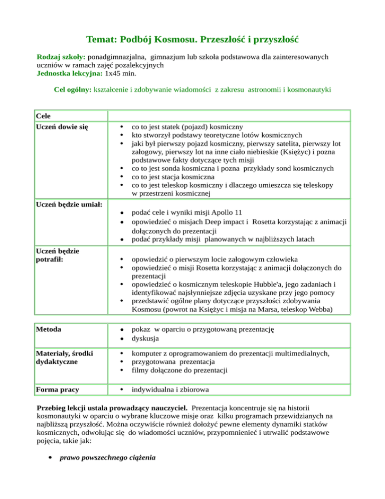 Temat: Podbój Kosmosu. Przeszłość i przyszłość Rodzaj szkoły: ponadgimnazjalna, gimnazjum lub szkoła podstawowa dla zainteresowanych uczniów w ramach zajęć pozalekcyjnych Jednostka lekcyjna: 1x45 min. Cel ogólny: kształcenie i zdobywanie wiadomości z zakresu astronomii i kosmonautyki Cele Uczeń dowie się co to jest statek (pojazd) kosmiczny kto stworzył podstawy teoretyczne lotów kosmicznych jaki był pierwszy pojazd kosmiczny, pierwszy satelita, pierwszy lot załogowy, pierwszy lot na inne ciało niebieskie (Księżyc) i pozna podstawowe fakty dotyczące tych misji co to jest sonda kosmiczna i pozna przykłady sond kosmicznych co to jest stacja kosmiczna co to jest teleskop kosmiczny i dlaczego umieszcza się teleskopy w przestrzeni kosmicznej Uczeń będzie umiał: Uczeń będzie potrafił: podać cele i wyniki misji Apollo 11 opowiedzieć o misjach Deep impact i Rosetta korzystając z animacji dołączonych do prezentacji podać przykłady misji planowanych w najbliższych latach opowiedzić o pierwszym locie załogowym człowieka opowiedzieć o misji Rosetta korzystając z animacji dołączonych do prezentacji opowiedzieć o kosmicznym teleskopie Hubble'a, jego zadaniach i identyfikować najsłynniejsze zdjęcia uzyskane przy jego pomocy przedstawić ogólne plany dotyczące przyszłości zdobywania Kosmosu (powrot na Księżyc i misja na Marsa, teleskop Webba) Metoda pokaz w oparciu o przygotowaną prezentację dyskusja Materiały, środki dydaktyczne komputer z oprogramowaniem do prezentacji multimedialnych, przygotowana prezentacja filmy dołączone do prezentacji Forma pracy indywidualna i zbiorowa Przebieg lekcji ustala prowadzący nauczyciel. Prezentacja koncentruje się na historii kosmonautyki w oparciu o wybrane kluczowe misje oraz kilku programach przewidzianych na najbliższą przyszłość. Można oczywiście również dołożyć pewne elementy dynamiki statków kosmicznych, odwołując się do wiadomości uczniów, przypomnienieć i utrwalić podstawowe pojęcia, takie jak: prawo powszechnego ciążenia prawa Keplera rodzaje lotów (suborbitalny, orbitalny, międzyplanetarny, międzygwiezdny) i ich charakterystyki, w odniesieniu do przedstawionych misji znaczenie poszczególnych prędkości kosmicznych Uwagi do pokazu: Zaleca się podłączenie komputera do sieci w trakcie prezentacji ze względu na obecność linków do stron www i do filmów. Osobom korzystającym z systemu Linux do otwierania prezentacji zalecamy używanie innego programu niż Acrobat Reader, w którym nie działają odnośniki – można stosować np. Okular lub Evince.