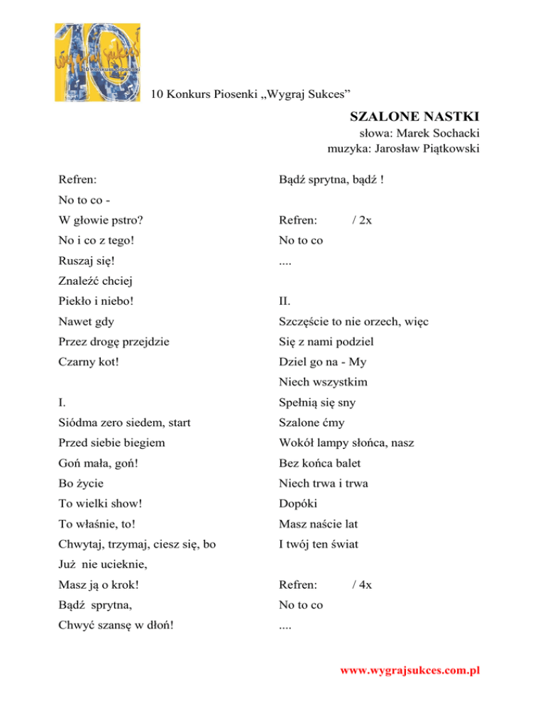 10 Konkurs Piosenki „Wygraj Sukces” SZALONE NASTKI słowa: Marek Sochacki muzyka: Jarosław Piątkowski Refren: Bądź sprytna, bądź ! No to co W głowie pstro? Refren: No i co z tego! No to co Ruszaj się! .... / 2x Znaleźć chciej Piekło i niebo! II. Nawet gdy Szczęście to nie orzech, więc Przez drogę przejdzie Się z nami podziel Czarny kot! Dziel go na - My Niech wszystkim I. Spełnią się sny Siódma zero siedem, start Szalone ćmy Przed siebie biegiem Wokół lampy słońca, nasz Goń mała, goń! Bez końca balet Bo życie Niech trwa i trwa To wielki show! Dopóki To właśnie, to! Masz naście lat Chwytaj, trzymaj, ciesz się, bo I twój ten świat Już nie ucieknie, Masz ją o krok! Refren: Bądź sprytna, No to co Chwyć szansę w dłoń! .... / 4x www.wygrajsukces.com.pl
