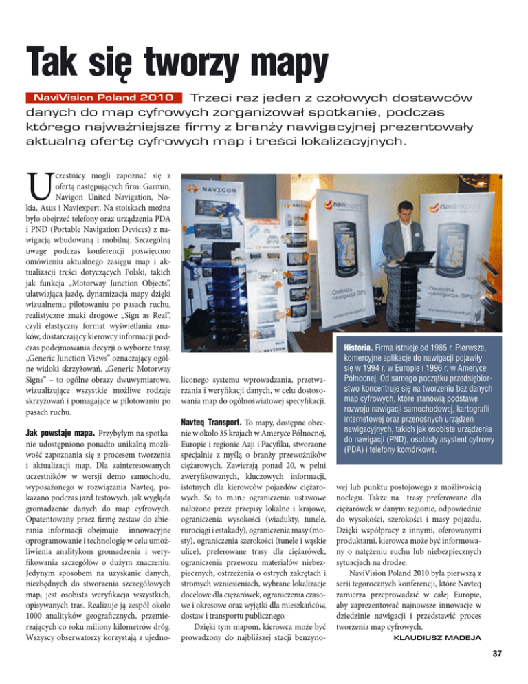 Tak się tworzy mapy NaviVision Poland 2010 Trzeci raz jeden z czołowych dostawców danych do map cyfrowych zorganizował spotkanie, podczas którego najważniejsze firmy z branży nawigacyjnej prezentowały aktualną ofertę cyfrowych map i treści lokalizacyjnych. U czestnicy mogli zapoznać się z ofertą następujących firm: Garmin, Navigon United Navigation, Nokia, Asus i Naviexpert. Na stoiskach można było obejrzeć telefony oraz urządzenia PDA i PND (Portable Navigation Devices) z nawigacją wbudowaną i mobilną. Szczególną uwagę podczas konferencji poświęcono omówieniu aktualnego zasięgu map i aktualizacji treści dotyczących Polski, takich jak funkcja „Motorway Junction Objects”, ułatwiająca jazdę, dynamizacja mapy dzięki wizualnemu pilotowaniu po pasach ruchu, realistyczne znaki drogowe „Sign as Real”, czyli elastyczny format wyświetlania znaków, dostarczający kierowcy informacji podczas podejmowania decyzji o wyborze trasy, „Generic Junction Views” oznaczający ogólne widoki skrzyżowań, „Generic Motorway Signs” – to ogólne obrazy dwuwymiarowe, wizualizujące wszystkie możliwe rodzaje skrzyżowań i pomagające w pilotowaniu po pasach ruchu. Jak powstaje mapa. Przybyłym na spotkanie udostępniono ponadto unikalną możliwość zapoznania się z procesem tworzenia i aktualizacji map. Dla zainteresowanych uczestników w wersji demo samochodu, wyposażonego w rozwiązania Navteq, pokazano podczas jazd testowych, jak wygląda gromadzenie danych do map cyfrowych. Opatentowany przez firmę zestaw do zbierania informacji obejmuje innowacyjne oprogramowanie i technologię w celu umożliwienia analitykom gromadzenia i weryfikowania szczegółów o dużym znaczeniu. Jedynym sposobem na uzyskanie danych, niezbędnych do stworzenia szczegółowych map, jest osobista weryfikacja wszystkich, opisywanych tras. Realizuje ją zespół około 1000 analityków geograficznych, przemierzających co roku miliony kilometrów dróg. Wszyscy obserwatorzy korzystają z ujedno- liconego systemu wprowadzania, przetwarzania i weryfikacji danych, w celu dostosowania map do ogólnoświatowej specyfikacji. Navteq Transport. To mapy, dostępne obecnie w około 35 krajach w Ameryce Północnej, Europie i regionie Azji i Pacyfiku, stworzone specjalnie z myślą o branży przewoźników ciężarowych. Zawierają ponad 20, w pełni zweryfikowanych, kluczowych informacji, istotnych dla kierowców pojazdów ciężarowych. Są to m.in.: ograniczenia ustawowe nałożone przez przepisy lokalne i krajowe, ograniczenia wysokości (wiadukty, tunele, rurociągi i estakady), ograniczenia masy (mosty), ograniczenia szerokości (tunele i wąskie ulice), preferowane trasy dla ciężarówek, ograniczenia przewozu materiałów niebezpiecznych, ostrzeżenia o ostrych zakrętach i stromych wzniesieniach, wybrane lokalizacje docelowe dla ciężarówek, ograniczenia czasowe i okresowe oraz wyjątki dla mieszkańców, dostaw i transportu publicznego. Dzięki tym mapom, kierowca może być prowadzony do najbliższej stacji benzyno- Historia. Firma istnieje od 1985 r. Pierwsze, komercyjne aplikacje do nawigacji pojawiły się w 1994 r. w Europie i 1996 r. w Ameryce Północnej. Od samego początku przedsiębiorstwo koncentruje się na tworzeniu baz danych map cyfrowych, które stanowią podstawę rozwoju nawigacji samochodowej, kartografii internetowej oraz przenośnych urządzeń nawigacyjnych, takich jak osobiste urządzenia do nawigacji (PND), osobisty asystent cyfrowy (PDA) i telefony komórkowe. wej lub punktu postojowego z możliwością noclegu. Także na trasy preferowane dla ciężarówek w danym regionie, odpowiednie do wysokości, szerokości i masy pojazdu. Dzięki współpracy z innymi, oferowanymi produktami, kierowca może być informowany o natężeniu ruchu lub niebezpiecznych sytuacjach na drodze. NaviVision Poland 2010 była pierwszą z serii tegorocznych konferencji, które Navteq zamierza przeprowadzić w całej Europie, aby zaprezentować najnowsze innowacje w dziedzinie nawigacji i przedstawić proces tworzenia map cyfrowych. Klaudiusz Madeja 37