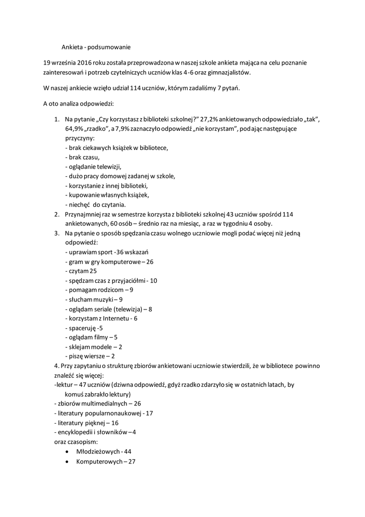 Ankieta - podsumowanie 19 września 2016 roku została przeprowadzona w naszej szkole ankieta mająca na celu poznanie zainteresowań i potrzeb czytelniczych uczniów klas 4-6 oraz gimnazjalistów. W naszej ankiecie wzięło udział 114 uczniów, którym zadaliśmy 7 pytań. A oto analiza odpowiedzi: 1. Na pytanie „Czy korzystasz z biblioteki szkolnej?” 27,2% ankietowanych odpowiedziało „tak”, 64,9% „rzadko”, a 7,9% zaznaczyło odpowiedź „nie korzystam”, podając następujące przyczyny: - brak ciekawych książek w bibliotece, - brak czasu, - oglądanie telewizji, - dużo pracy domowej zadanej w szkole, - korzystanie z innej biblioteki, - kupowanie własnych książek, - niechęć do czytania. 2. Przynajmniej raz w semestrze korzysta z biblioteki szkolnej 43 uczniów spośród 114 ankietowanych, 60 osób – średnio raz na miesiąc, a raz w tygodniu 4 osoby. 3. Na pytanie o sposób spędzania czasu wolnego uczniowie mogli podać więcej niż jedną odpowiedź: - uprawiam sport -36 wskazań - gram w gry komputerowe – 26 - czytam 25 - spędzam czas z przyjaciółmi - 10 - pomagam rodzicom – 9 - słucham muzyki – 9 - oglądam seriale (telewizja) – 8 - korzystam z Internetu - 6 - spaceruję -5 - oglądam filmy – 5 - sklejam modele – 2 - piszę wiersze – 2 4. Przy zapytaniu o strukturę zbiorów ankietowani uczniowie stwierdzili, że w bibliotece powinno znaleźć się więcej: -lektur – 47 uczniów (dziwna odpowiedź, gdyż rzadko zdarzyło się w ostatnich latach, by komuś zabrakło lektury) - zbiorów multimedialnych – 26 - literatury popularnonaukowej - 17 - literatury pięknej – 16 - encyklopedii i słowników – 4 oraz czasopism: Młodzieżowych - 44 Komputerowych – 27 Motoryzacyjnych -22 5. Uczniowie poproszeni zostali o zaproponowanie tytułów książek, które powinny znaleźć się w naszej bibliotece szkolnej, oto lista tytułów wg liczby wskazań (każdy mógł podać więcej niż jeden tytuł): Harry Potter (wszystkie tomy) – 17 50 twarzy Greya – 11 Dziennik cwaniaczka - 8 Wiedźmin – 7 Igrzyska śmierci – 5 Hobbit – 5 Trzy metry nad niebem (trzy części) - 5 Ania z Zielonego Wzgórza (wszystkie części) - 4 Niezgodna (seria) - 3 Ostatnia piosenka – 3 Opowieści z Narnii – 3 Komiksy (różne) – 2 Gwiazd naszych wina – 2 Papierowe miasta – 2 Love Rosie – 2 Zmierzch – 2 Girl online - 2 CR-7 Maszyna -2 Kod da Vinci – 2 Dary anioła -2 Władca pierścieni – 2 Przygody Mikołajka -2 After - 1 Lustrzane odbicie – 1 Siostry -1 Wichrowe Wzgórza – 1 Północ - Południe Książki Anny Todd -3 Książki Paulo Coelho - 2 Książki G. Musso - 2 Książki S. Kinga -1 6. Ankietowani poproszeni zostali o ocenę atmosfery panującej w bibliotece szkolnej w skali od 1 do 6 (1 ocena b. słaba, a 6 – ocena b. dobra). Odpowiedzi udzieliło 90 uczniów, a z ich odpowiedzi została wyliczona średnia, która wskazuje, iż atmosfera w bibliotece oceniana jest na 5,1. 7. W ostatnim pytaniu uczniowie wypowiedzieli się na temat czasu pracy biblioteki szkolnej odpowiadając na pytanie „Czy odpowiadają Ci godziny otwarcia biblioteki szkolnej?” Na 111 osób, które udzieliły odpowiedzi 103 zaznaczyły „TAK”, a tylko 8 „NIE”. Można więc uznać, że czas pracy biblioteki szkolnej jest dostosowany do potrzeb uczniów.
