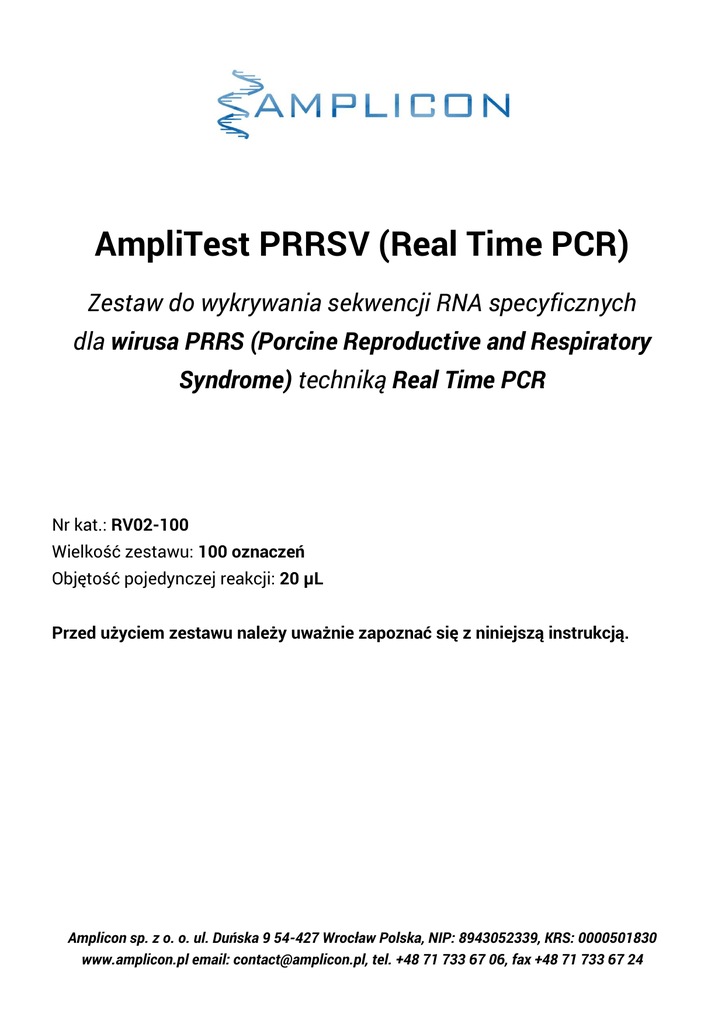 AmpliTest PRRSV (Real Time PCR) Zestaw do wykrywania sekwencji RNA specyficznych dla wirusa PRRS (Porcine Reproductive and Respiratory Syndrome) techniką Real Time PCR Nr kat.: RV02-100 Wielkość zestawu: 100 oznaczeń Objętość pojedynczej reakcji: 20 µL Przed użyciem zestawu należy uważnie zapoznać się z niniejszą instrukcją. Amplicon sp. z o. o. ul. Duńska 9 54-427 Wrocław Polska, NIP: 8943052339, KRS: 0000501830 www.amplicon.pl email: [email protected], tel. +48 71 733 67 06, fax +48 71 733 67 24 ZASTOSOWANIE Zestaw AmpliTest PRRSV (Real Time PCR) jest przeznaczony do wykrywania sekwencji RNA specyficznych dla wirusa PRRS (Porcine Reproductive and Respiratory Syndrome) w próbkach RNA uzyskanych od zwierząt. Materiałem wyjściowym do izolacji RNA może być krew lub inne płyny ustrojowe. W przypadku padłych zwierząt można pobrać próbki narządów wewnętrznych (płuca, migdałki, węzły chłonne i wątroba). W celu uniknięcia problemów z wydajnością reakcji Real Time PCR próbki RNA powinny być uzyskane przy użyciu metod pozwalających uzyskać wysokiej jakości RNA pozbawiony inhibitorów reakcji PCR. Zalecane są zestawy do izolacji RNA oparte o złoża krzemionkowe (tzw. zestawy kolumienkowe). ZAKRES STOSOWANIA Diagnostyka weterynaryjna in vitro Badania i rozwój (B+R) SKŁADNIKI ZESTAWU Nazwa Opis RM Mieszanina reakcyjna PC Kontrola pozytywna NC Kontrola negatywna RT Odwrotna transkryptaza Rin Inhibitor RNAz Woda Woda wolna od nukleaz Ilość 4 × 275 µL 4 × 50 µL 4 × 50 µL 1 × 20 µL 1 × 40 µL 2 × 500 µL Kolor wieczka Zielony Czerwony Niebieski Czarny Żółty Biały TRANSPORT i PRZECHOWYWANIE Transport odbywa się w suchym lodzie. Po otrzymaniu przesyłki należy ją natychmiast rozpakować. Składniki testu przechowywać -20°C; UNIKAĆ EKSPOZYCJI SKŁADNIKA RM NA ŚWIATŁO; Unikać wielokrotnego zamrażania i rozmrażania składników testu, w szczególności składnika RM. Trzy cykle zamrożenia i rozmrożenia składnika RM nie wpływa znacząco na jakość wyników. WSKAZÓWKA: na etykietach probówek zawierających składnik RM znajdują się pola, w których można zaznaczać ilość rozmrożeń danej porcji. Składniki RM oraz PC zawierają RNA – należy je chronić przed działaniem rybonukleaz. Nie używać składników testu po upływie daty przydatności do użycia. 2 ZASADA DZIAŁANIA Wirus PRRS jest wirusem typu RNA należącym do rodziny Arteriviridae. Do jego detekcji metodą Real Time PCR konieczny jest proces odwrotnej transkrypcji polegający na syntezie cząsteczek cDNA na podstawie RNA. Zestaw AmpliTest PRRSV (Real Time PCR) jest zestawem typu one-step. Dzięki temu procesy odwrotnej transkrypcji i amplifikacji sekwencji specyficznych dla wirusa PRRS zachodzą w jednej probówce. Zestaw AmpliTest PRRSV (Real Time PCR) zawiera startery umożliwiające namnożenie sekwencji charakterystycznych dla wirusa PRRS. Detekcja obecności wirusowych sekwencji następuje dzięki specyficznej sondzie typu TaqMan®, która przyłączając się do powstającego amplikonu (powielanego fragmentu DNA wirusa) ulega hydrolizie. Podczas hydrolizy z sondy jest uwalniany barwnik fluorescencyjny FAM, który następnie jest wykrywany przez układ optyczny aparatu do Real Time PCR. Odpowiednio dobrane sekwencje starterów i sondy zapewniają wysoką czułość i specyficzność reakcji. W celu zwiększenia wiarygodności wyników Zestaw AmpliTest PRRSV (Real Time PCR) zawiera kontrolę wewnętrzną (egzogenny fragment RNA) oraz układ starterów i sondy do jej amplifikacji i detekcji. Detekcja kontroli wewnętrznej odbywa się dzięki uwalnianiu przez sondę barwnika fluorescencyjnego HEX. Obecność kontroli wewnętrznej pozwala na monitorowanie prawidłowego przebiegu odwrotnej transkrypcji i reakcji Real Time PCR. Amplifikacja kontroli wewnętrznej nie wpływa na wydajność wykrywania sekwencji specyficznych dla wirusa PRRS. Pozytywny wynik kontroli wewnętrznej stanowi potwierdzenie prawidłowego przebiegu odwrotnej transkrypcji i reakcji Real Time PCR. 3 POTRZEBNY SPRZĘT I DODATKOWE MATERIAŁY Aparat do Real Time PCR: LightCycler 480 (Roche) LightCycler 96 (Roche) LightCycler 2.0 (Roche) RotorGene 3000/6000 (Qiagen) Inne urządzenia umożliwiające detekcję barwników fluorescencyjnych FAM i HEX. Zestaw AmpliTest PRRSV (Real Time PCR) nie zawiera barwnika normalizacyjnego ROX. W przypadku urządzeń wymagających takiej normalizacji należy do mieszaniny reakcyjnej dodać barwnik ROX do odpowiedniego stężenia. Barwnik ROX nie jest dołączony do zestawu. Probówki reakcyjne (próbówki PCR, płytki PCR, kapilary w zależności od posiadanego urządzenia do Real Time PCR) Wirówka do probówek reakcyjnych Wirówka stołowa Pipety automatyczne w zakresie 1-1000 µL Sterylne końcówki z filtrami do pipet automatycznych Zestaw do izolacji RNA W zależności od użytego zestawu do izolacji RNA może być potrzeby dodatkowy sprzęt i materiały. IZOLACJA RNA Z uzyskanego materiału (krew lub inne płyny ustrojowe, fragmenty narządów wewnętrznych) należy wyizolować RNA. Ilość potrzebnego materiału biologicznego zależy od użytej metody izolacji RNA. Ze względu na dużą podatność RNA na degradację czas pomiędzy pobraniem materiału biologicznego a izolacją RNA powinien być jak najkrótszy. Do chwili izolacji RNA uzyskany materiał biologiczny powinien być odpowiednio zabezpieczony (przechowywany w -20°C, ewentualnie w +4°C, najlepiej w środowisku hamującym aktywność nukleaz, np. w obecności EDTA). Niewłaściwe przechowywanie pobranego materiału biologicznego może skutkować degradacją RNA, co będzie prowadzić do uzyskania wyników fałszywie negatywnych. Do izolacji RNA zaleca się stosowanie zestawów opartych o złoża krzemionkowe (tzw. zestawów kolumienkowych), gdyż zapewniają one uzyskanie próbek RNA o 4 odpowiedniej jakości pozbawionych inhibitorów reakcji PCR. W przypadku innych metod izolacji pre