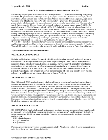 15 października 2011 Reading RAPORT z działalności szkoły w roku szkolnym 2010/2011 Rok szkolny rozpoczął się 11 września 2010 z liczbą uczniów 232 pod kierownictwem p. Małgorzaty Niedbało . Do grona nauczycielskiego doszła p. Krystyna Jarosińska ,Weronika Kowalczyk , Beata Niewitecka ,Beata Domian oraz Piotr Kopyciński. Odeszli natomiast Ireneusz Majewski, Agnieszka Gardzioła oraz Magdalena Mącior. W roku szkolnym 10/11 pracowało 15 nauczycieli ,dwóch pracowników administracyjnych( kierownik szkoły oraz asystentka kierownika) oraz 3 instruktorów. W szkole funkcjonowało 18 grup klasowych na dwóch zmianach w sobotę :rannej (godz. 9.00-12.15) i popołudniowej( 12.30-15.45) oraz w piątek 16.00-19.15. Szkoła korzystała z 4 sal oraz kancelarii w Domu Polskim 81 London Road oraz z jednej Sali w Domu Polskim 83 London Road ,z Sali parafialnej a także z salek przy kościele. Istnieją regularne klasy ,w których uczniowie uczą się j. polskiego i historii według takiego programu jak dzieci w Polsce w codziennych szkołach. Materiał jest jednak traktowany wybiórczo z oczywistego powodu, jakim jest ograniczenie czasowe. Są też dwie klasy w których odbywa się nauczanie j. polskiego jako obcego. Oprócz tego szkoła przygotowuje uczniów do egzaminów angielskich z j. polskiego tj. do GCSE oraz AS oraz A LEVEL. W roku 10/11 powstały 3 kółka zainteresowań: kółko taneczne (18 osób) prowadzone przez pierwszą część roku przez p. Beatę Niewitecką a potem przez p. Beatę Domian, warsztaty teatralne (16 osób) p. Weroniki Kowalczyk oraz treningi piłki nożnej (18 osób) pod okiem trenera p. Piotra Kopycińskiego. Wydarzenia w których uczestniczyła szkoła: WIZYTA PA)A FOTOGRAFA Dnia 16 października 2010 p. Tomasz Rydelski -profesjonalny fotograf, uwiecznił uczniów naszej szkoły na fotografiach klasowych oraz indywidualnych. Pan Tomasz zaproponował rodzicom kupno standardowego, klasowego zdjęcia, indywidualnych portretów oraz teczki zawierającej portret dziecka – właściciela oraz małe portretówki z imionami jego kolegów i koleżanek z klasy wraz z nauczycielem. Prawie wszyscy rodzice dokonali zamówień na pamiątkowe zdjęcia. Pan fotograf ofiarował panoramiczne zdjęcia całej szkoły, które można zobaczyć w gablocie na korytarzu szkolnym w Domu Polskim. A)DRZEJKI SZKOL)E Dnia 20 listopada 2010 uczniowie naszej szkoły mieli okazję uczestniczyć w zabawie andrzejkowej. Impreza ta była podzielona na dwie grupy wiekowe. Kadra nauczycielska pełniła rolę wróżek oraz czarodziejów, którzy wróżyli z kart, kolorów, kwiatów, gwiazd, magicznych worków, serduszek. Nie zabrakło również „lania wosku”, „numerologii” oraz „wędrówki butów” . Andrzejki uatrakcyjniło „malowanie twarzy” przez profesjonalistki. Dzięki hojności naszych rodziców mogliśmy urządzić loterię, która dała mnóstwo radości naszym dzieciom. Rodzice zorganizowali również bufet z kawą, herbatą oraz wyśmienitymi wypiekami własnej roboty. Tradycyjnie pojawił się też sklepik szkolny ze słodyczami oraz zimnymi napojami. Impreza rozpoczęła się od konkursów, gier i zabaw, a skończyła się dyskoteką dla klas starszych. Suma jaką zebraliśmy z biletów, loterii, sprzedaży ciast oraz ze sklepikuwynosi £295.80.. Dziękuję wszytkim za wszelkie wsparcie. AKCJA ZBIERA)IA PUSZEK OD 12 CZERWCA Przed szkołą został umieszczony specjalny kosz, do którego można wrzucać puszki po napojach i piwach. Rodzice wspieracjący inicjatywę „kolekcjonuja ” puszki przez cały tydzień i w sobotę dostarczają ich jak najwięcej do szkoły. Potem są one sprzedawane.Tej akcji przyświecają poniższe cele: 1. Edukacja ekologiczna 2. Korzyść finansowa. 3. Cel społeczny. Pomysłodawczynią inicjatywy jest uczennica naszej szkoły, Alex Rollin z klasy A Level która patronuje całej akcji. Do tej pory zebraliśmy około £30. UROCZYSTOŚCI BOŻO)ARODZE)IOWE Dnia 4 grudnia 2010 w sali parafialnej odbyły się uroczystości Bożonarodzeniowe zorganizowane przez społeczność szkolną. O godz. 9.15 uczniowie od lat 3 do lat 8 wystawili tradycyjne jasełka, przedstawiające historię narodzenia Pana Jezusa. W drugiej części uroczystości o godz. 11.30 po raz pierwszy w historii szkoły grupa młodzieży z naszego nowoutworzonego szkolnego kółka teatralnego pod okiem p. Weroniki Kowalczyk wystawiła sztukę K. Dickensa pt. „Opowieść Wigilijna”. Wstępem oraz komentarzami zajęli się uczniowie od lat 9 do 15 lat.. W obu częściach naszego spotkania towarzyszył nam Św. Mikołaj, który po przedstawieniach wręczał dzieciom i nauczycielom prezenty. WYCIECZKA DO LO)DY)U Dnia 5 grudnia o godz. 14.00 wyruszył autokar z 87 osobami z naszej szkoły do Klubu Orła Białego w Londynie, gdzie na jego scenie dzieci miały okazję obejrzeć „Bajkę o Czerwonym Kapturku”. Był to bardzo pogodny i dowcipny spektakl w którym uczestniczyli nawet nasi mali widzowie. Po około godzinnym spektaklu aktorzy przebrani za Św. Mikołaja oraz Śnieżynkę zaprosili młodszą część publiczności na scenę, gdzie odbyły się konkursy i zabawy z nagrodami. W konkursie tanecznym dwie pary z naszej szkoły zajęły pierwsze miejsce. Wszystkie dzieci zebrały ogromne brawa i gratulacje. Po konkursach cała publiczność mogła wstać z krzeseł i połączeni w jeden długi pociąg na czele ze Św. Mikołajem |”podróżowała ” po sali, śpiewając „Jedzie pociąg z daleka”. Tańce, śpiewy i zabawy zakończyły się lubianymi i znanymi przez wszystkich „Kaczuchami”. Uczniowie mieli okazje spotkać się z inną formą teatru, zobaczyli, że to nie musi być tylko bierne oglądanie sztuki, ale także bycie niejako w jej środku, a w połączeniu z konkursami i tańcami może stworzyć doskonałą zabawę. Wycieczka przebiegła bez problemów, dzieci wróciły do domu rozbawione i zadowolone, a towarzystwo Św. Mikołaja i Śnieżynki wp