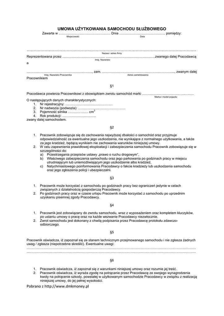 Wzór umowy użytkowania samochodu przez