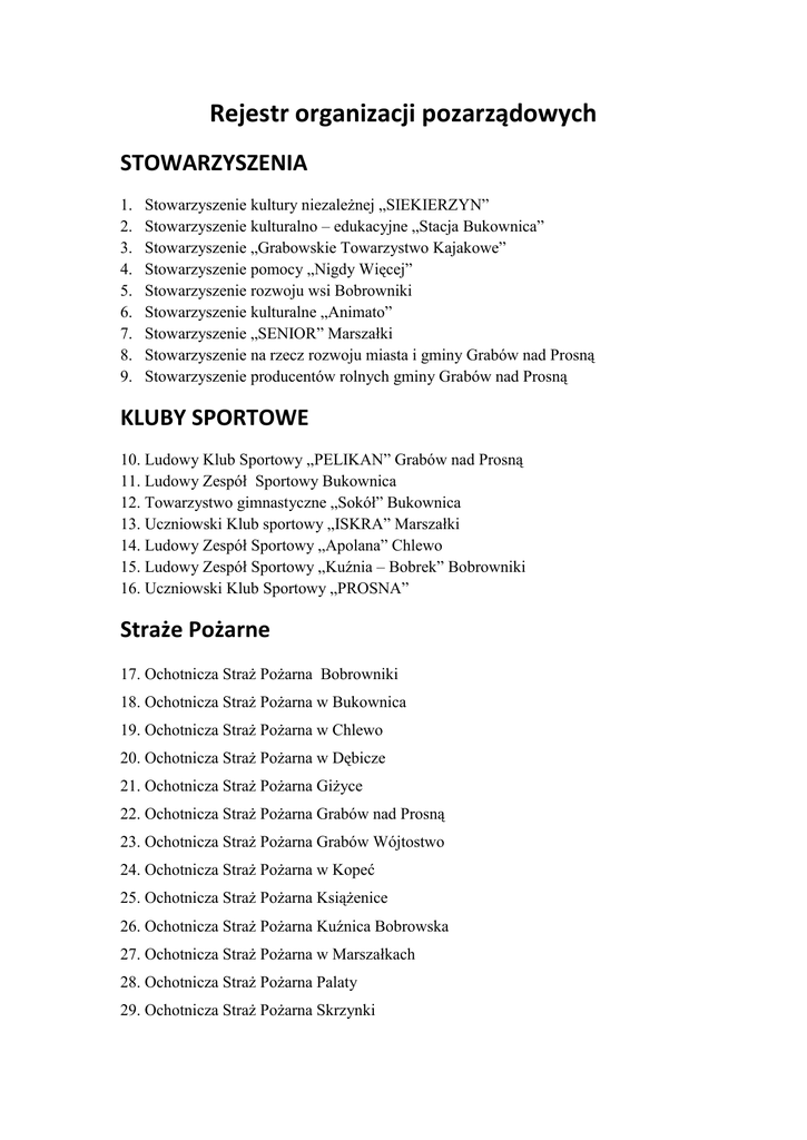 Rejestr organizacji pozarządowych STOWARZYSZENIA 1. 2. 3. 4. 5. 6. 7. 8. 9. Stowarzyszenie kultury niezależnej „SIEKIERZYN” Stowarzyszenie kulturalno – edukacyjne „Stacja Bukownica” Stowarzyszenie „Grabowskie Towarzystwo Kajakowe” Stowarzyszenie pomocy „Nigdy Więcej” Stowarzyszenie rozwoju wsi Bobrowniki Stowarzyszenie kulturalne „Animato” Stowarzyszenie „SENIOR” Marszałki Stowarzyszenie na rzecz rozwoju miasta i gminy Grabów nad Prosną Stowarzyszenie producentów rolnych gminy Grabów nad Prosną KLUBY SPORTOWE 10. Ludowy Klub Sportowy „PELIKAN” Grabów nad Prosną 11. Ludowy Zespół Sportowy Bukownica 12. Towarzystwo gimnastyczne „Sokół” Bukownica 13. Uczniowski Klub sportowy „ISKRA” Marszałki 14. Ludowy Zespół Sportowy „Apolana” Chlewo 15. Ludowy Zespół Sportowy „Kuźnia – Bobrek” Bobrowniki 16. Uczniowski Klub Sportowy „PROSNA” Straże Pożarne 17. Ochotnicza Straż Pożarna Bobrowniki 18. Ochotnicza Straż Pożarna w Bukownica 19. Ochotnicza Straż Pożarna w Chlewo 20. Ochotnicza Straż Pożarna w Dębicze 21. Ochotnicza Straż Pożarna Giżyce 22. Ochotnicza Straż Pożarna Grabów nad Prosną 23. Ochotnicza Straż Pożarna Grabów Wójtostwo 24. Ochotnicza Straż Pożarna w Kopeć 25. Ochotnicza Straż Pożarna Książenice 26. Ochotnicza Straż Pożarna Kuźnica Bobrowska 27. Ochotnicza Straż Pożarna w Marszałkach 28. Ochotnicza Straż Pożarna Palaty 29. Ochotnicza Straż Pożarna Skrzynki PARAFIE 30. Parafia Rzymskokatolicka pw Św. Filipa i Jakuba Bukownica 31. Parafia Rzymskokatolicka pw Św. Marcina Chlewo 32. Rzymskokatolicka Parafia pw Chrystusa Króla Księża Salezjanie Marszałki 33. Rzymskokatolicka Parafia pw Niepokalanego Serca Maryi i Św. Mikołaja w Grabowie nad Prosną 34. Rzymskokatolicka Parafia pw Przemienienia Paoskiego w Giżycach POZOSTAŁE ORGANIZACJE POZARZĄDOWE 35. Polski Związek Kombatantów 36. Związek Emerytów i Rencistów w Grabowie nad Prosną 37. Cech Rzemiosł Różnych, Małej i Średniej Przedsiębiorczości i Pracodawców