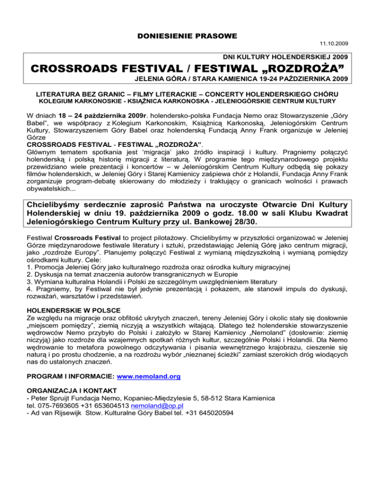 DONIESIENIE PRASOWE 11.10.2009 DNI KULTURY HOLENDERSKIEJ 2009 CROSSROADS FESTIVAL / FESTIWAL „ROZDROŻA” JELENIA GÓRA / STARA KAMIENICA 19-24 PAŹDZIERNIKA 2009 LITERATURA BEZ GRANIC – FILMY LITERACKIE – CONCERTY HOLENDERSKIEGO CHÓRU KOLEGIUM KARKONOSKIE - KSIĄŻNICA KARKONOSKA - JELENIOGÓRSKIE CENTRUM KULTURY W dniach 18 – 24 października 2009r. holendersko-polska Fundacja Nemo oraz Stowarzyszenie „Góry Babel”, we współpracy z Kolegium Karkonoskim, Książnicą Karkonoską, Jeleniogórskim Centrum Kultury, Stowarzyszeniem Góry Babel oraz holenderską Fundacją Anny Frank organizuje w Jeleniej Górze CROSSROADS FESTIVAL - FESTIWAL „ROZDROŻA”. Głównym tematem spotkania jest „migracja‟ jako źródło inspiracji i kultury. Pragniemy połączyć holenderską i polską historię migracji z literaturą. W programie tego międzynarodowego projektu przewidziano wiele prezentacji i koncertów – w Jeleniogórskim Centrum Kultury odbędą się pokazy filmów holenderskich, w Jeleniej Góry i Starej Kamienicy zaśpiewa chór z Holandii, Fundacja Anny Frank zorganizuje program-debatę skierowany do młodzieży i traktujący o granicach wolności i prawach obywatelskich... Chcielibyśmy serdecznie zaprosić Państwa na uroczyste Otwarcie Dni Kultury Holenderskiej w dniu 19. października 2009 o godz. 18.00 w sali Klubu Kwadrat Jeleniogórskiego Centrum Kultury przy ul. Bankowej 28/30. Festiwal Crossroads Festival to project pilotażowy. Chcielibyśmy w przyszłości organizować w Jeleniej Górze międzynarodowe festiwale literatury i sztuki, przedstawiając Jelenią Górę jako centrum migracji, jako „rozdroże Europy”. Planujemy połączyć Festiwal z wymianą międzyszkolną i wymianą pomiędzy ośrodkami kultury. Cele: 1. Promocja Jeleniej Góry jako kulturalnego rozdroża oraz ośrodka kultury migracyjnej 2. Dyskusja na temat znaczenia autorów transgranicznych w Europie 3. Wymiana kulturalna Holandii i Polski ze szczególnym uwzględnieniem literatury 4. Pragniemy, by Festiwal nie był jedynie prezentacją i pokazem, ale stanowił impuls do dyskusji, rozważań, warsztatów i przedstawień. HOLENDERSKIE W POLSCE Ze względu na migracje oraz obfitość ukrytych znaczeń, tereny Jeleniej Góry i okolic stały się dosłownie „miejscem pomiędzy”, ziemią niczyją a wszystkich witającą. Dlatego też holenderskie stowarzyszenie wędrowców Nemo przybyło do Polski i założyło w Starej Kamienicy „Nemoland” (dosłownie: ziemię niczyją) jako rozdroże dla wzajemnych spotkań różnych kultur, szczególnie Polski i Holandii. Dla Nemo wędrowanie to metafora powolnego odczytywania i pisania wewnętrznego krajobrazu, cieszenie się naturą i po prostu chodzenie, a na rozdrożu wybór „nieznanej ścieżki” zamiast szerokich dróg wiodących nas do ustalonych znaczeń. PROGRAM I INFORMACIE: www.nemoland.org ORGANIZACJA I KONTAKT - Peter Spruijt Fundacja Nemo, Kopaniec-Międzylesie 5, 58-512 Stara Kamienica tel. 075-7693605 +31 653604513 [email protected] - Ad van Rijsewijk Stow. Kulturalne Góry Babel tel. +31 645020594 LITERATURA BEZ GRANIC Holenderscy pisarze transgraniczni YASMINE ALLAS (Somalia), VAMBA SHERIF (Liberia), RODAAN AL GALIDI (Irak) w rozmowach z polskimi pisarzami OLGĄ TOKARCZUK, NATASZĄ GOERKE, IGNACYM KARPOWICZEM o migracji i micie wprowadzenie Olgi Tokarczuk DLACZEGO MIGRACJA? Europę można określić jako rzeczywistość narodów, ustalonych nazw i granic. Jednak poza tą rzeczywistością istnieje jeszcze inna Europa, tworzona przez migrację; to ludzie poruszający się po rozdrożach, skrzyżowaniach, opowieścią i mitem nieustannie zmieniający przestrzeń i nazwy. Tworząc i żyjąc na rozdrożach, pisarze transgraniczni stykają się z rzeczywistością migracji i stawiają zasadnicze pytanie: „czyż wszyscy nie jesteśmy migrantami…?” LITERATURA NA ROZDROŻACH Festiwal dotyczy literatury transgranicznej i zadaje podstawowe pytania o stosunek autorów transgranicznych wobec migracji: 1. Jaki wpływ i oddziaływanie ma migracja na ich książki? 2. Co znaczy dla pisarza żyć i tworzyć między dwiema kulturami? 3. Czy literatura transgraniczna powinna odzwierciedlać osobiste życie pisarzy oraz rzeczywistość społecznopolityczną? 4. Jakie są reakcje pisarzy na problematykę migracji w Europie i zjawisko rosnącego wsparcia dla ruchów nacjonalistycznych i przeciwnych migracji? 5. Co łączy holenderską i polską tematykę migracji i ich literaturę transgraniczną? Sześciu pisarzy weźmie udział w dyskusji na Festiwalu „Rozdroża” w Jeleniej Górze. Będą czytać fragmenty swoich książek i odpowiadać na pytania słuchaczy. Festiwal to także możliwość spotkania z pisarzami z kraju, gdzie autorów-imigrantów jest bardzo niewielu. Zaproszeni pisarze odgrywają istotną rolę w publicznej debacie na temat migracji, praw mniejszości oraz funkcji literatury we współczesnym społeczeństwie. DLACZEGO JELENIA GÓRA? JELENIA GÓRA – EUROPEJSKIE CENTRUM MIGRACJI! Polska Jelenia Góra (przed 1945 rokiem niemieckie Hirschberg) leżąca na Dolnym Śląsku (Euroregion Nysa/Neisse) przy granicy z Czechami i Niemcami, między Wrocławiem, Berlinem i Pragą, jest rozdrożem Europy. Tu, jak w oku cyklonu, cała europejska historia zawracała i zmieniała ludzi, nazwy i granice, z polskich na czeskie, austriackie, pruskie/niemieckie, a od 1945 roku ponownie na polskie, po przymusowych wysiedleniach w każdym kierunku, tworząc nieświadomą ziemię niczyją, czarny trójkąt. Miasto zawdzięcza swój szczególny urok połączeniu rzeczywistości migracyjnej z mitami i legendami pobliskich Karkonoszy i Gór Izerskich oraz inspiracją licznych osiadłych tu pionierów, artystów i pisarzy. W Holandii migracja wiąże się z rzeczywistością różnorodnych i kolorowych mniejszości, co prowadzi do gorzkich dyskusji na temat religii i integracji. W Polsce migracja jest kojarzona z losem i przeznaczeniem, wywo