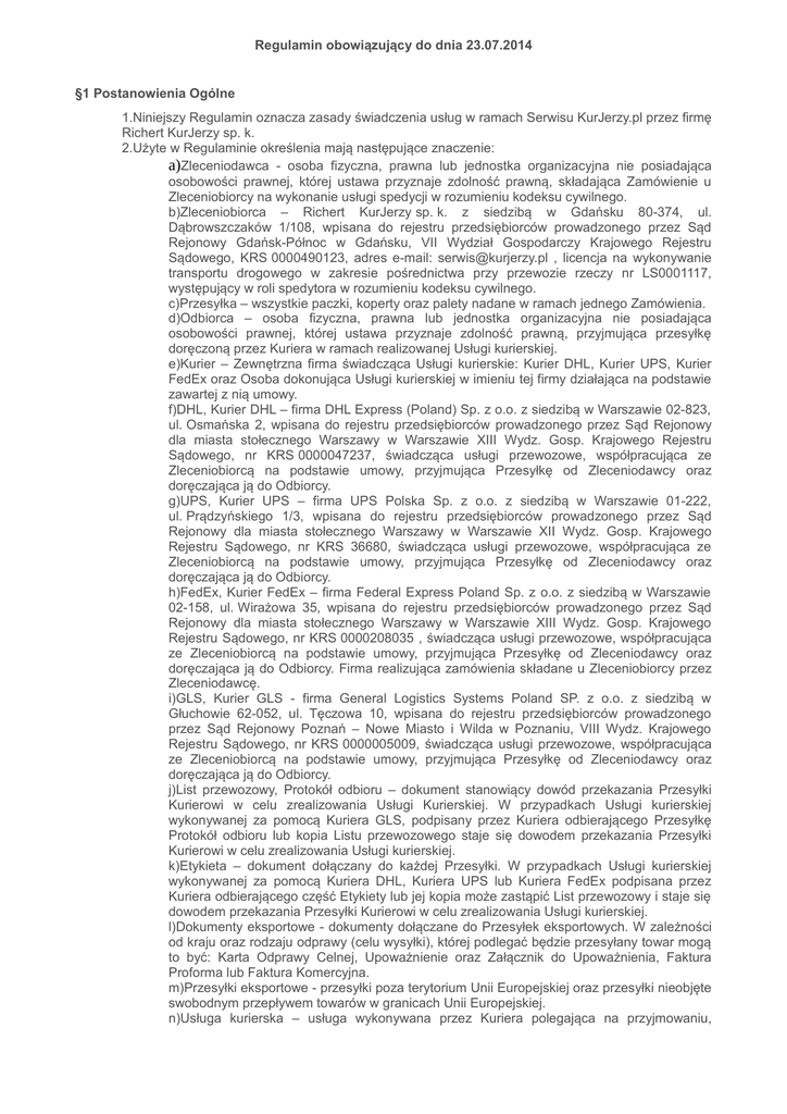 Regulamin obowiązujący do dnia 23.07.2014 §1 Postanowienia Ogólne 1.Niniejszy Regulamin oznacza zasady świadczenia usług w ramach Serwisu KurJerzy.pl przez firmę Richert KurJerzy sp. k. 2.Użyte w Regulaminie określenia mają następujące znaczenie: a)Zleceniodawca - osoba fizyczna, prawna lub jednostka organizacyjna nie posiadająca osobowości prawnej, której ustawa przyznaje zdolność prawną, składająca Zamówienie u Zleceniobiorcy na wykonanie usługi spedycji w rozumieniu kodeksu cywilnego. b)Zleceniobiorca – Richert KurJerzy sp. k. z siedzibą w Gdańsku 80-374, ul. Dąbrowszczaków 1/108, wpisana do rejestru przedsiębiorców prowadzonego przez Sąd Rejonowy Gdańsk-Północ w Gdańsku, VII Wydział Gospodarczy Krajowego Rejestru Sądowego, KRS 0000490123, adres e-mail: [email protected] , licencja na wykonywanie transportu drogowego w zakresie pośrednictwa przy przewozie rzeczy nr LS0001117, występujący w roli spedytora w rozumieniu kodeksu cywilnego. c)Przesyłka – wszystkie paczki, koperty oraz palety nadane w ramach jednego Zamówienia. d)Odbiorca – osoba fizyczna, prawna lub jednostka organizacyjna nie posiadająca osobowości prawnej, której ustawa przyznaje zdolność prawną, przyjmująca przesyłkę doręczoną przez Kuriera w ramach realizowanej Usługi kurierskiej. e)Kurier – Zewnętrzna firma świadcząca Usługi kurierskie: Kurier DHL, Kurier UPS, Kurier FedEx oraz Osoba dokonująca Usługi kurierskiej w imieniu tej firmy działająca na podstawie zawartej z nią umowy. f)DHL, Kurier DHL – firma DHL Express (Poland) Sp. z o.o. z siedzibą w Warszawie 02-823, ul. Osmańska 2, wpisana do rejestru przedsiębiorców prowadzonego przez Sąd Rejonowy dla miasta stołecznego Warszawy w Warszawie XIII Wydz. Gosp. Krajowego Rejestru Sądowego, nr KRS 0000047237, świadcząca usługi przewozowe, współpracująca ze Zleceniobiorcą na podstawie umowy, przyjmująca Przesyłkę od Zleceniodawcy oraz doręczająca ją do Odbiorcy. g)UPS, Kurier UPS – firma UPS Polska Sp. z o.o. z siedzibą w Warszawie 01-222, ul. Prądzyńskiego 1/3, wpisana do rejestru przedsiębiorców prowadzonego przez Sąd Rejonowy dla miasta stołecznego Warszawy w Warszawie XII Wydz. Gosp. Krajowego Rejestru Sądowego, nr KRS 36680, świadcząca usługi przewozowe, współpracująca ze Zleceniobiorcą na podstawie umowy, przyjmująca Przesyłkę od Zleceniodawcy oraz doręczająca ją do Odbiorcy. h)FedEx, Kurier FedEx – firma Federal Express Poland Sp. z o.o. z siedzibą w Warszawie 02-158, ul. Wirażowa 35, wpisana do rejestru przedsiębiorców prowadzonego przez Sąd Rejonowy dla miasta stołecznego Warszawy w Warszawie XIII Wydz. Gosp. Krajowego Rejestru Sądowego, nr KRS 0000208035 , świadcząca usługi przewozowe, współpracująca ze Zleceniobiorcą na podstawie umowy, przyjmująca Przesyłkę od Zleceniodawcy oraz doręczająca ją do Odbiorcy. Firma realizująca zamówienia składane u Zleceniobiorcy przez Zleceniodawcę. i)GLS, Kurier GLS - firma General Logistics Systems Poland SP. z o.o. z siedzibą w Głuchowie 62-052, ul. Tęczowa 10, wpisana do rejestru przedsiębiorców prowadzonego przez Sąd Rejonowy Poznań – Nowe Miasto i Wilda w Poznaniu, VIII Wydz. Krajowego Rejestru Sądowego, nr KRS 0000005009, świadcząca usługi przewozowe, współpracująca ze Zleceniobiorcą na podstawie umowy, przyjmująca Przesyłkę od Zleceniodawcy oraz doręczająca ją do Odbiorcy. j)List przewozowy, Protokół odbioru – dokument stanowiący dowód przekazania Przesyłki Kurierowi w celu zrealizowania Usługi Kurierskiej. W przypadkach Usługi kurierskiej wykonywanej za pomocą Kuriera GLS, podpisany przez Kuriera odbierającego Przesyłkę Protokół odbioru lub kopia Listu przewozowego staje się dowodem przekazania Przesyłki Kurierowi w celu zrealizowania Usługi kurierskiej. k)Etykieta – dokument dołączany do każdej Przesyłki. W przypadkach Usługi kurierskiej wykonywanej za pomocą Kuriera DHL, Kuriera UPS lub Kuriera FedEx podpisana przez Kuriera odbierającego część Etykiety lub jej kopia może zastąpić List przewozowy i staje się dowodem przekazania Przesyłki Kurierowi w celu zrealizowania Usługi kurierskiej. l)Dokumenty eksportowe - dokumenty dołączane do Przesyłek eksportowych. W zależności od kraju oraz rodzaju odprawy (celu wysyłki), której podlegać będzie przesyłany towar mogą to być: Karta Odprawy Celnej, Upoważnienie oraz Załącznik do Upoważnienia, Faktura Proforma lub Faktura Komercyjna. m)Przesyłki eksportowe - przesyłki poza terytorium Unii Europejskiej oraz przesyłki nieobjęte swobodnym przepływem towarów w granicach Unii Europejskiej. n)Usługa kurierska – usługa wykonywana przez Kuriera polegająca na przyjmowaniu, przemieszczaniu i doręczaniu Przesyłek. o)Serwis, Serwis KurJerzy.pl – Serwis Internetowy dostępny pod adresem https://www.kurjerzy.pl wraz z jego funkcjonalnością. p)Cennik – aktualna oferta cenowa umieszczona na stronie internetowej Serwisu KurJerzy.pl, a w szczególności w Cenniku serwisu KurJerzy.pl, o którym mowa w § 1 ust. 3 lit i, określająca wagę i gabaryty Przesyłek oraz terminy, w jakich mogą one zostać zrealizowane. q)Cennik detaliczny danego Kuriera – Cennik detaliczny Kuriera DHL, o którym mowa w § 1 ust. 3 lit b lub też Cennik detaliczny Kuriera UPS, o którym mowa w § 1 ust. 3 lit d lub też Cennik detaliczny Kuriera FedEx, o którym mowa w § 1 ust. 3 lit f lub też Cennik detaliczny Kuriera GLS, o którym mowa w § 1 ust. 3 lit h w zależności od tego który z Kurierów wykonuje Usługę Kurierską. r)Dni robocze - nie obejmują sobót, niedziel, a także dni ustawowo wolnych od pracy chyba, że ustalono inaczej. s)PrePaid – usługa oferowana Zleceniodawcy, polegająca na możliwości dokonania przedpłaty i zgromadzenia środków na Koncie PrePaid w celu ich późniejszego wykorzystania w Serwisie. t)Konto PrePaid - przypisane danemu Zleceniodawcy konto, 