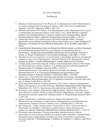 Dr Anna Stępniak Publikacje 1. Влияние личной переписки Р. М. Рильке, Б. Л. Пастернака и М. И. Цветаевой на их жизнь и творчество (на примере «Писем 1926 года») [w:] „Славiстичнi записки”, № 4 (8), Тернопiль 2008, s. 105-116, 2. Влияние переписки Р.М. Рильке, Б.Л. Пастернака и М.И. Цветаевой на их жизнь и творчество (на примере «Писем 1926 года»), [w:] „Świat Słowian w języku i kulturze. IX Literaturoznawstwo” pod red. naukową Ewy Komorowskiej, Żanety Kozickiej-Borysowskiej i Agnieszki Krzanowskiej, Szczecin 2008, s. 136-141, 3. Noblowska lekcja, czyli ciemna strona Literackiej Nagrody Nobla w Związku Radzieckim na przykładzie kandydatury Borysa Pasternaka, [w:] „Vade Nobiscum II”, Materiały z II Łódzkiej Wiosny Młodych Historyków 20-22 III 2009, Łódź 2009, s. 89-93, 4. Liebesbrief als literarisches Genre am Beispiel des Briefwechsels von Boris Pasternak, (List miłosny jako gatunek literacki na przykładzie korespondencji Borysa Pasternaka), „Nachwuchswissenschaftler präsentieren ihre Forschung” pod red. A. Wardy, Z. Weigt, Wydawnictwo Uniwersytetu Łódzkiego, Łódź 2009, s. 79-85. 5. Функции писем и их значение в исследованиях о биографии писателя (на примере избранных писем Б.Л. Пастернака к Зинаиде Нейгауз и М. Цветаевой), artykuł przyjęty do druku w „Studia Methodologica”, piśmie naukowym na Ukrainie; 6. Ciemna strona Literackiej Nagrody Nobla w świetle kandydatury Borysa Pasternaka, [w:] Świat Słowian w języku i kulturze. T. X Kulturoznawstwo pod red. naukową E. Komorowskiej i D. Dziadosz, Szczecin 2009, s. 212-217. 7. Jak kochają Rosjanie? Listy miłosne Borysa Pasternaka, [w:] Studia Słowianoznawcze. T. 8, Uniwersytet Humanistyczno-przyrodniczy Jana Kochanowskiego w Kielcach, Piotrków Trybunalski 2009, s. 249-260. 8. Stylistyczne wyznaczniki listu miłosnego jako gatunku literackiego (na przykładzie korespondencji Borysa Pasternaka), [w:] Z zagadnień semantyki i stylistyki tekstu pod red. A. Ginter, Łódź 2010, s. 193-199. 9. Души начинают видеть. Судьба переписки 1922-1936 гг. Марины Цветаевой и Бориса Пастернака, [w:] Vade Nobiscum. Materiały Studenckiego Koła Naukowego Historyków UŁ, Vol. IV, Niesamowita Słowiańszczyzna, Łódź 2010, s. 241-246. 10. W niewoli czasu i miłości. Wspomnienia Olgi Iwińskiej o Borysie Pasternaku, [w:] Świat Słowian w Języku i Kulturze, tom XI Wybrane Zagadnienia z Literatur i Kultur Słowiańskich, pod red. naukową E. Komorowskiej i A. Krzanowskiej, Szczecin 2010, s. 165-170. 11. Диалог стилистик в любовной переписке Бориса Пастернака, [w:] Филологические традиции в современном литературном и лингвистическом образовании. Сборник научных статей, Том 1, Москва 2011, s. 158-165. 12. Być żoną poety – zyskać nieśmiertelność. Rola kobiet w życiu i twórczości Borysa Pasternaka, [w:] Kobiety w literaturze i społeczeństwie. Ujęcie feministycznogenderowe, pod red. Walentyny Jakimiuk-Sawczyńskiej, Białystok 2012, s. 129-137. 13. Wyrażanie niewyrażalnego. O językowym kodzie miłosnych przeżyć Borysa Pasternaka, [w:] Teoretyczne i praktyczne aspekty badań semantyki i stylistyki tekstu (Теоретические и прикладные аспекты изучения семантики и стилистики текста), pod red. J. Wierzbińskiego, T. Daibera, G. Gocheva i I. Zlateva, Łódź 2012, s. 67-75. 1 14. Rozdarty między czasem i wiecznością. Życie z Borysem Pasternakiem na podstawie wspomnień i listów Olgi Iwińskiej, [w:] Studia Słowianoznawcze, T. 10, Uniwersytet Jana Kochanowskiego w Kielcach, Piotrków Trybunalski 2013, s. 207-228. 2