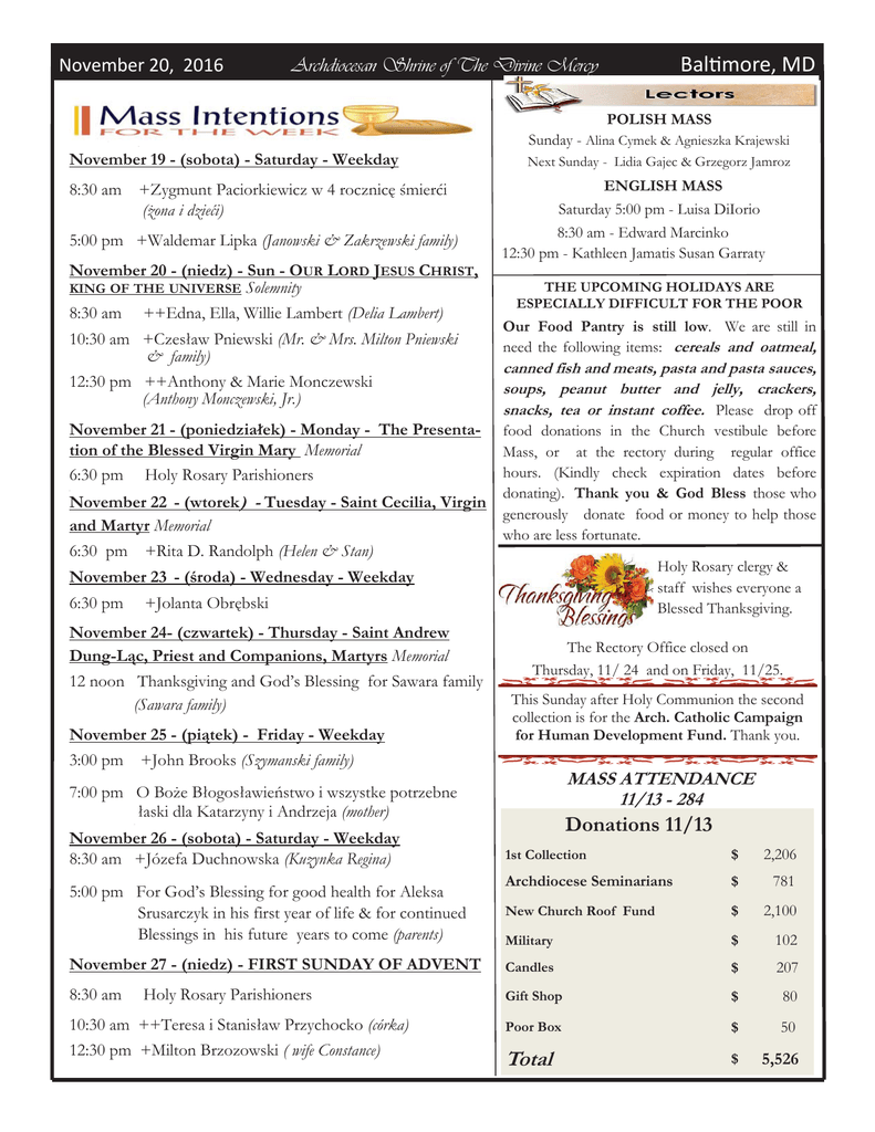 November 20, 2016 Archdiocesan Shrine of The Divine Mercy Bal more, MD POLISH MASS Sunday - Alina Cymek & Agnieszka Krajewski + ++ November 19 - (sobota) - Saturday - Weekday 8:30 am +Zygmunt Paciorkiewicz w 4 rocznicę śmierći (żona i dzieći) 5:00 pm +Waldemar Lipka (Janowski & Zakrzewski family) November 20 - (niedz) - Sun - OUR LORD JESUS CHRIST, KING OF THE UNIVERSE Solemnity 8:30 am ++Edna, Ella, Willie Lambert (Delia Lambert) 10:30 am +Czesław Pniewski (Mr. & Mrs. Milton Pniewski & family) 12:30 pm ++Anthony & Marie Monczewski (Anthony Monczewski, Jr.) November 21 - (poniedziałek) - Monday - The Presentation of the Blessed Virgin Mary Memorial 6:30 pm Holy Rosary Parishioners [[ November 22 - (wtorek) - Tuesday - Saint Cecilia, Virgin and Martyr Memorial 6:30 pm +Rita D. Randolph (Helen & Stan) Next Sunday - Lidia Gajec & Grzegorz Jamroz ENGLISH MASS Saturday 5:00 pm - Luisa DiIorio 8:30 am - Edward Marcinko 12:30 pm - Kathleen Jamatis Susan Garraty THE UPCOMING HOLIDAYS ARE ESPECIALLY DIFFICULT FOR THE POOR Our Food Pantry is still low. We are still in need the following items: cereals and oatmeal, canned fish and meats, pasta and pasta sauces, soups, peanut butter and jelly, crackers, snacks, tea or instant coffee. Please drop off food donations in the Church vestibule before Mass, or at the rectory during regular office hours. (Kindly check expiration dates before donating). Thank you & God Bless those who generously donate food or money to help those who are less fortunate. Holy Rosary clergy & staff wishes everyone a Blessed Thanksgiving. November 23 - (środa) - Wednesday - Weekday 6:30 pm +Jolanta Obrębski November 24- (czwartek) - Thursday - Saint Andrew Dung-Ląc, Priest and Companions, Martyrs Memorial 12 noon Thanksgiving and God’s Blessing for Sawara family (Sawara family) November 25 - (piątek) - Friday - Weekday 3:00 pm +John Brooks (Szymanski family) The Rectory Office closed on Thursday, 11/ 24 and on Friday, 11/25. This Sunday after Holy Communion the second collection is for the Arch. Catholic Campaign for Human Development Fund. Thank you. MASS ATTENDANCE 11/13 - 284 7:00 pm O Boże Błogosławieństwo i wszystke potrzebne łaski dla Katarzyny i Andrzeja (mother) Donations 11/13 ++ November 26 - (sobota) - Saturday - Weekday 8:30 am +Józefa Duchnowska (Kuzynka Regina) 1st Collection $ 2,206 Archdiocese Seminarians $ 781 New Church Roof Fund $ 2,100 Military $ 102 November 27 - (niedz) - FIRST SUNDAY OF ADVENT Candles $ 207 8:30 am Gift Shop $ 80 10:30 am ++Teresa i Stanisław Przychocko (córka) Poor Box $ 50 12:30 pm +Milton Brzozowski ( wife Constance) Total $ 5,526 5:00 pm For God’s Blessing for good health for Aleksa Srusarczyk in his first year of life & for continued Blessings in his future years to come (parents) Holy Rosary Parishioners November 20, 2016 Archdiocesan Shrine of The Divine Mercy Bal more, MD SACRED HEART OF MARY Thanksgiving Day Family POLKA MASS The 41st Thanksgiving Day Polka Mass at Sacred Heart of Mary will take place on Thursday, November 24th at 10:00 am. Please join us and give thanks for the many blessings in your life. The Hymns will be to a Polka beat and the music will be provided by TKO. Our celebrant will be Rev. George J. Gannon, Pastor. For more information, please call 410-633-2828. FLOWERS in the Divine Mercy Shrine were donated by Karina Kasztelnik. God’s Blessing. KWIATY dla Matki Bożej Nieustającej i pod krzyż ufundowaly Sabina Sobel i Maria Sawera. Bóg zapłać. FLOWERS for Our Lady of Perpetual Help & under the cross were donated by Sabina Sobel & Maria Sawera. God’s Blessing. Advent Day of Prayer AKADEMIA Z OKAZJI DNIA 11 LISTOPADA W tym roku Akademia z okazji 11 listopada odbędzie się po Mszy Św. o godz. 10:30 - w to niedziele 20 listopada. This year our parish and the Polish school will commemorate Polish Independence Day after the 10:30 am Mass on Sunday - November 20, 2016. 24th Holy Rosary Mass will be celebrated at 12 noon. ST CASIMIR CHURCH Never Home Alone Dinner on Thanksgiving Day from 11:30 am - 1:00 pm. 410-276-1981 Mission Helper Center 1001 W. Joppa Road Towson, MD (Chestnut Ave.) Saturday, December 3rd Presenter: Sr. Clare Walsh, MHSH Theme for the Day: FROM THE HEART OF GOD Sign-in and Coffee at 9:30 am. lunch provided Free will Offering Day ends with Liturgy for the weekend at 3:00 pm To register contact: Sr. Jane, 410-252-6020 or [email protected] or Mission Helpers of the Sacred Heart, 410-823-8585 Sacred Heart of Mary Christmas Bazaar On Sunday, December 4th Sacred Heart of Mary will hold their annual Christmas Bazaar from 11:304:00 at 6736 Youngstown Avenue, 21222. Bring the whole family and join us for Christmas music, crafts, games of chance, raffles, and pictures with Mr. & Mrs. Claus while enjoying traditional homemade Polish food and other snacks & sweets! All Souls’ Day Memorials Memorial envelopes are on the table in back of the church. Names will be read by the pastor during services. Please clearly PRINT the names of those who you wish to have memorialized and return with your donation. The envelopes will remain on the altar throughout the month of November. November 20, 2016 HANDEL Archdiocesan Shrine of The Divine Mercy Messiah Baltimore's only period style presentation of this baroque masterwork Order by phone at 667.206.4120. for a mail-in order form. 7:30 p.m. SATURDAY December 10 Grace United Methodist Church (Homeland) 5407 N Charles St, Baltimore, Maryland 21210 3 p.m. SUNDAY December 11 St Ignatius Catholic Church (Mt Vernon) 740 N Calvert St, Baltimore, Maryland 21202 Handel Choir and Handel Period Instrument Orchestra Bal more, MD Celebrate the music of Christmas while benefiting those in need this holiday season. CATHOLIC CHARITIES' CHRISTMAS FESTIVAL AT THE BASILICA OF THE ASSUMPTION December 15, 2016 7:30 - 9:00 PM 409 Cathedral St. Baltimore, MD 21201 Benefiting This year's Christmas Festival benefits Gallagher Services, a program of Catholic Chari